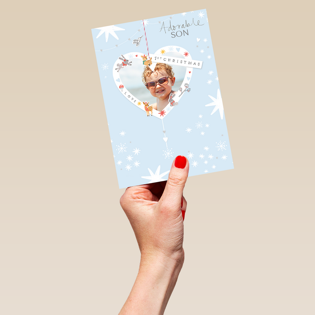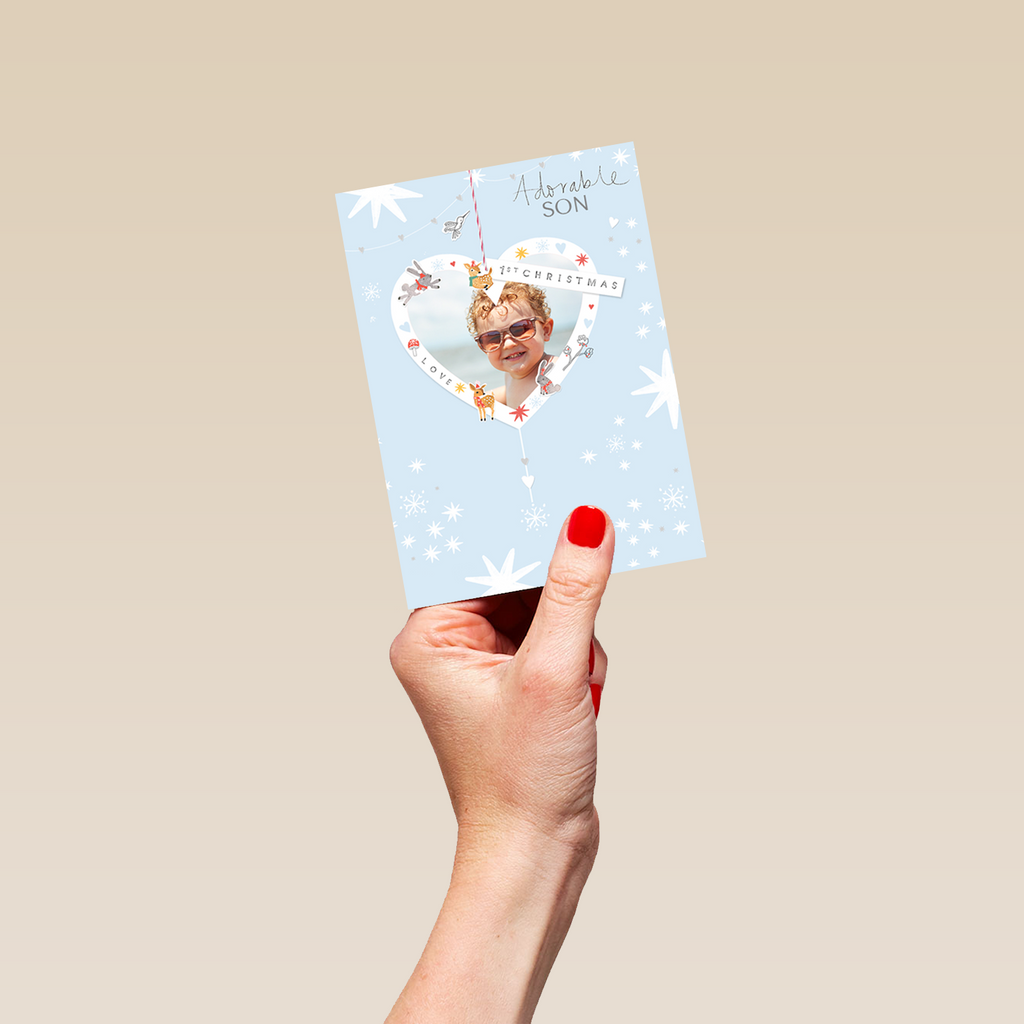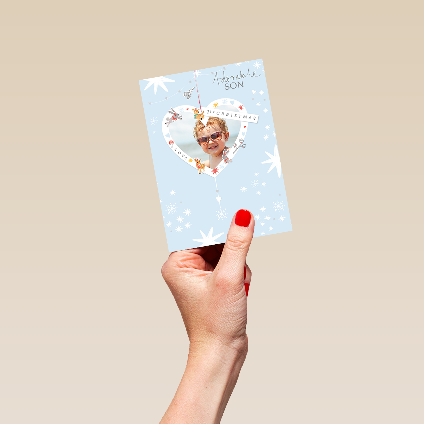 Show them you care with a personalised classic son's 1st Christmas editable photo card from Hallmark. Our greetings cards are printed on premium quality, FSC®-certified card & delivered nationwide. This card is available as standard 12cm by 16.7cm and large 15.5cm by 21.6cm.