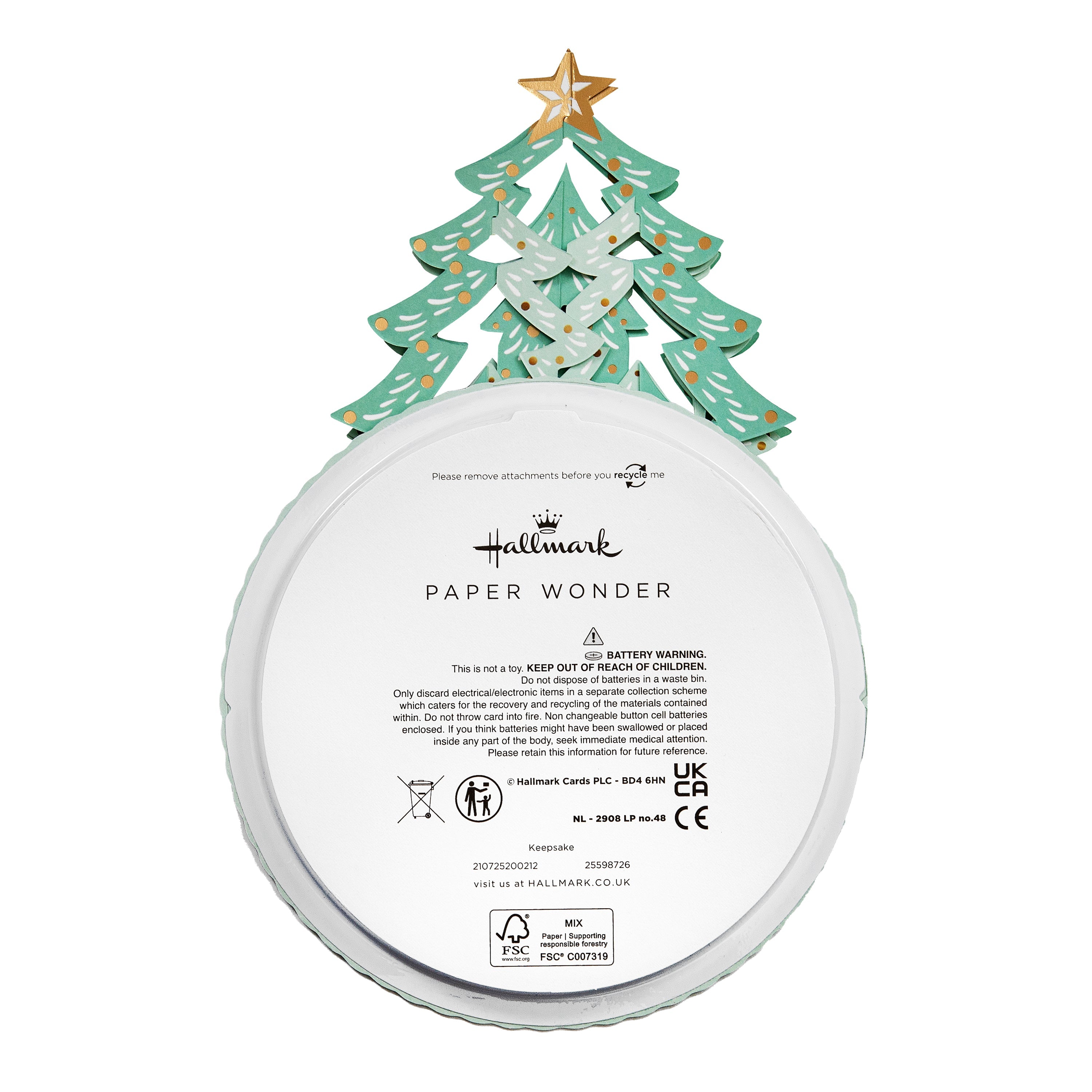 At the push of a button, the entire design rotates on the base to the accompaniment of an instrumental version of the festive classic, 'O' Christmas Tree', creating a unique festive display, and the card comes complete with a Hallmark branded, white envelope.