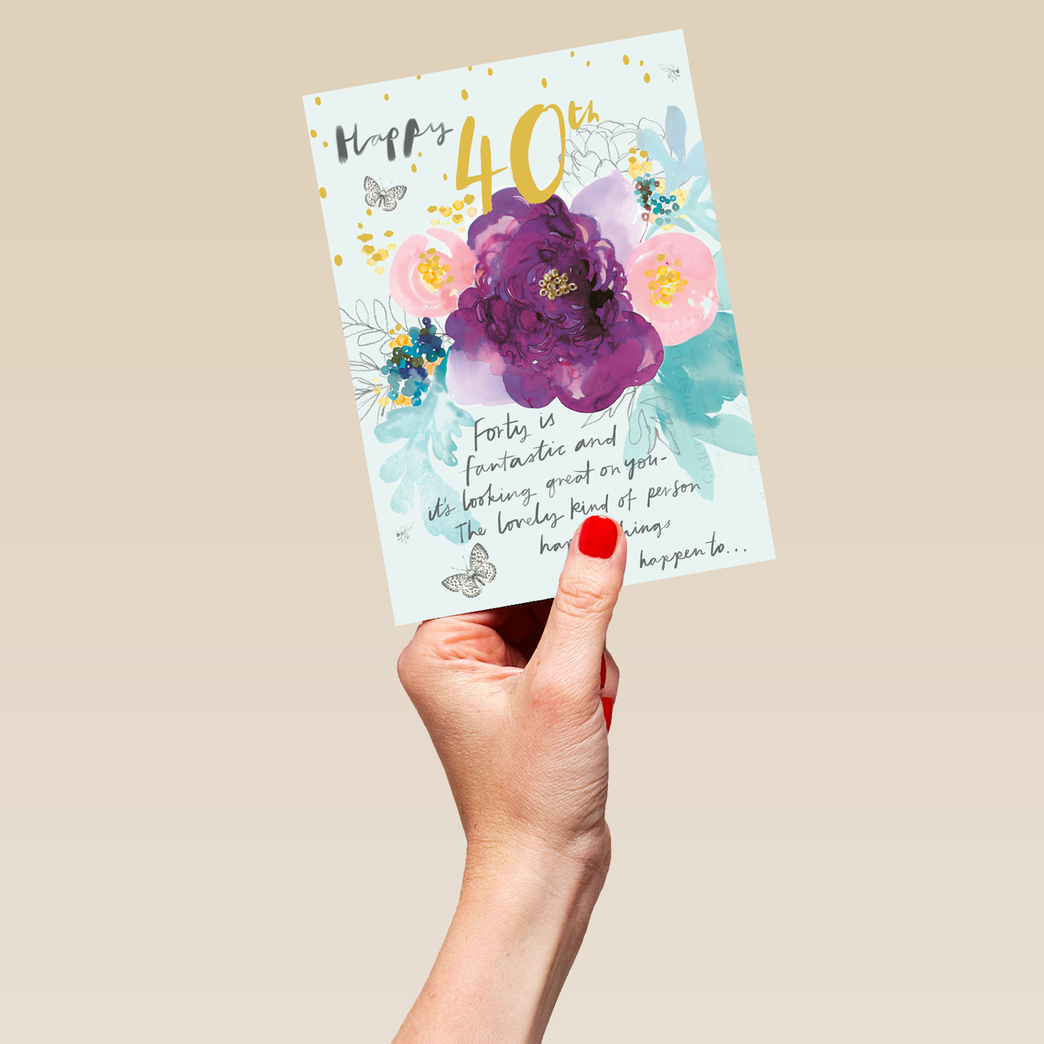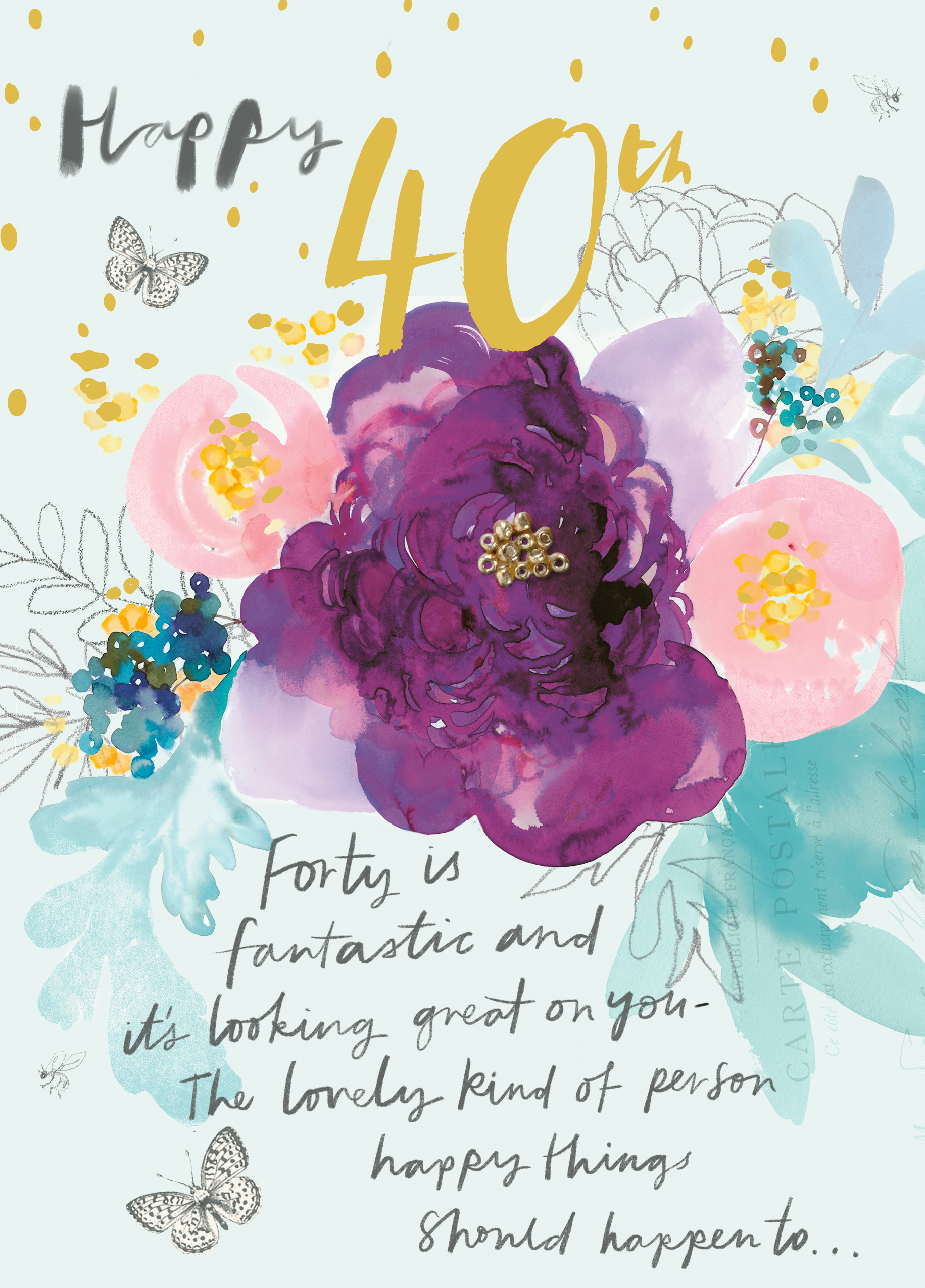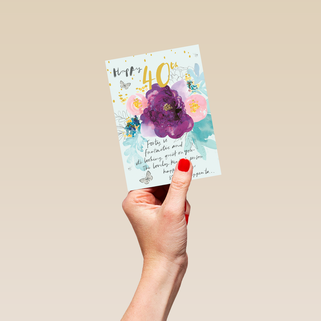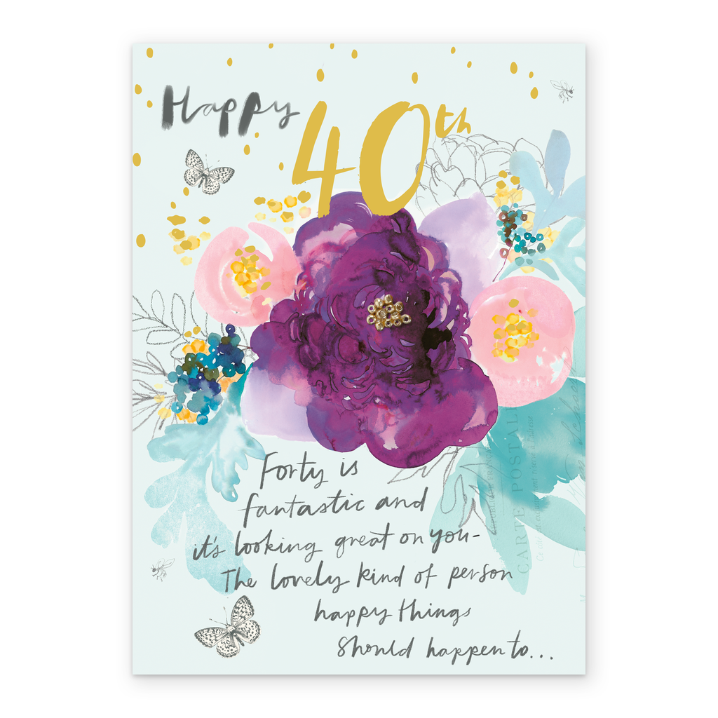 Printed on premium-quality board, this card features watercolour style florals, with the message 'Happy 40th. Forty is fantastic and it’s looking great on you. The lovely kind of person happy things should happen to…', and comes complete with a co-ordinating white envelope.