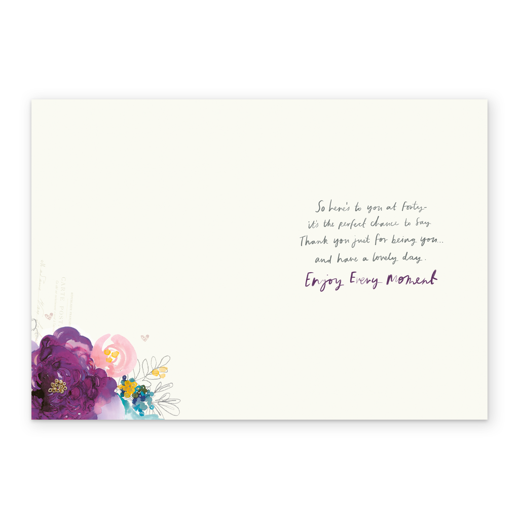 Message inside reads: So here’s to you at forty- it’s the perfect chance to say thank you just for being you… and have a lovely day. Enjoy every moment