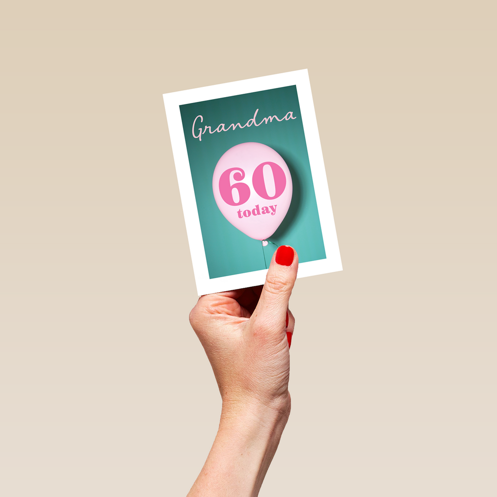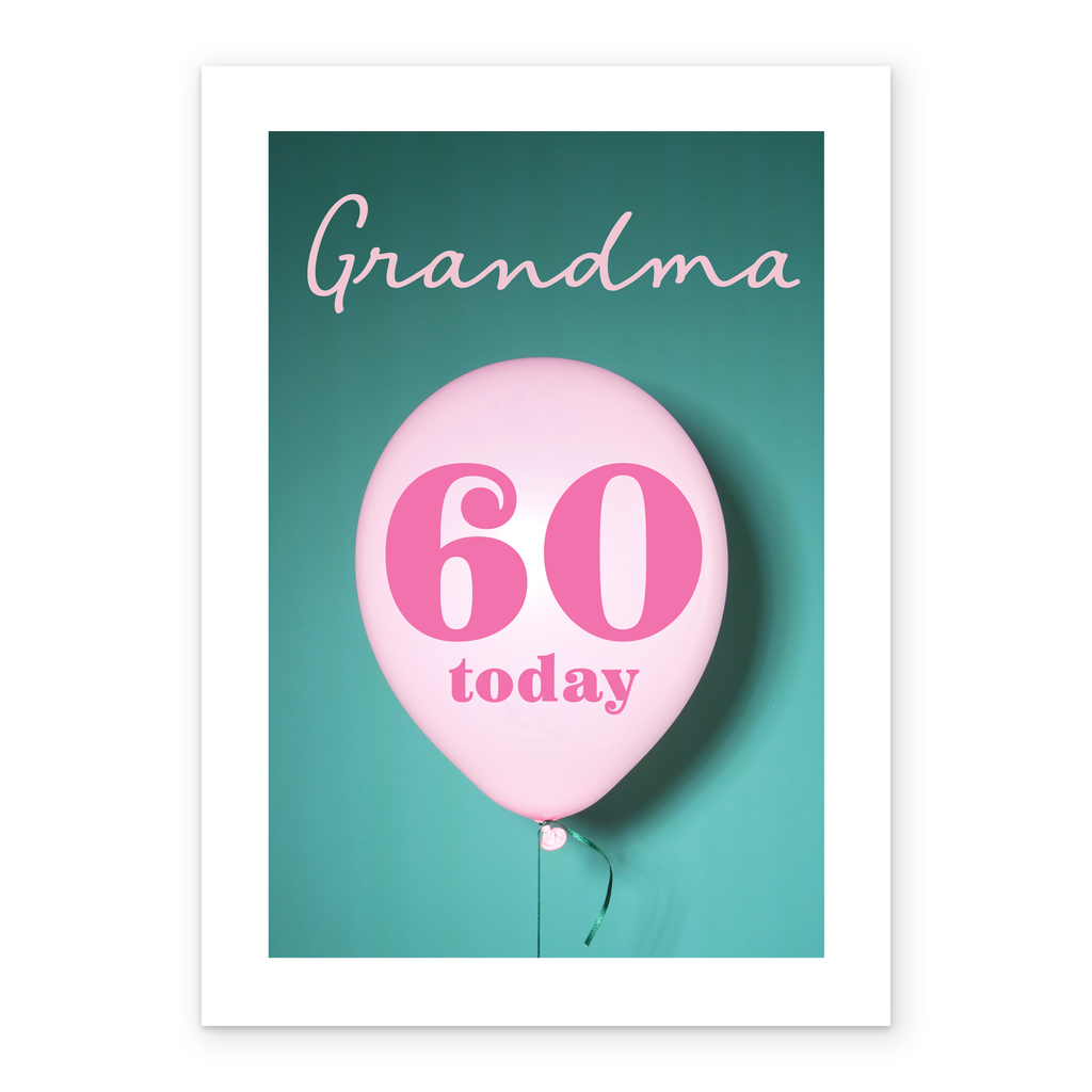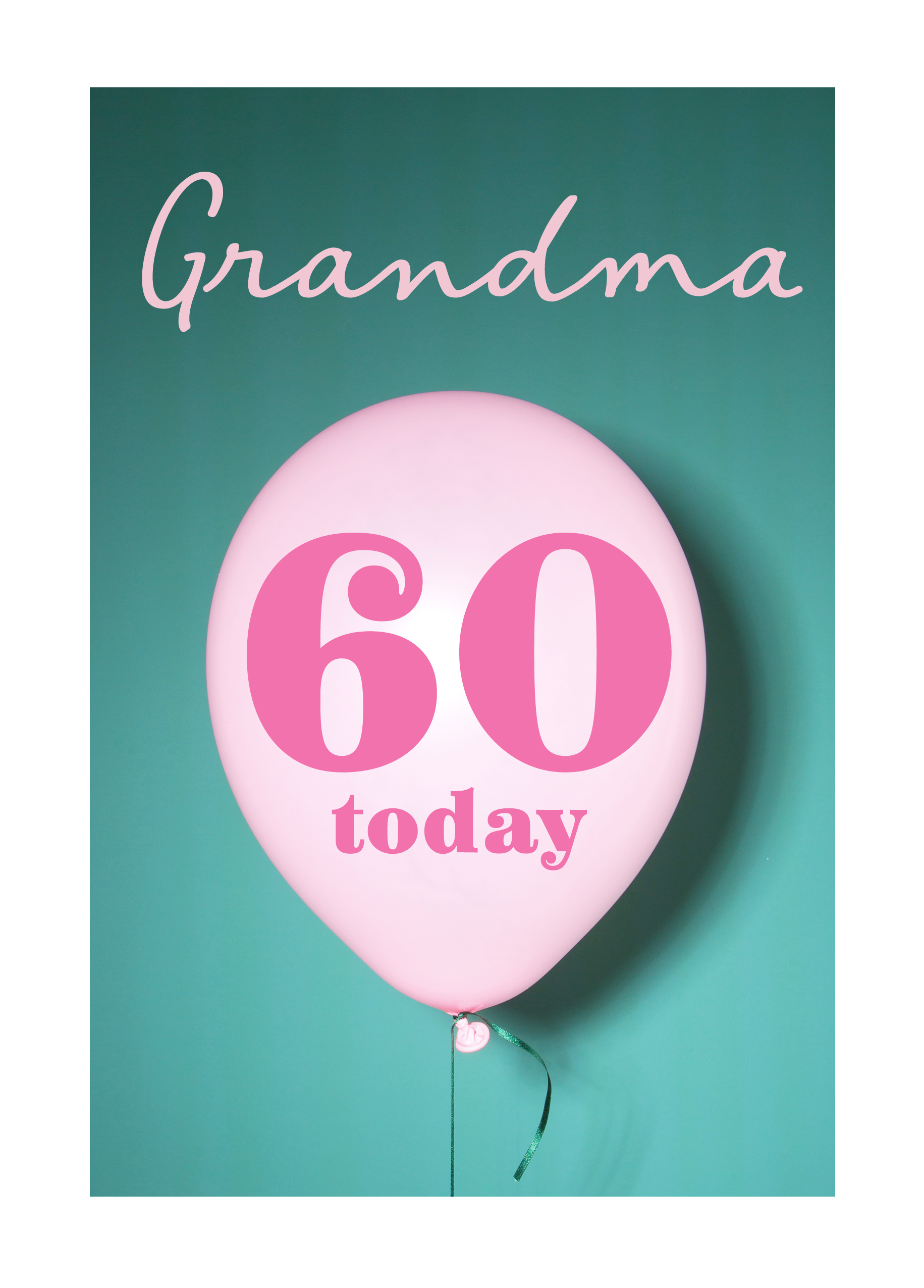 Printed on premium-quality board, this card features a floating 60th birthday balloon on a colourful background, with the message 'Grandma, 60 Today', space to personalise a name, and comes complete with a co-ordinating white envelope.