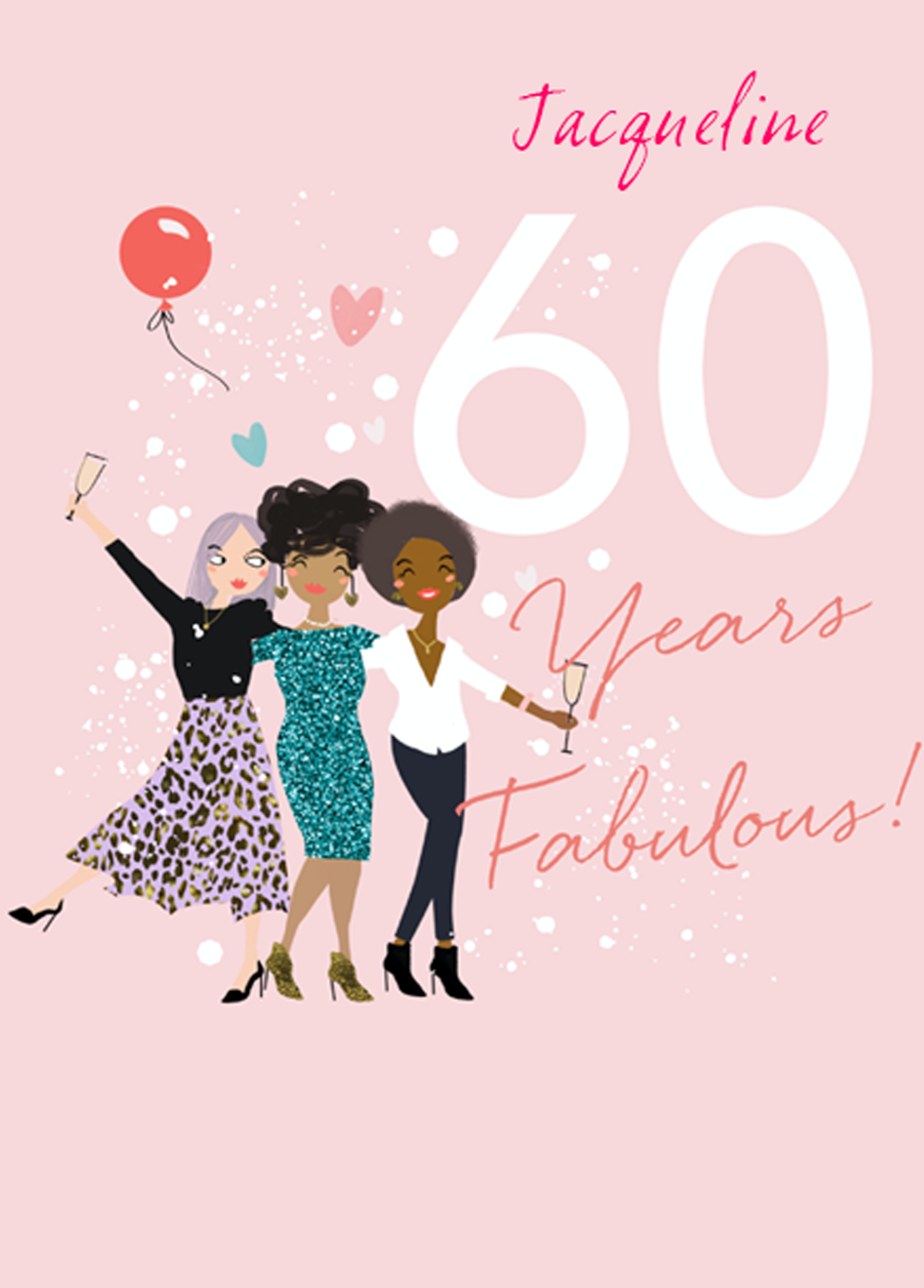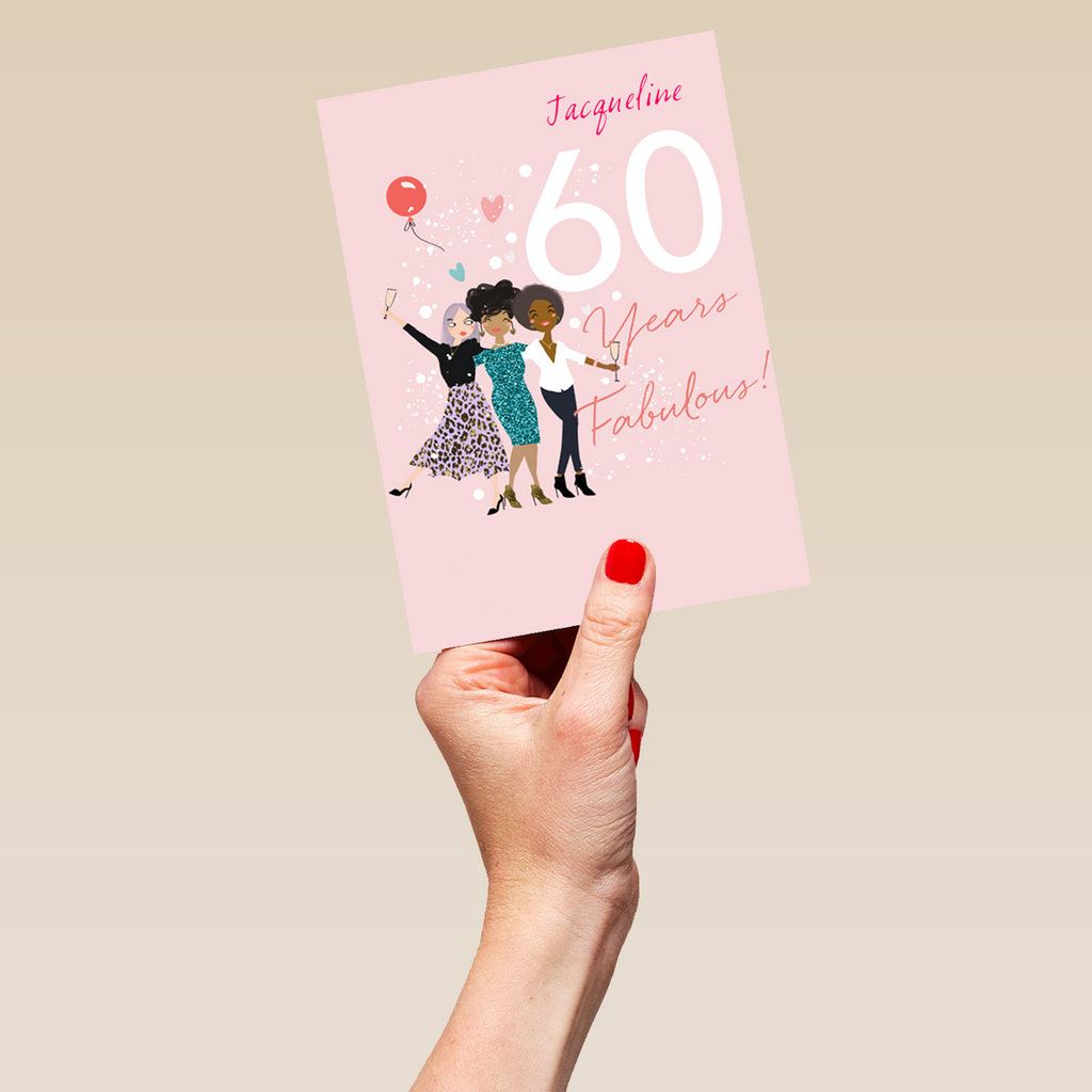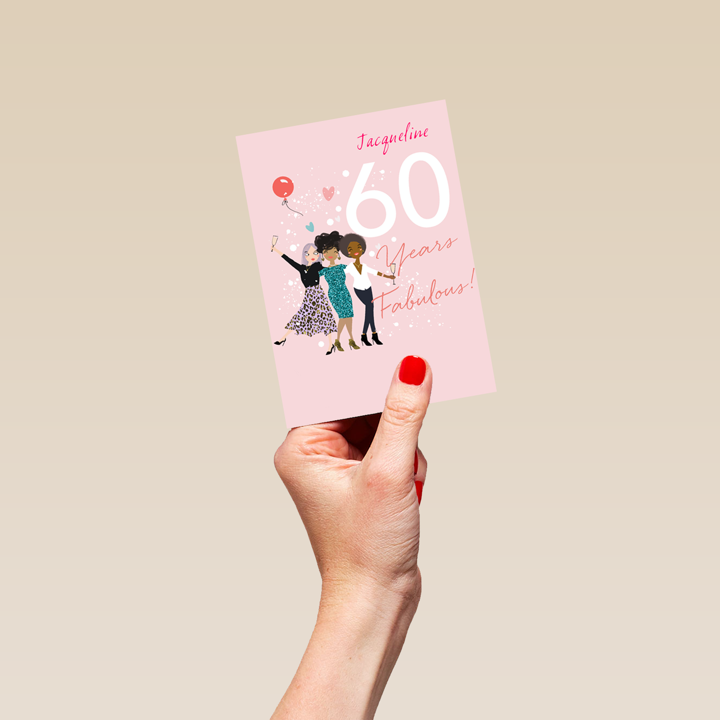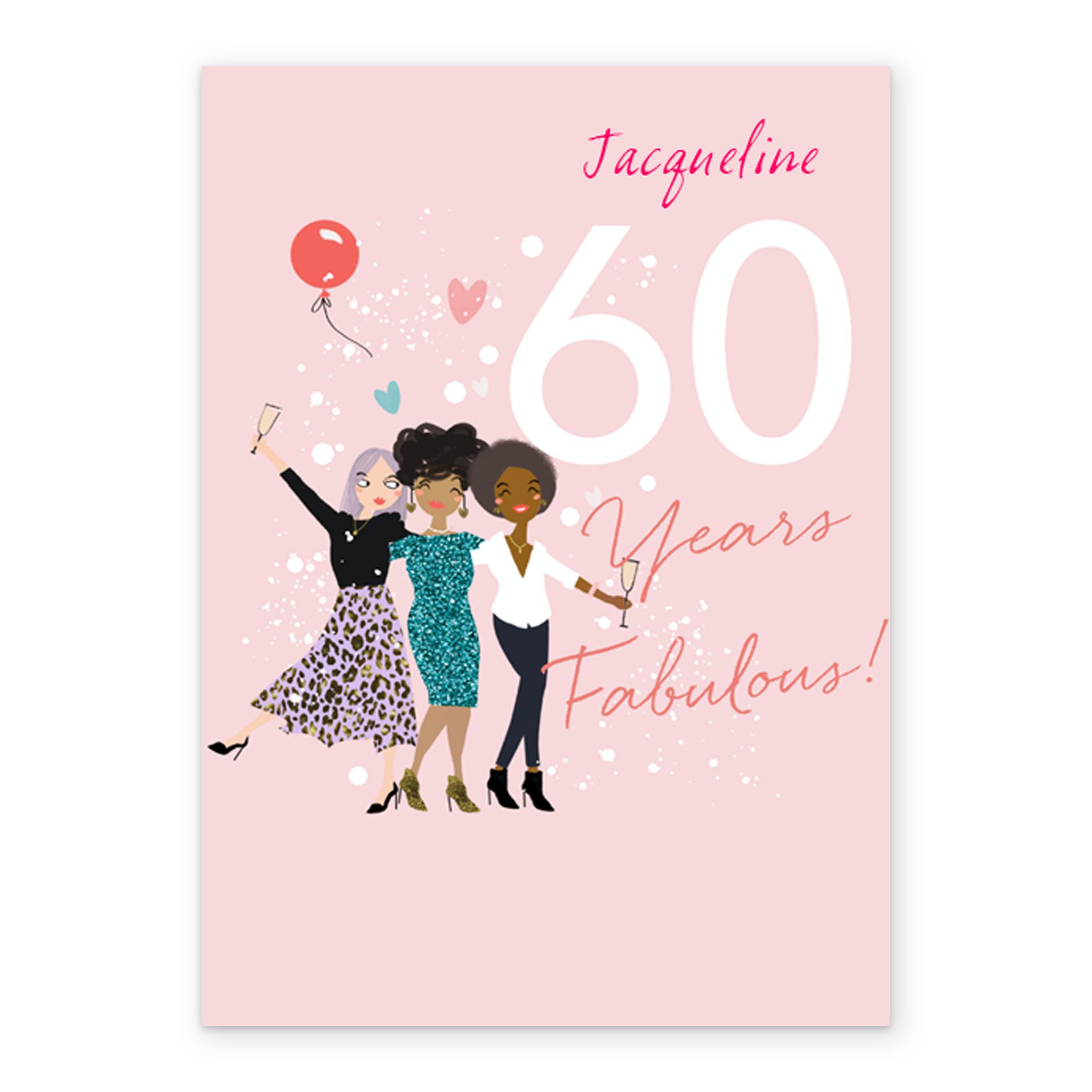 Printed on premium-quality board, this card features an illustration of 3 ladies holding champagne flutes, with the message '60 Years Fabulous!', space to personalise a name, and comes complete with a co-ordinating white envelope.