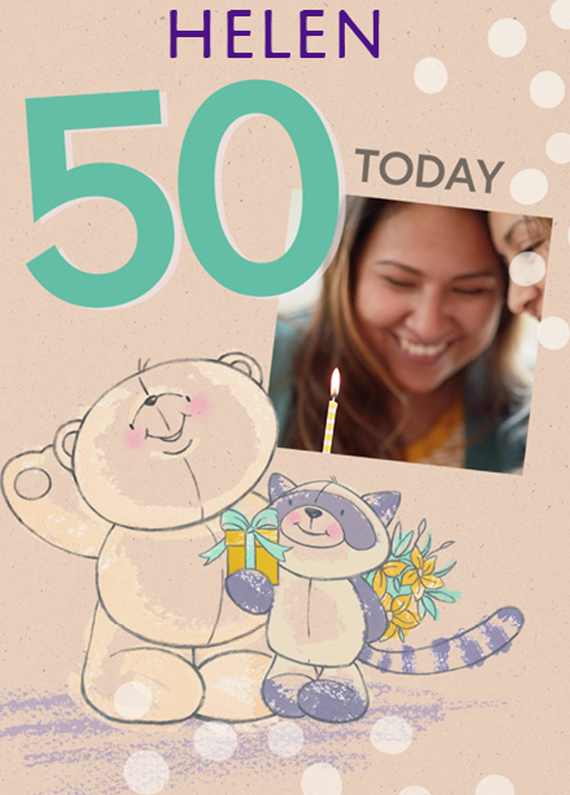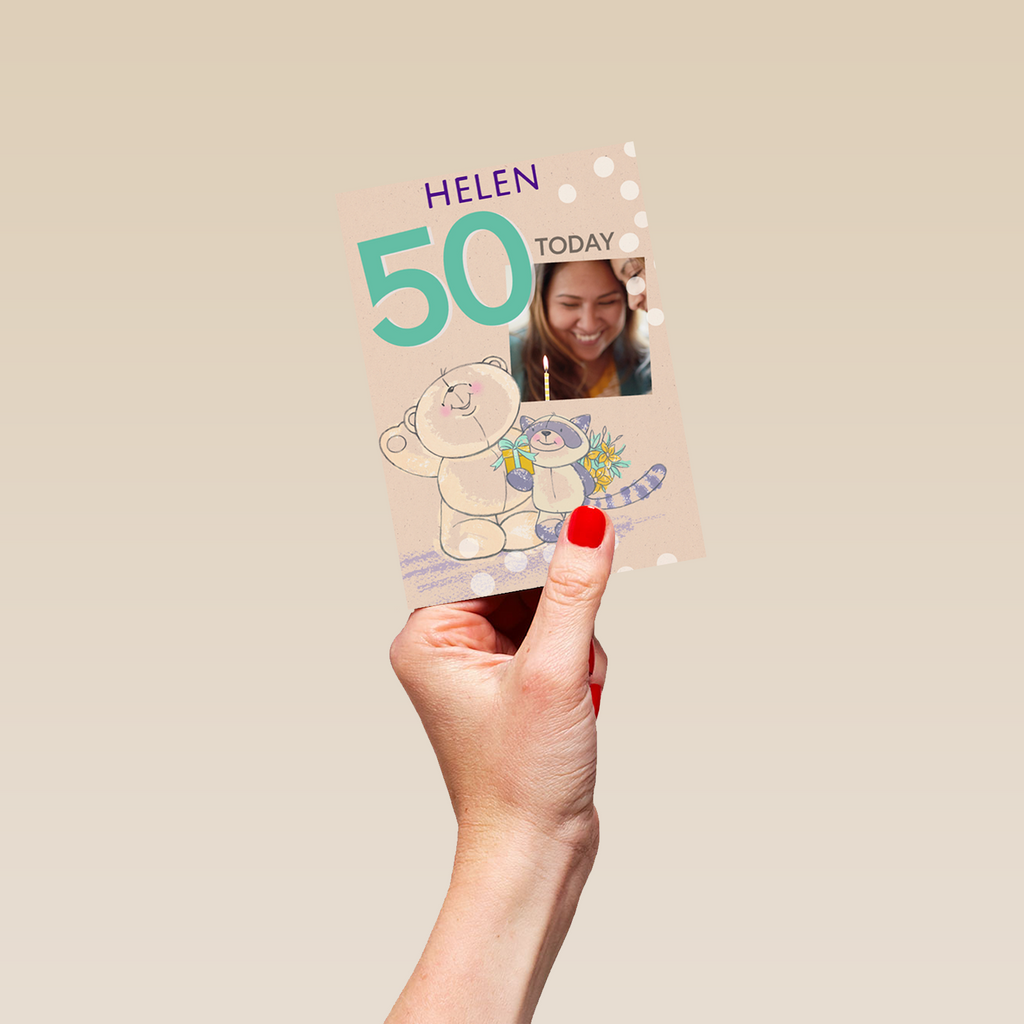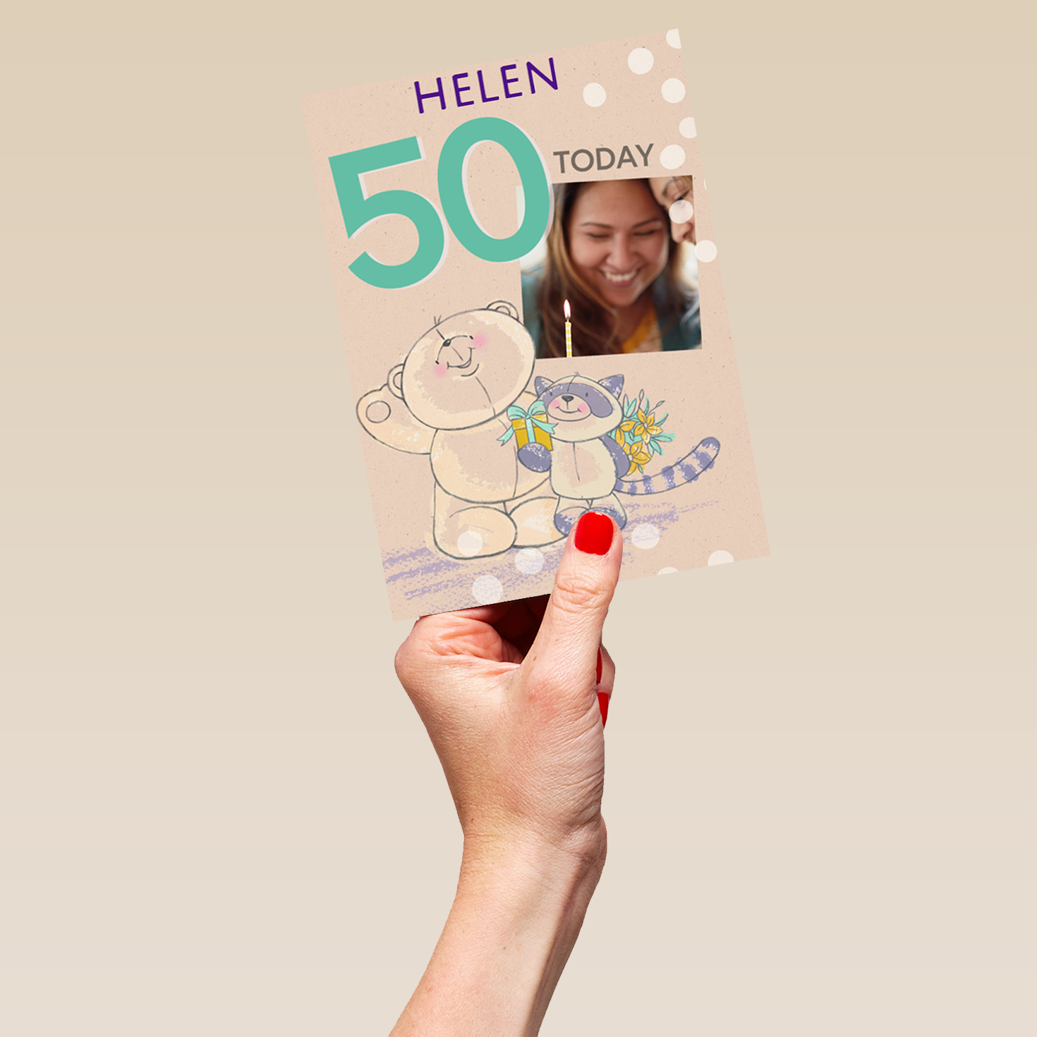 Show them you care with a personalised Forever Friends 50th birthday card from Hallmark. Our 50th birthday cards are printed on premium quality, FSC®-certified card & delivered nationwide. This card is available as standard 12cm by 16.7cm and large 15.5cm by 21.6cm.