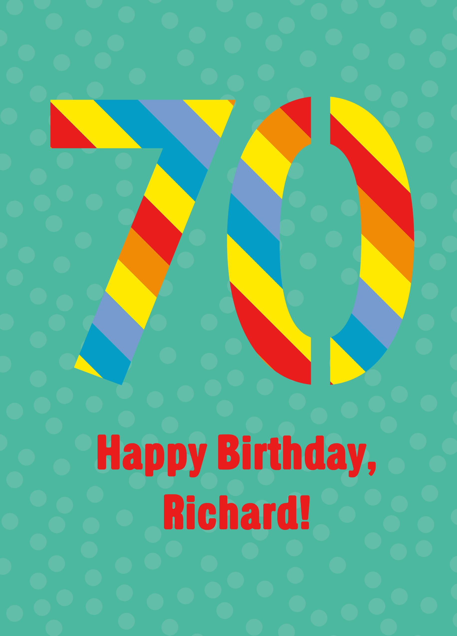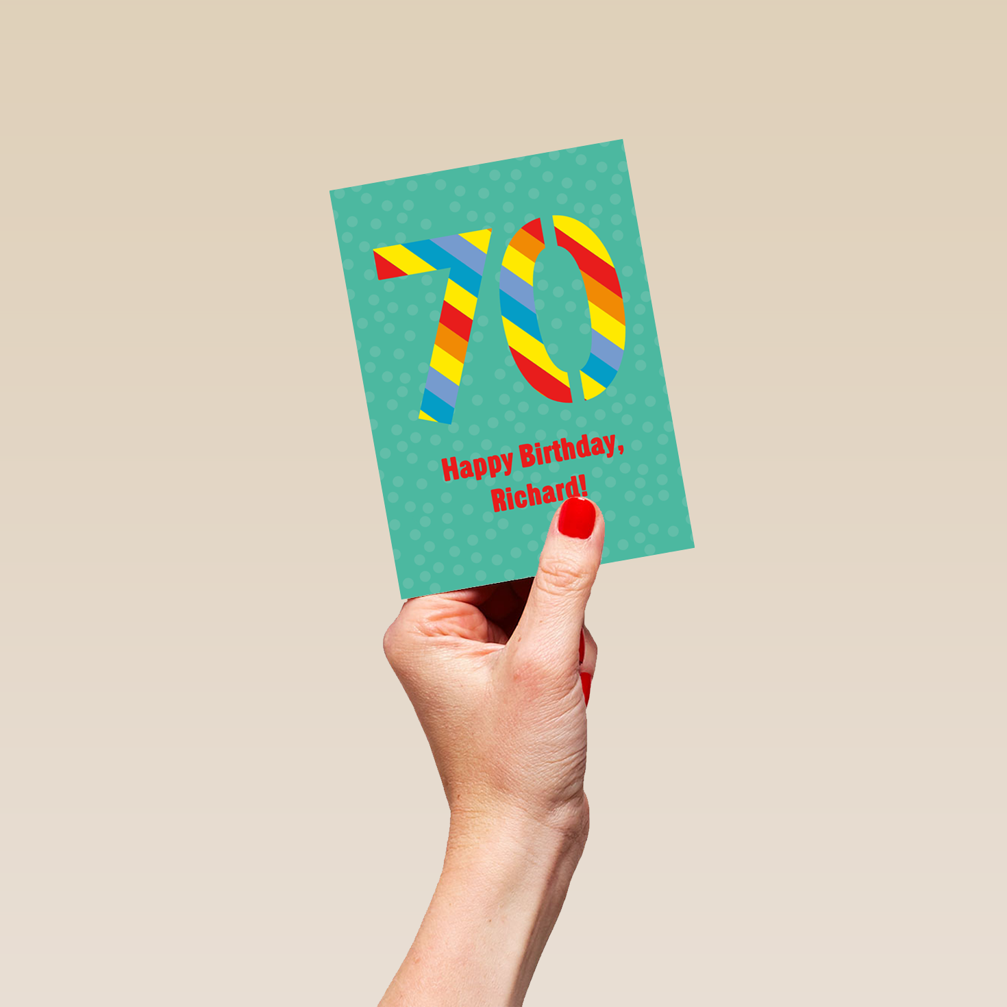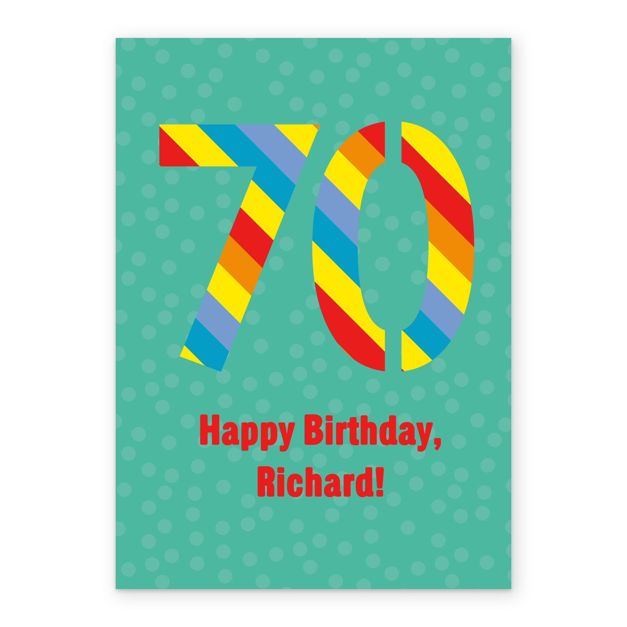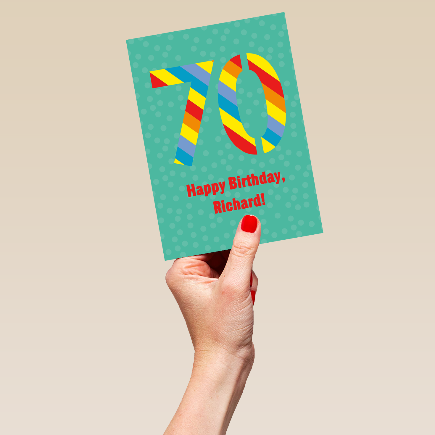 Printed on premium-quality board, this card features a fun, rainbow striped number on a bright confetti background to make their 70th birthday even brighter, with the message '70, Happy Birthday', space to personalise a name, and comes complete with a co-ordinating white envelope.
