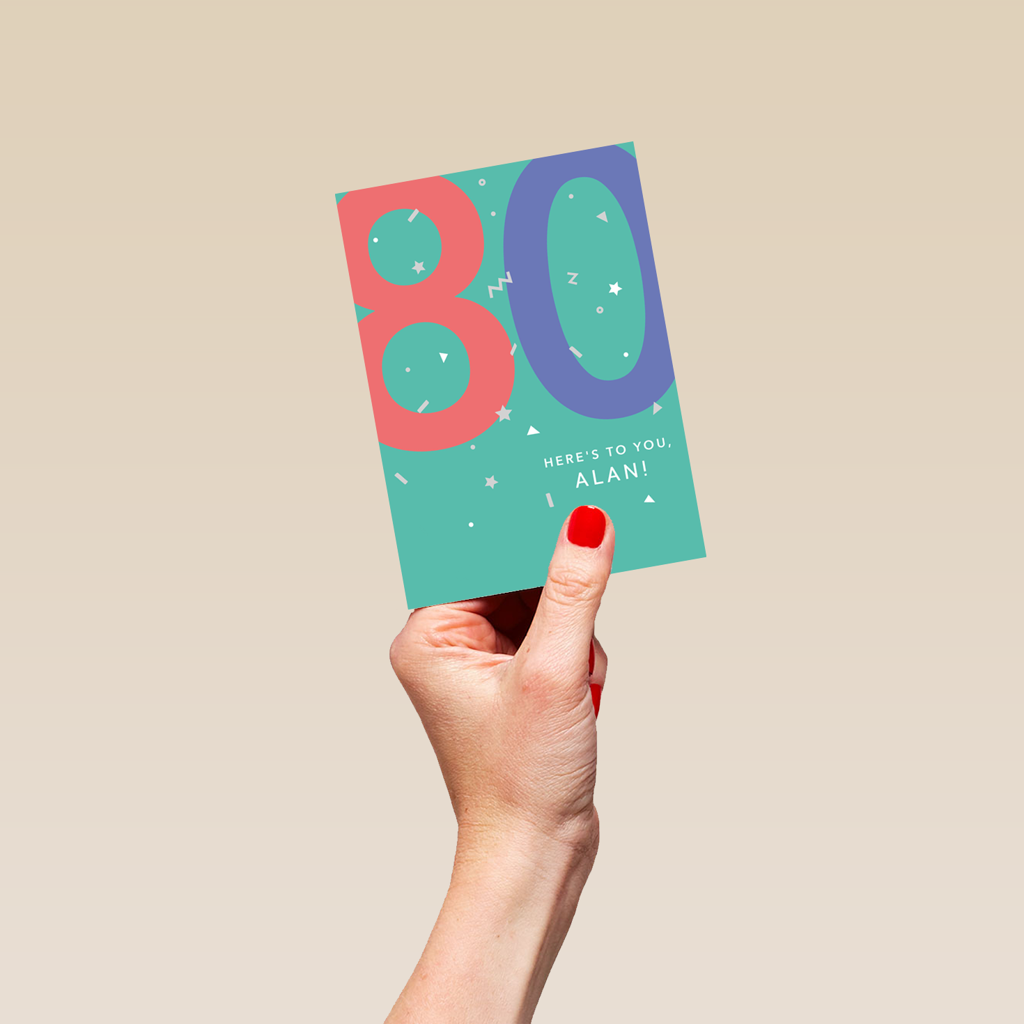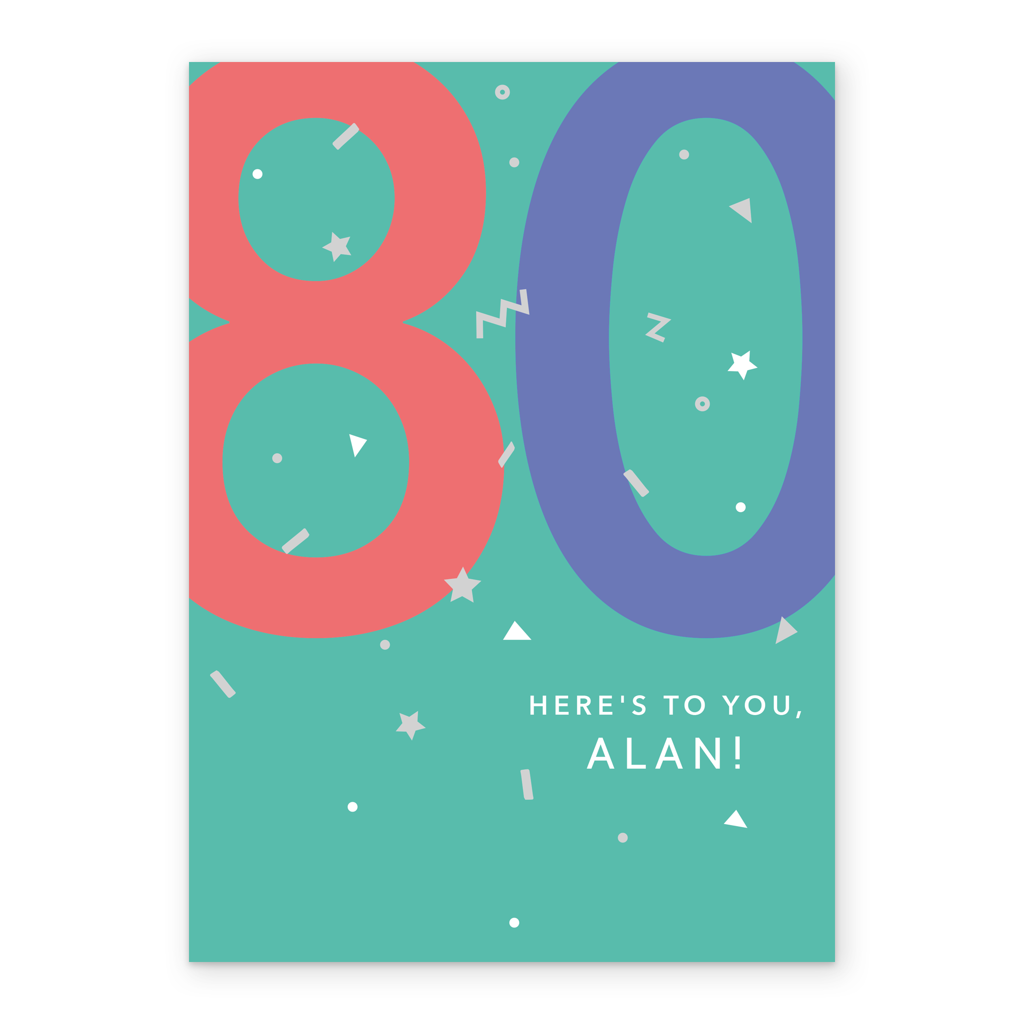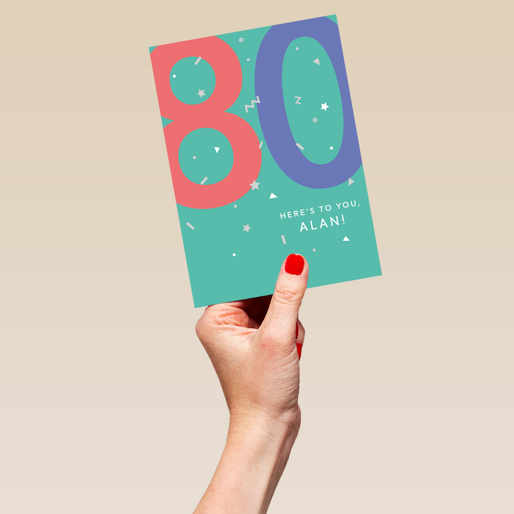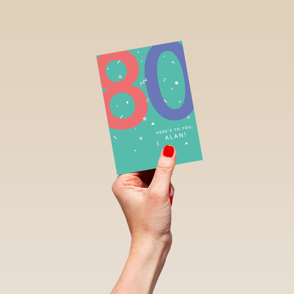 Printed on premium-quality board, this card features a fun colourful design to celebrate their 80th birthday, with the message '80, Here's To You', space to personalise a name, and comes complete with a co-ordinating white envelope.