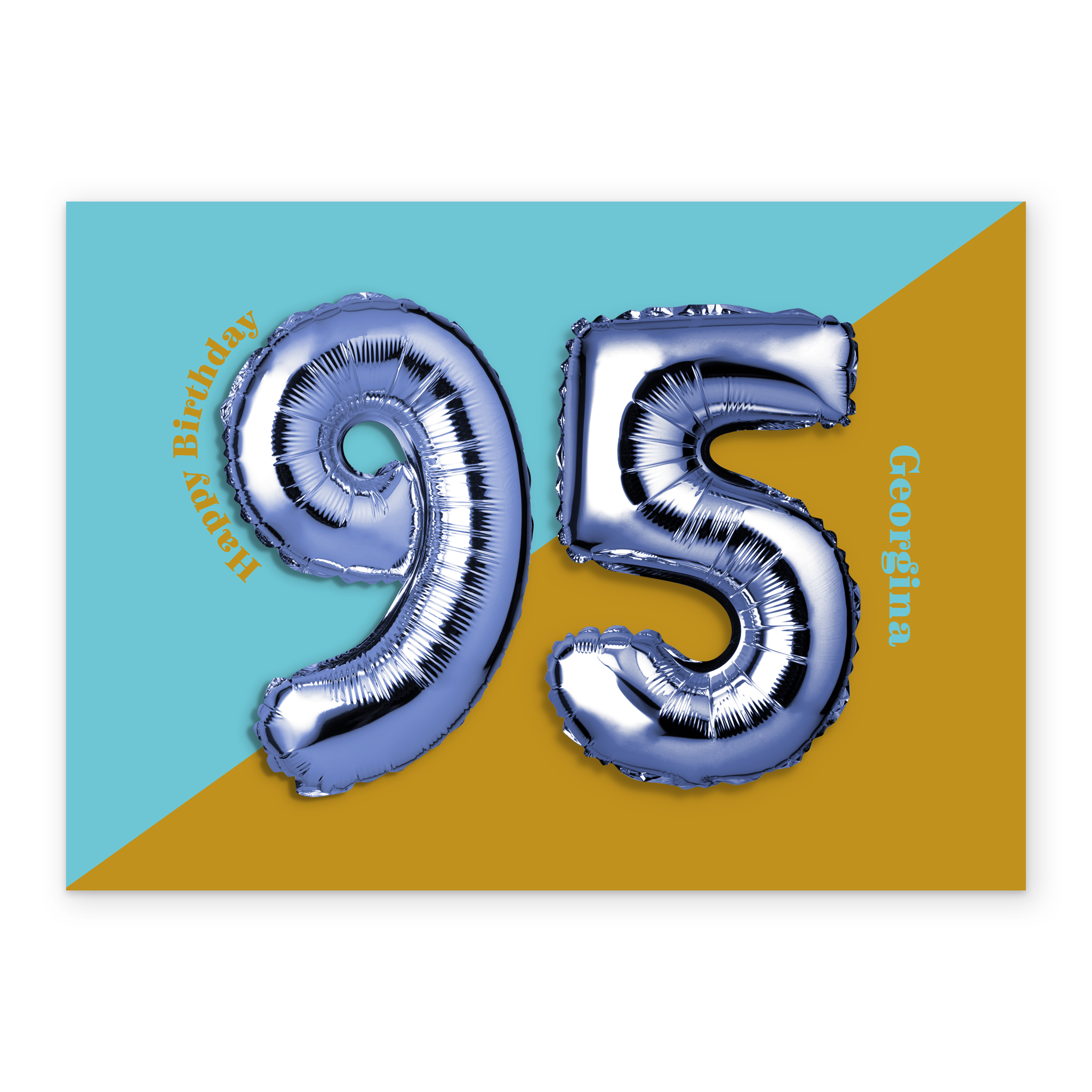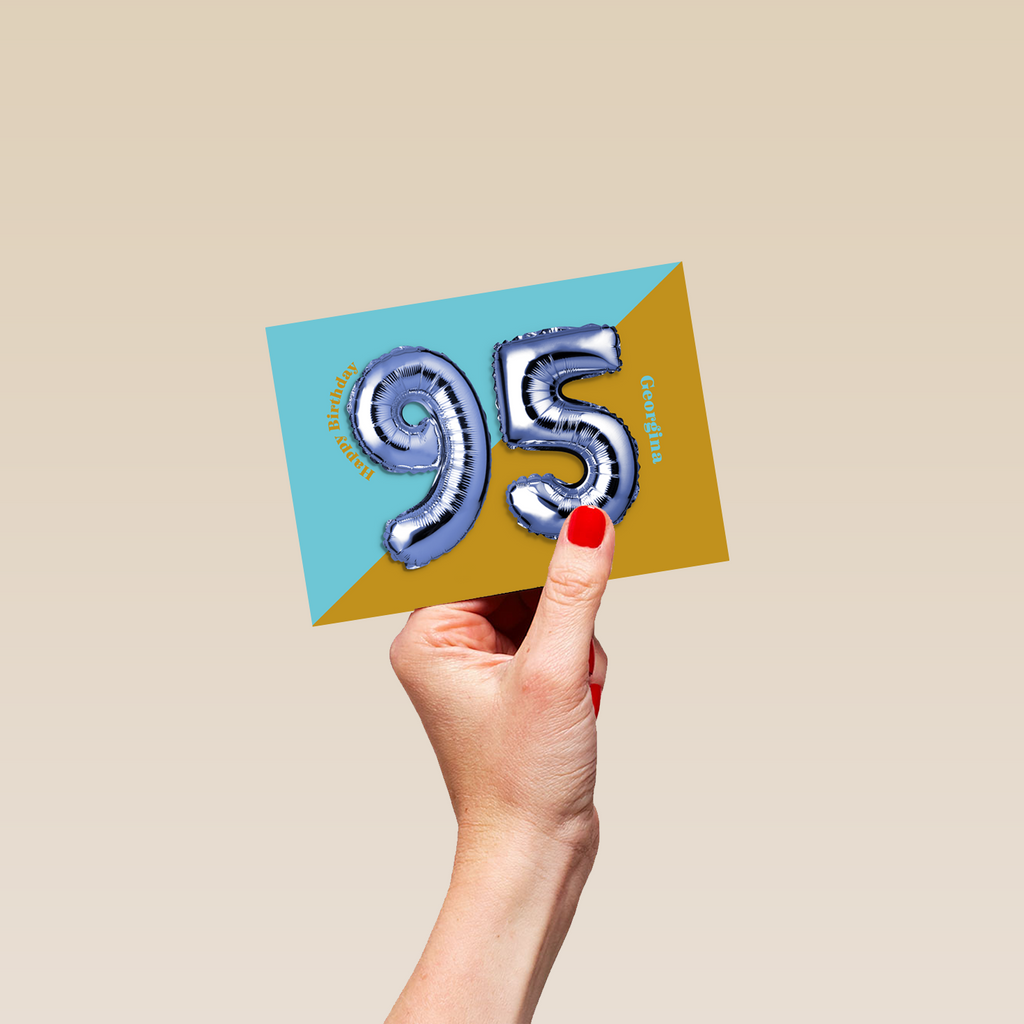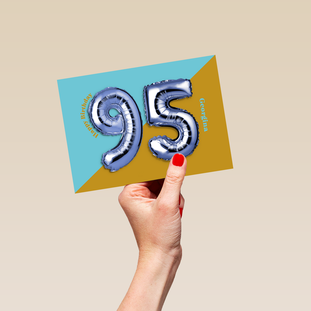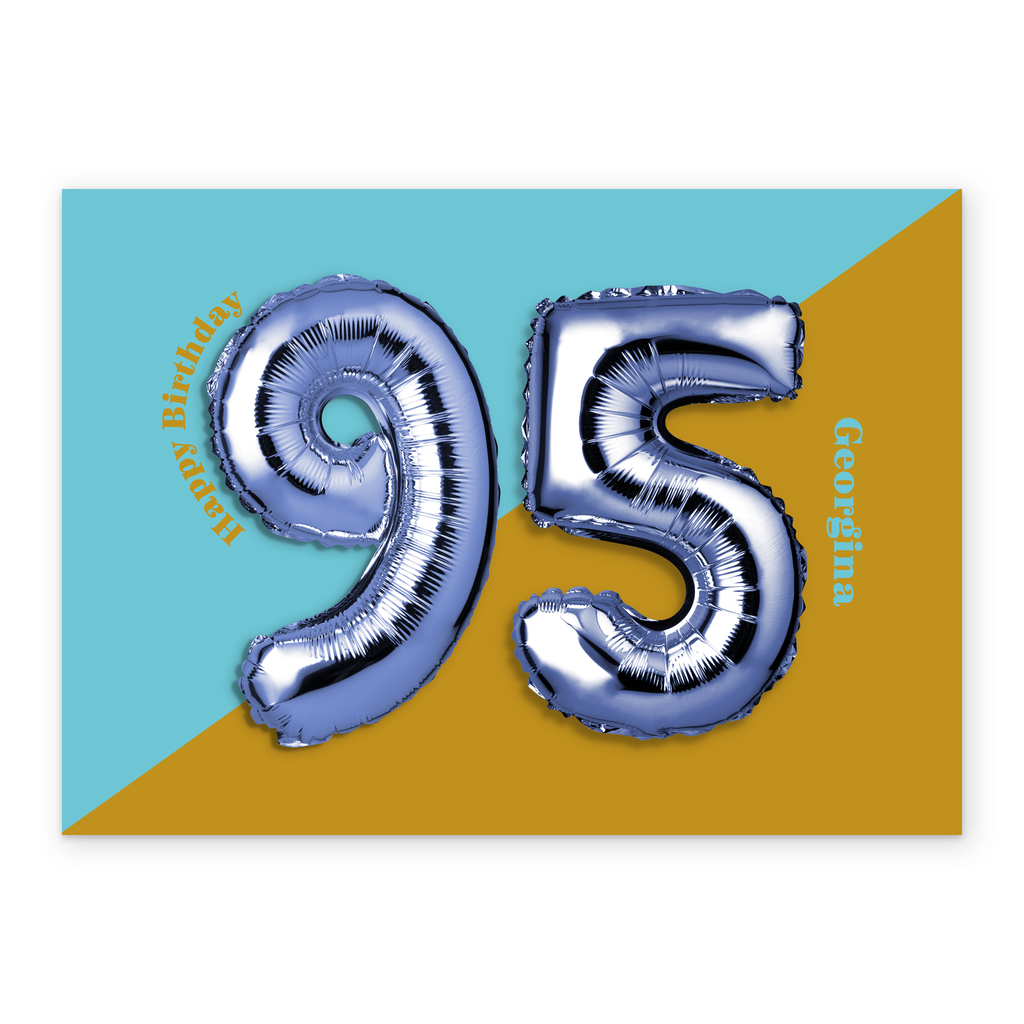 Printed on premium-quality board, this card features a foil balloon of the number 95 on a two tone colourful background, with the message '95, Happy Birthday', space to personalise a name, and comes complete with a co-ordinating white envelope.
