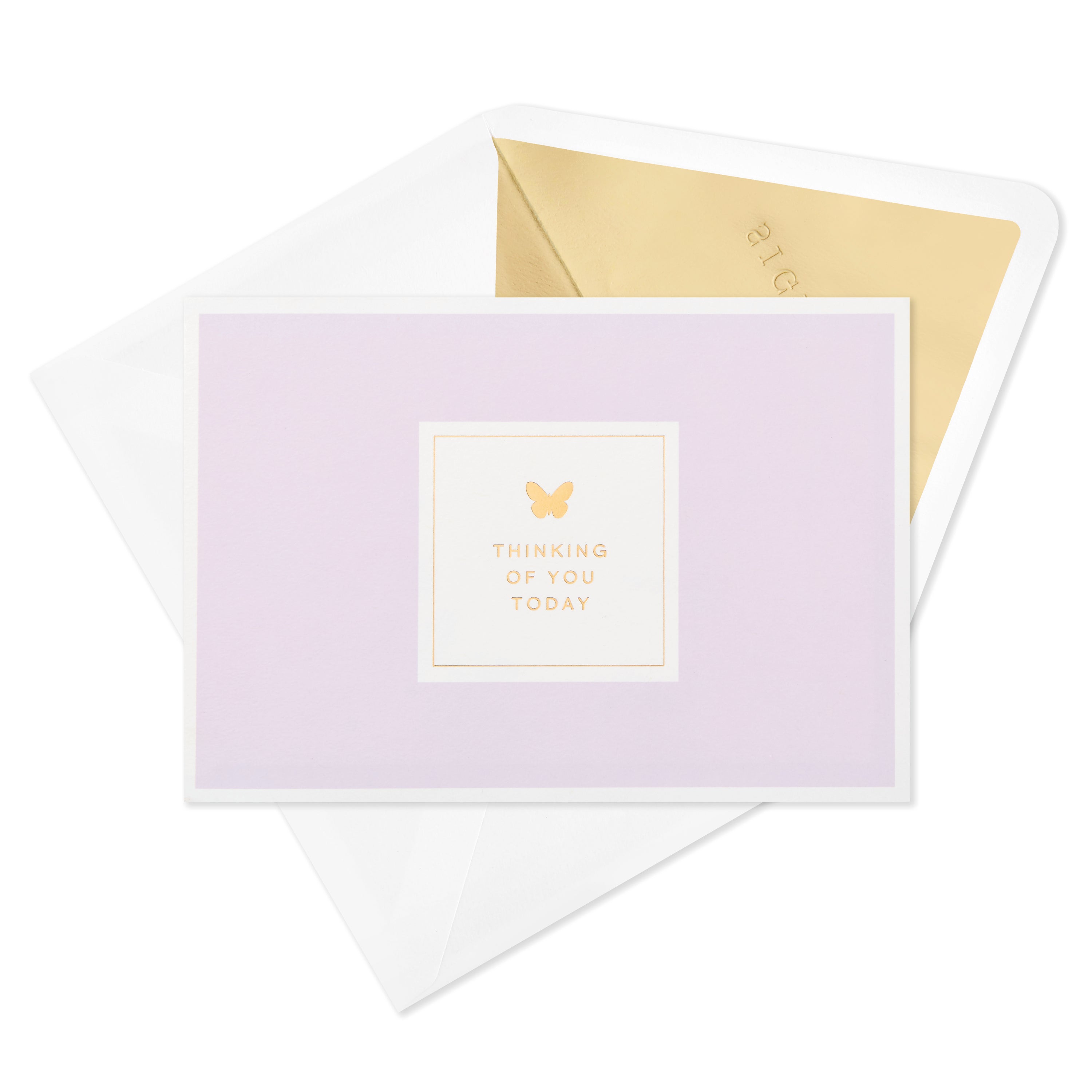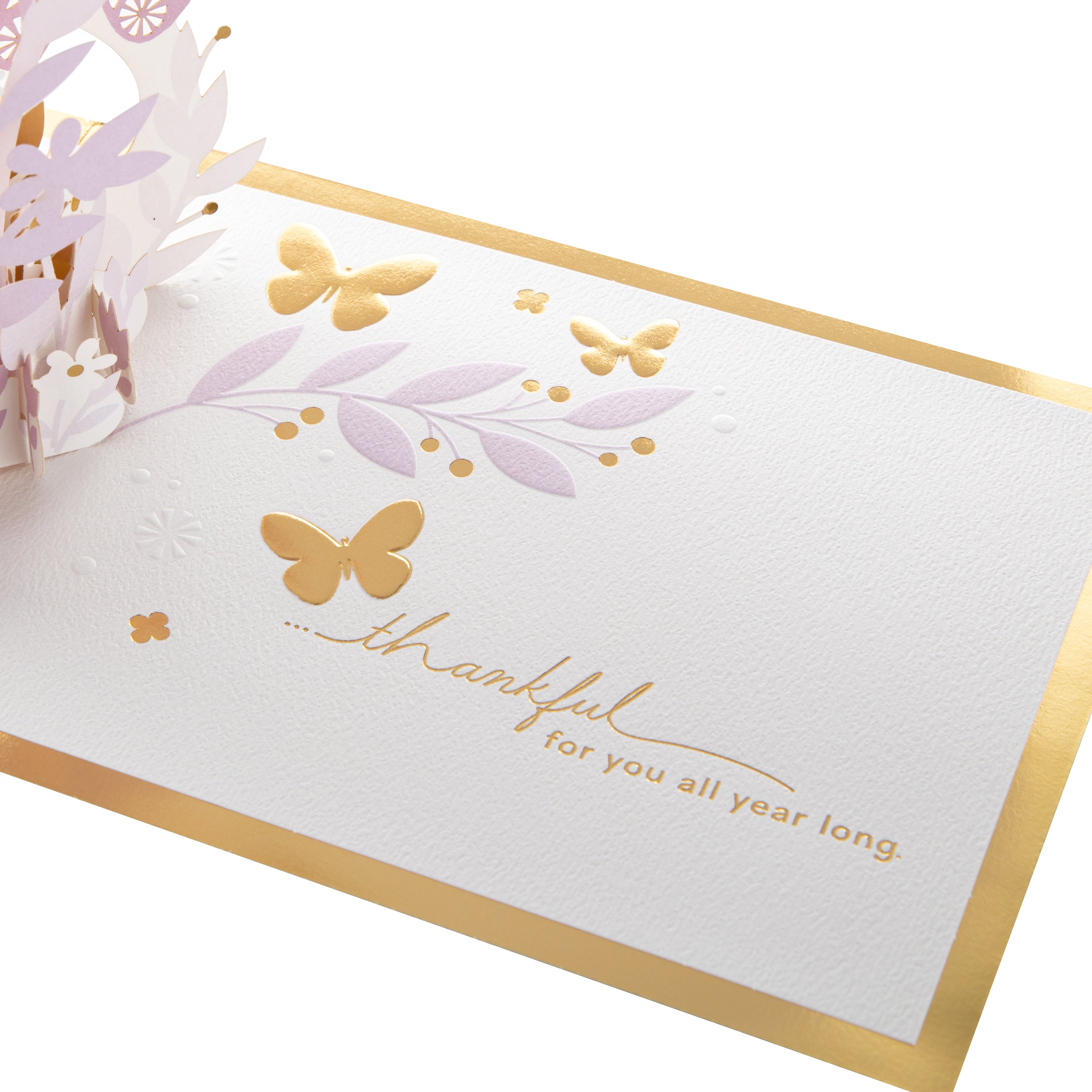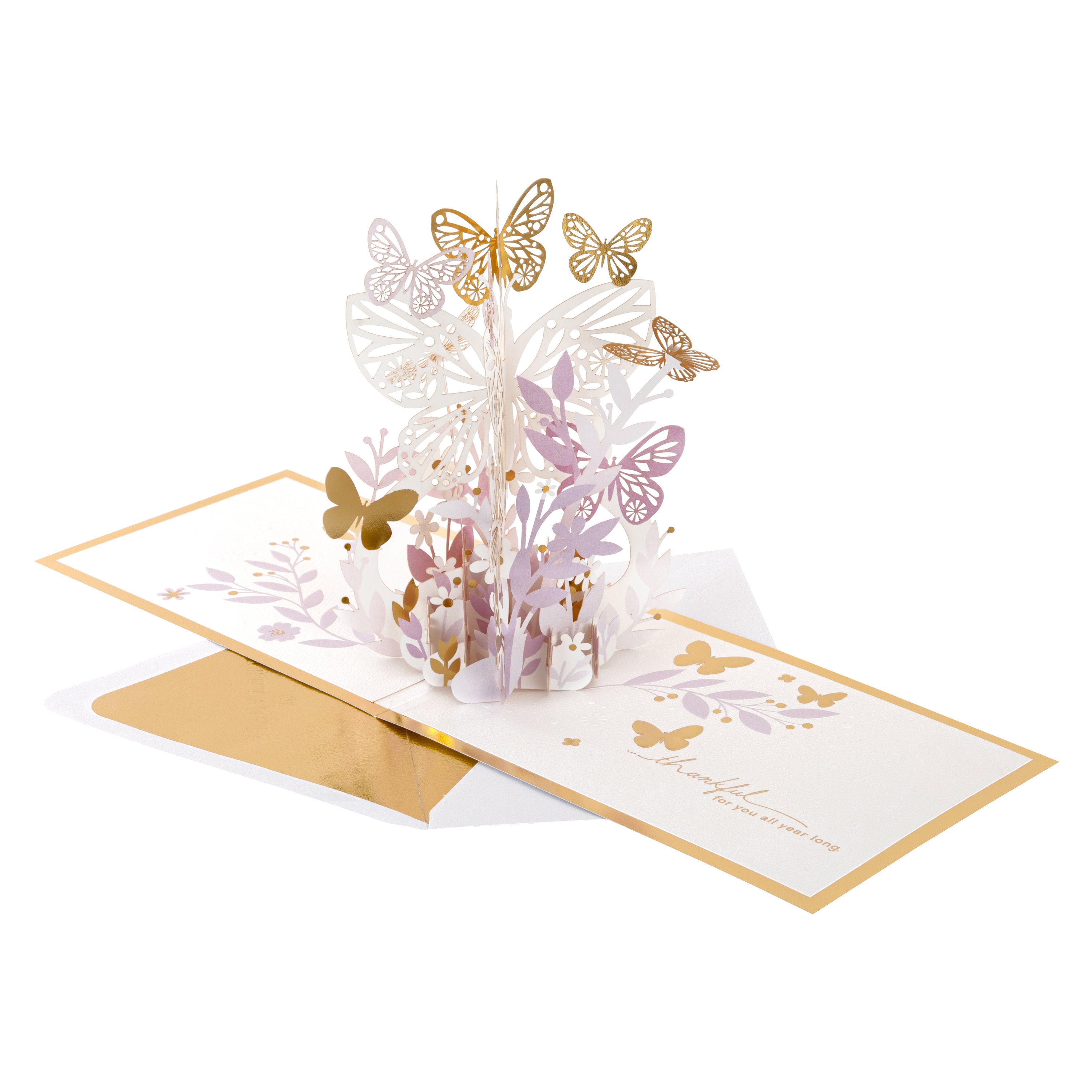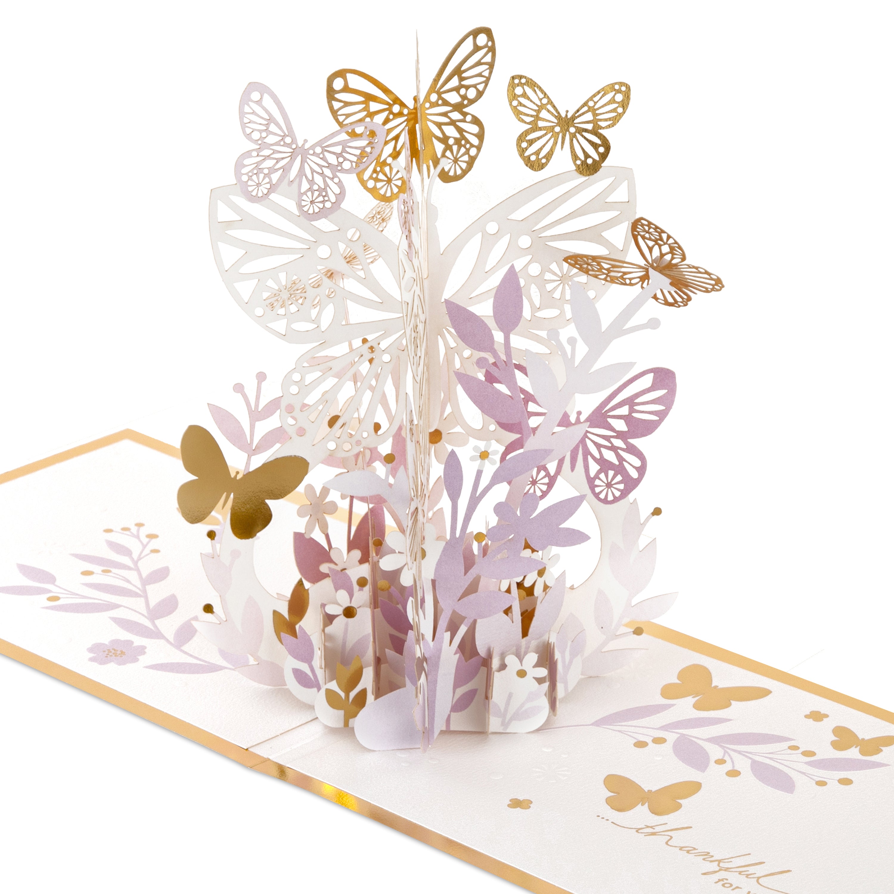 Printed on high quality board, with a simple, internal pop-up mechanism, this stunning card features a gorgeous die and laser-cut, 3D 'butterflies' pop-up, with embossed elements, gold-foil details and lettering, and the message, 'Thinking of you today' on the front. The card comes complete with a Hallmark Signature branded, gold-foiled, white envelope.