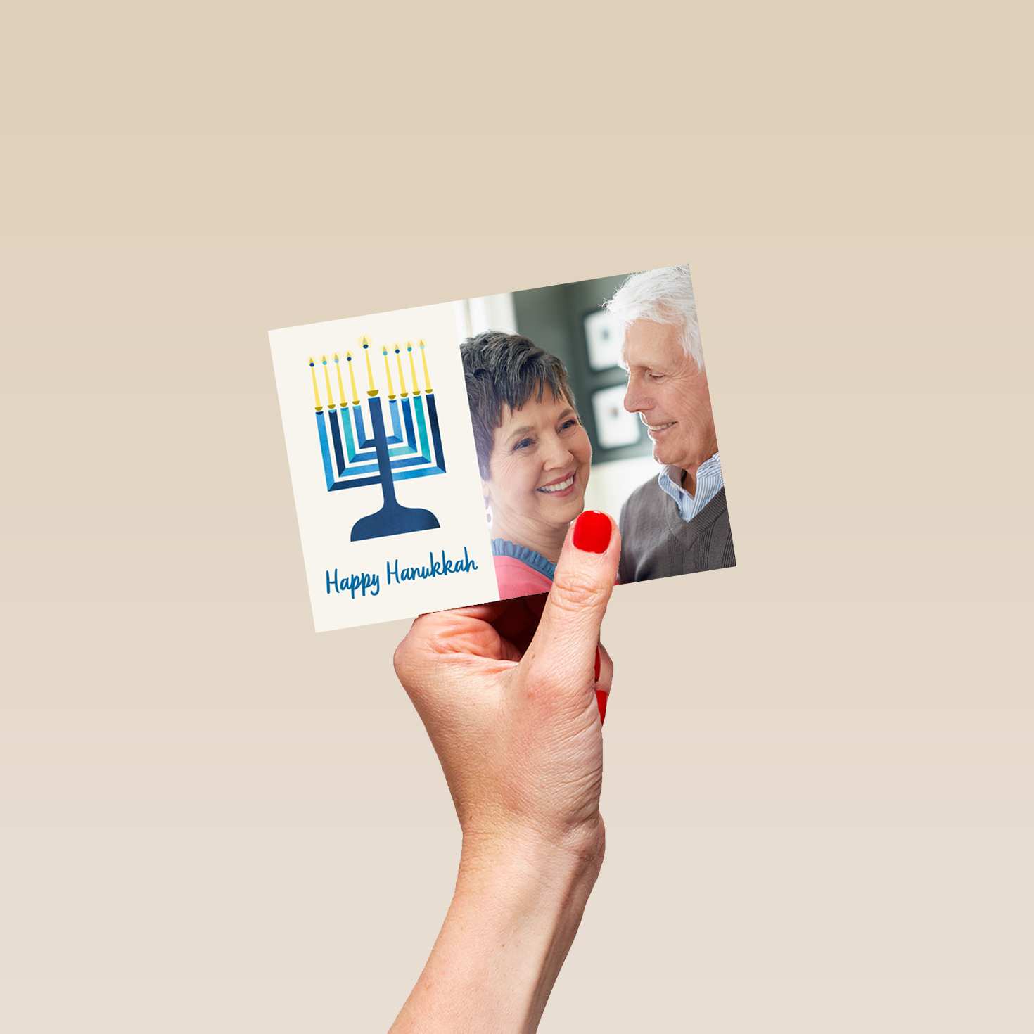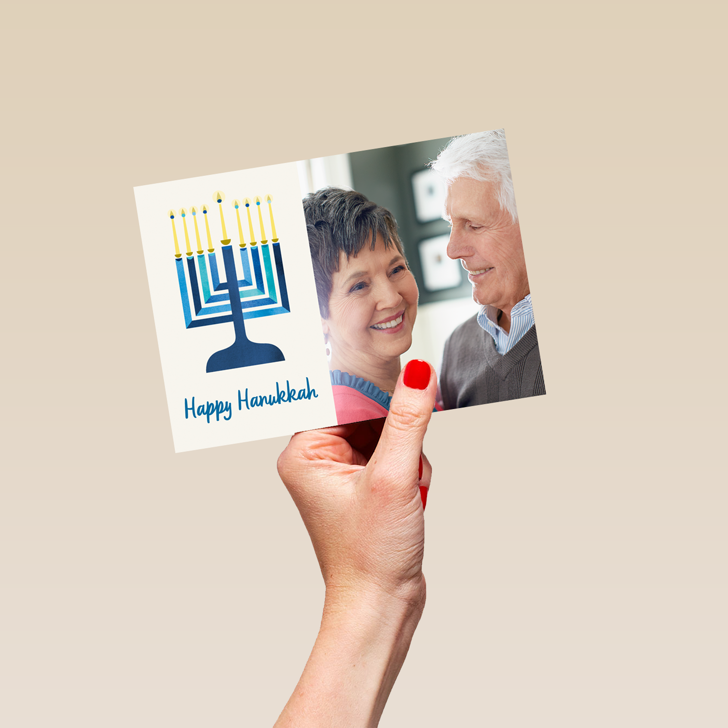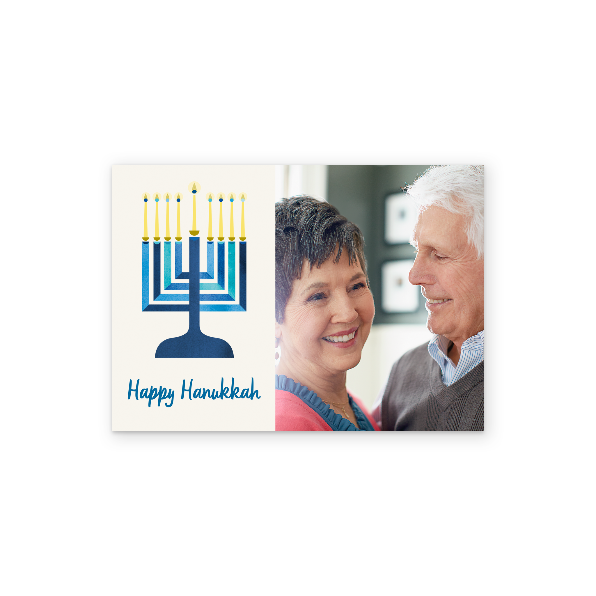 Printed on premium-quality board, this card features a half page photo frame alongside a stylised illustration of a Menorah in shades of blue, against an off-white background above blue handwritten style lettering, with the message 'Happy Hanukkah', space to upload a photo, and comes complete with a co-ordinating white envelope.