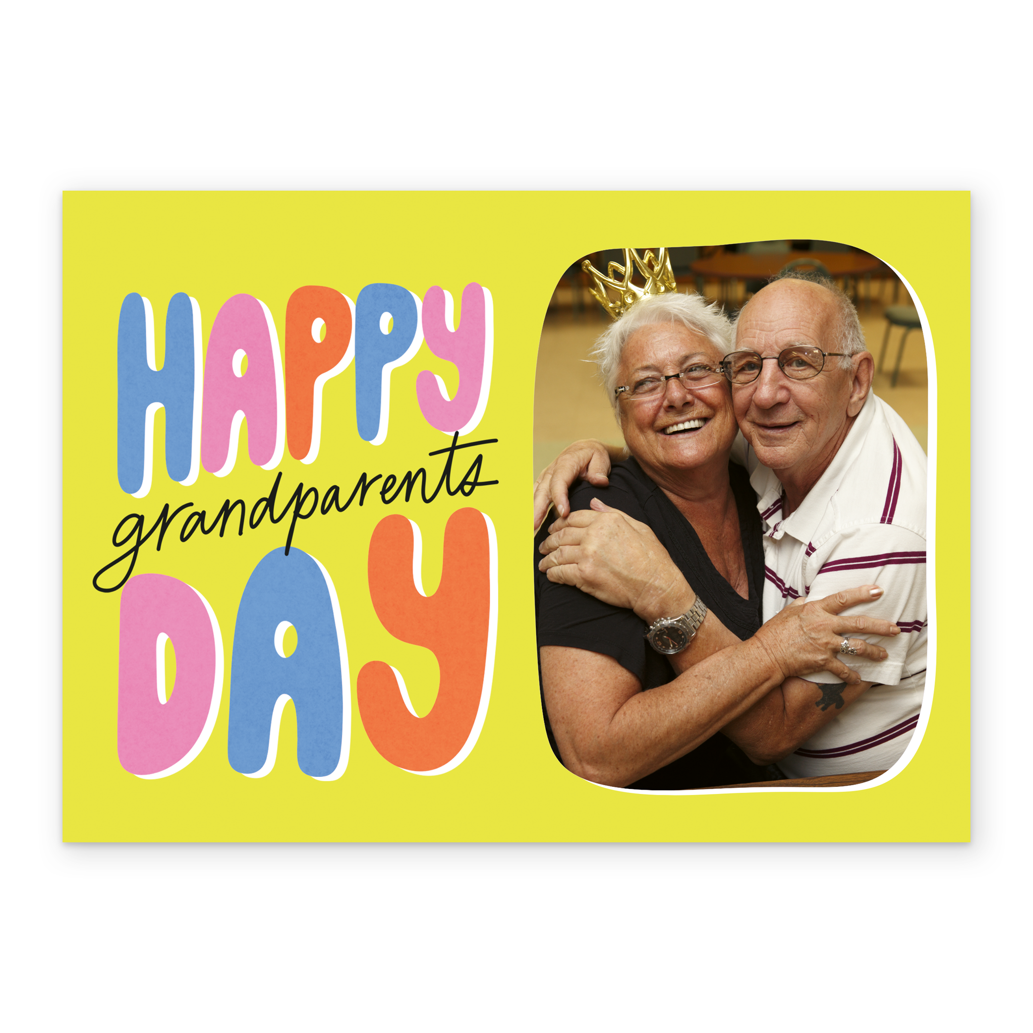 Printed on premium-quality board, this card features a vibrant acid yellow background with a photo upload aperture on one side and multi-coloured retro style lettering on the other, with the message 'Happy Grandparents Day', space to upload a photo, and comes complete with a co-ordinating white envelope.