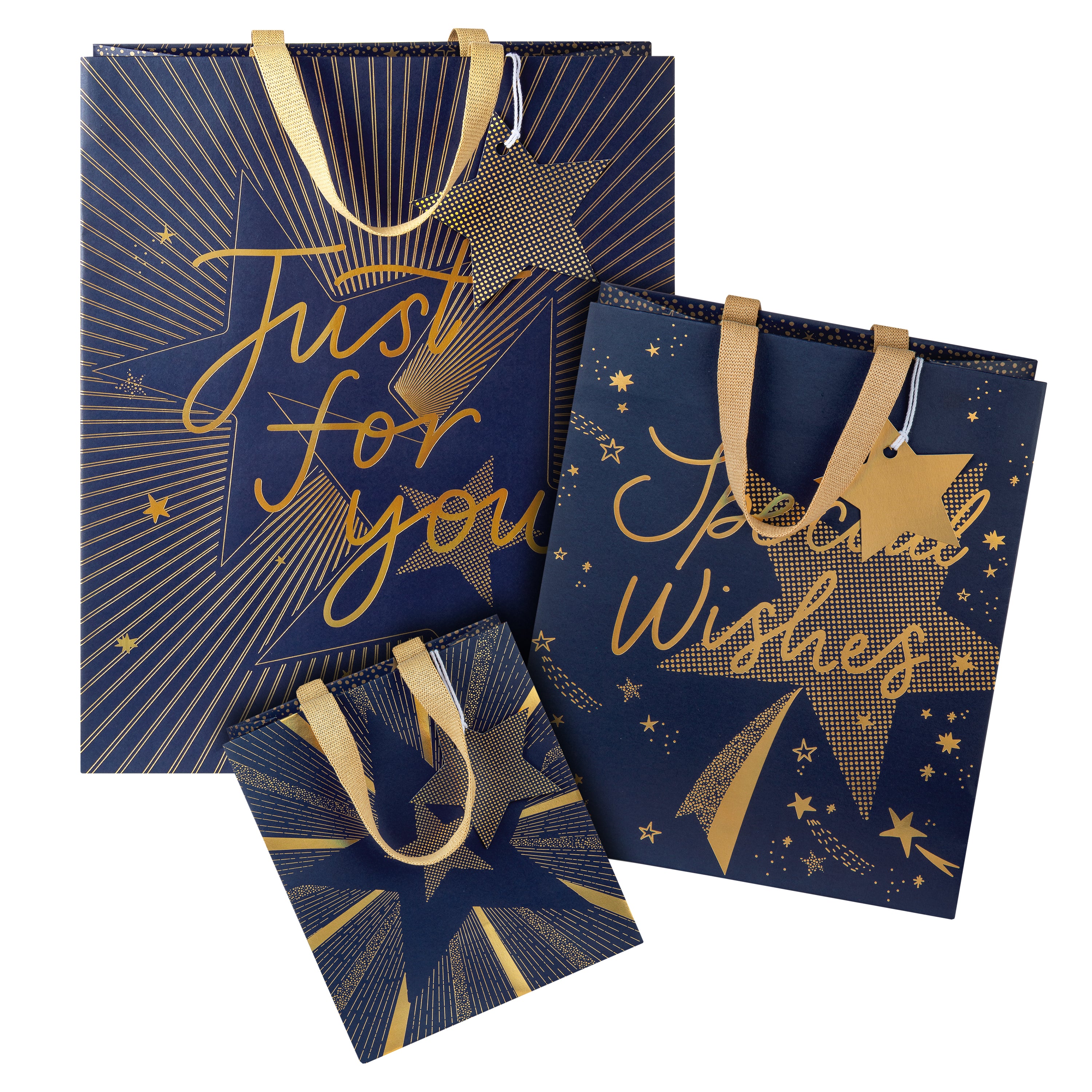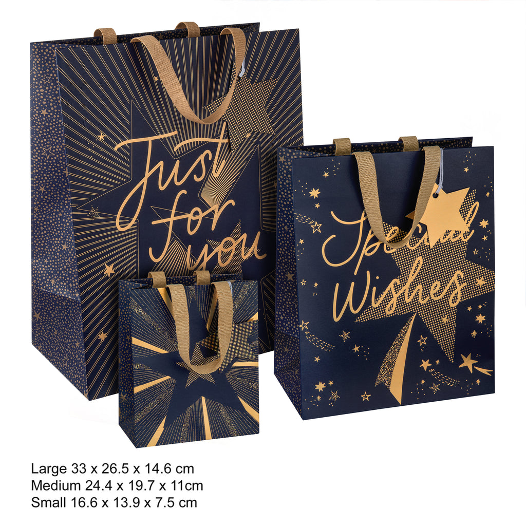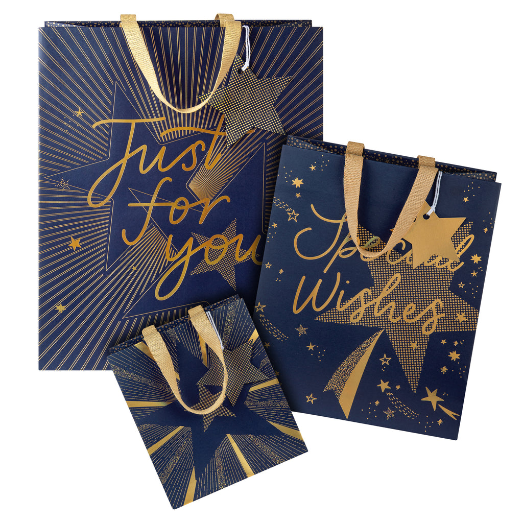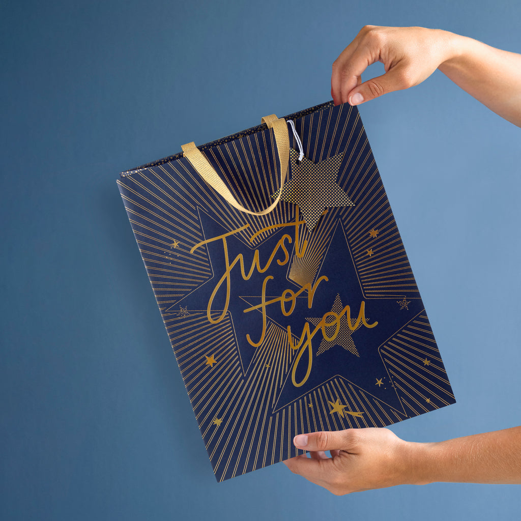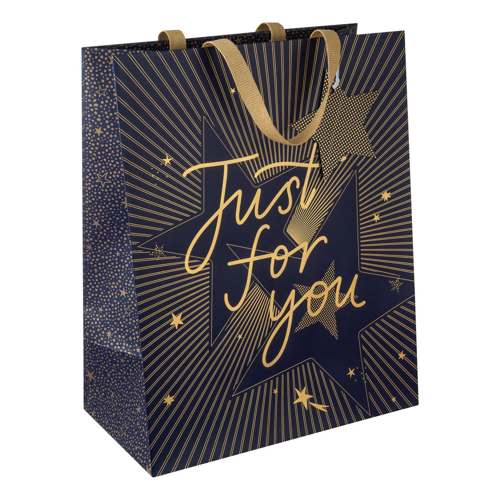 Large Bag Design: Navy and gold twin stars design with co-ordinating gold and navy 'celebrate' star patterned side panels, gold foil highlights and lettering on the front panel with the message 'Just for You', alongside gold-coloured woven paper ribbon handles and a navy and gold dot-print, star-shaped gift tag.