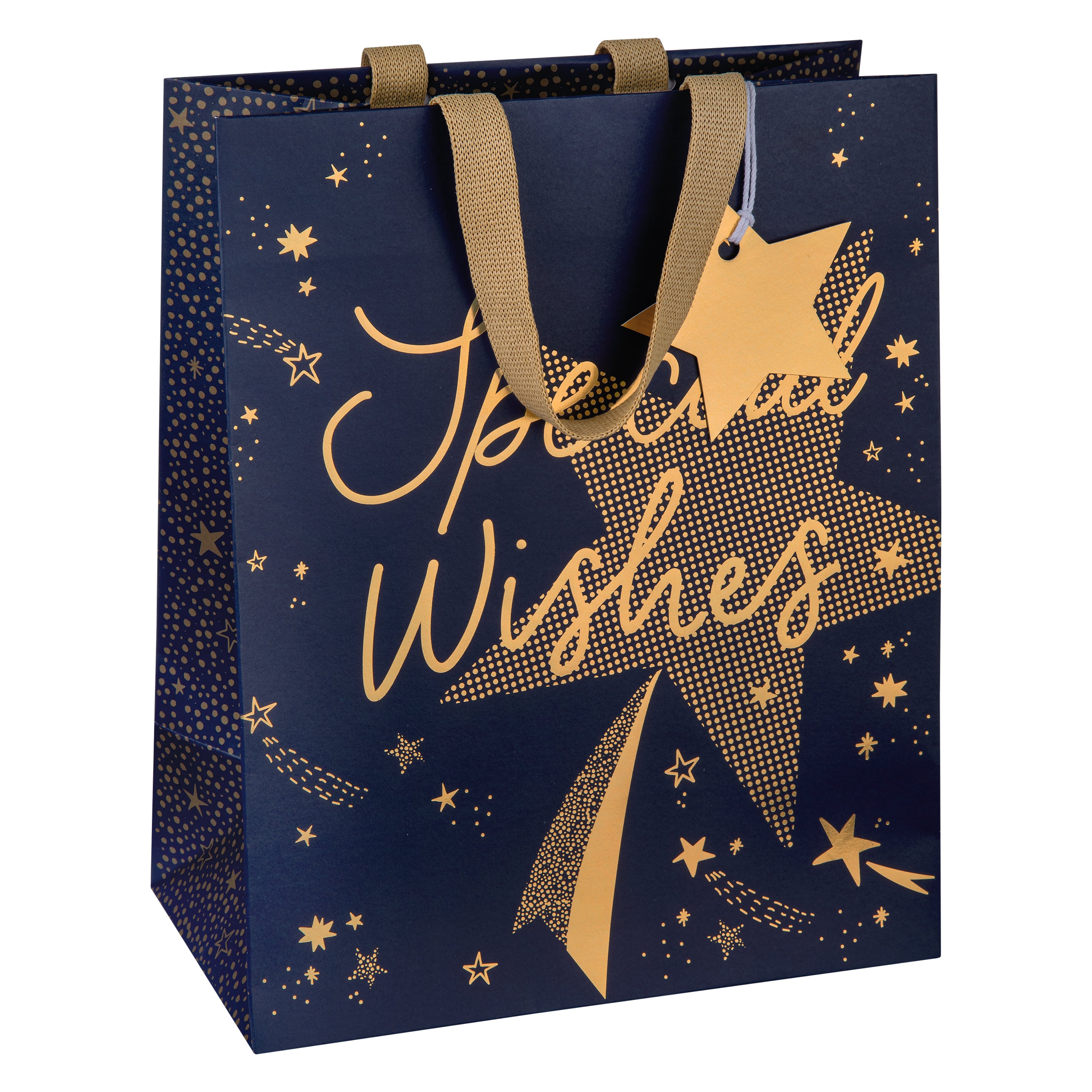 Medium Bag Design: Navy and gold shooting star design with co-ordinating gold and navy 'celebrate' star patterned side panels, gold foil highlights and lettering on the front panel with the message 'Special Wishes', alongside gold-coloured woven paper ribbon handles and a gold-foiled, star-shaped gift tag.