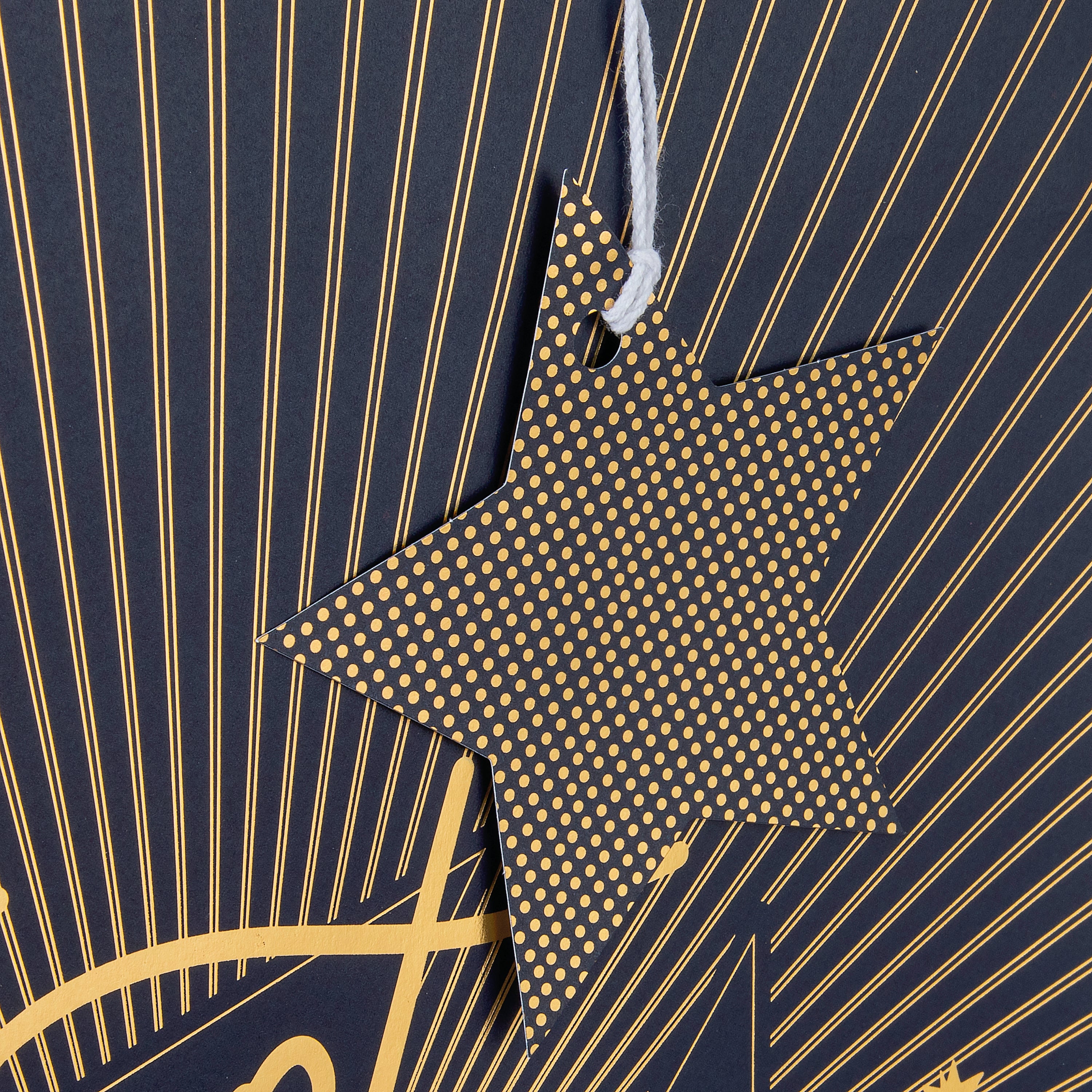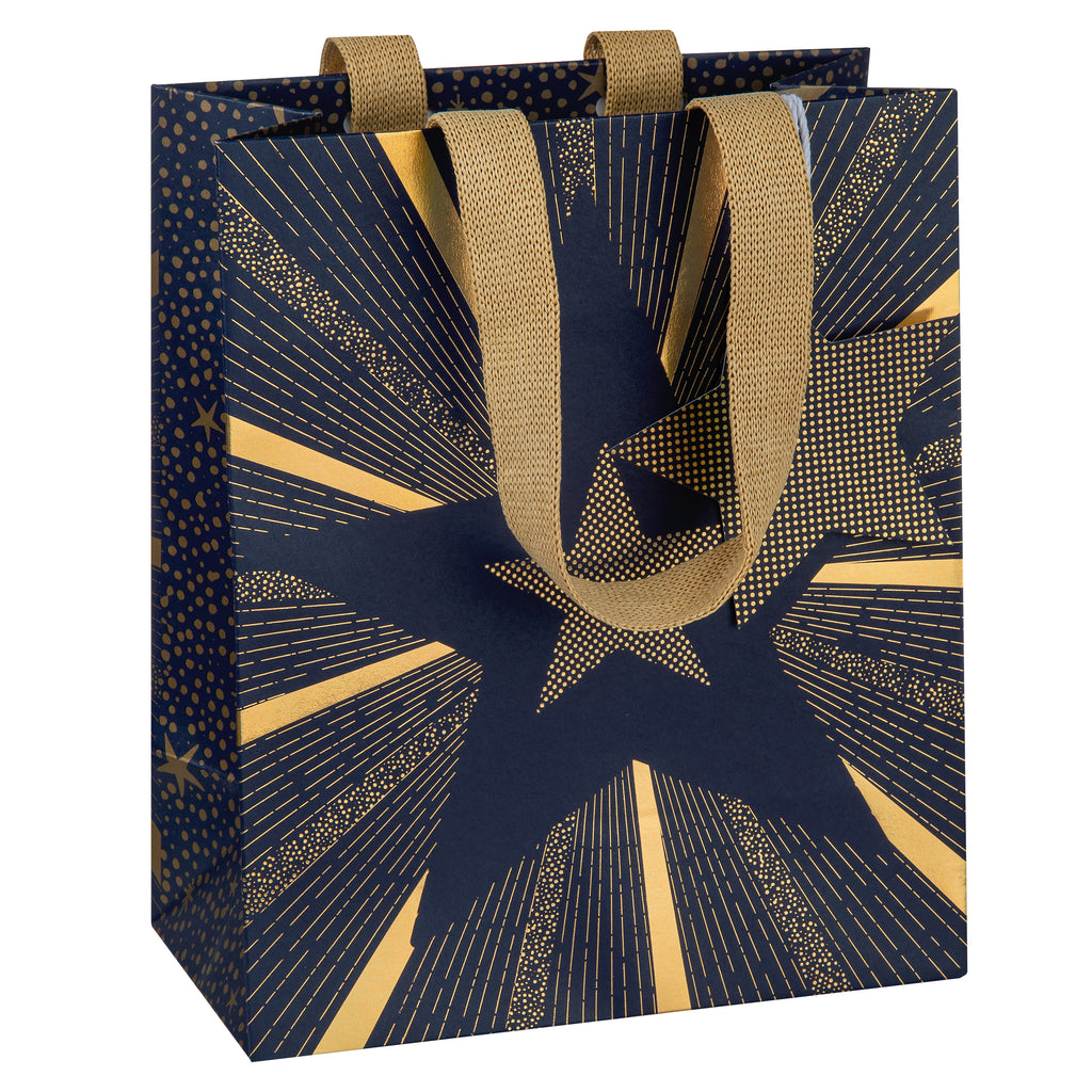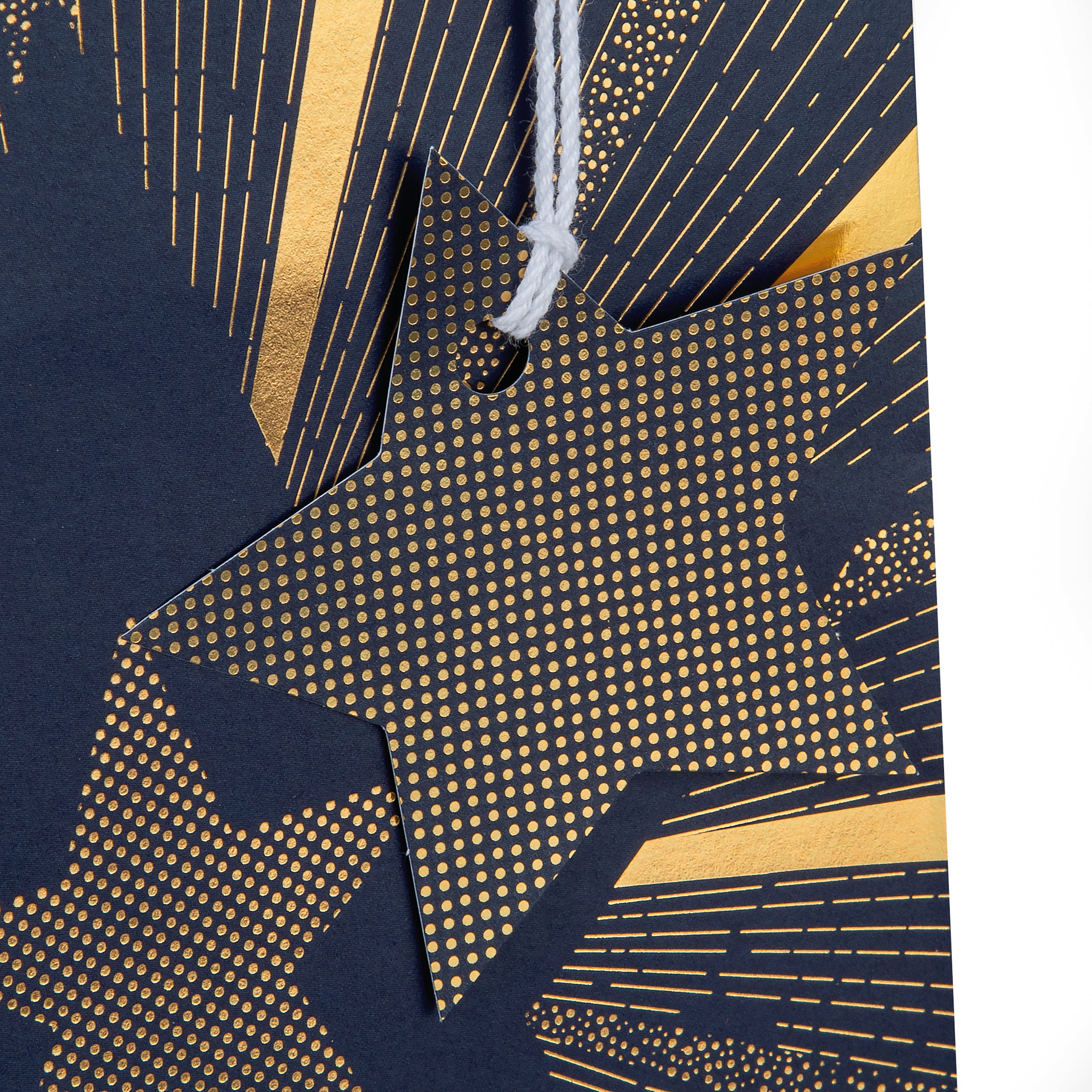 Small Bag Design: Navy and gold starburst design with co-ordinating gold and navy 'celebrate' star patterned side panels, gold foil highlights on the front panel, gold-coloured woven paper ribbon handles and a navy and gold dot-print, star-shaped gift tag.