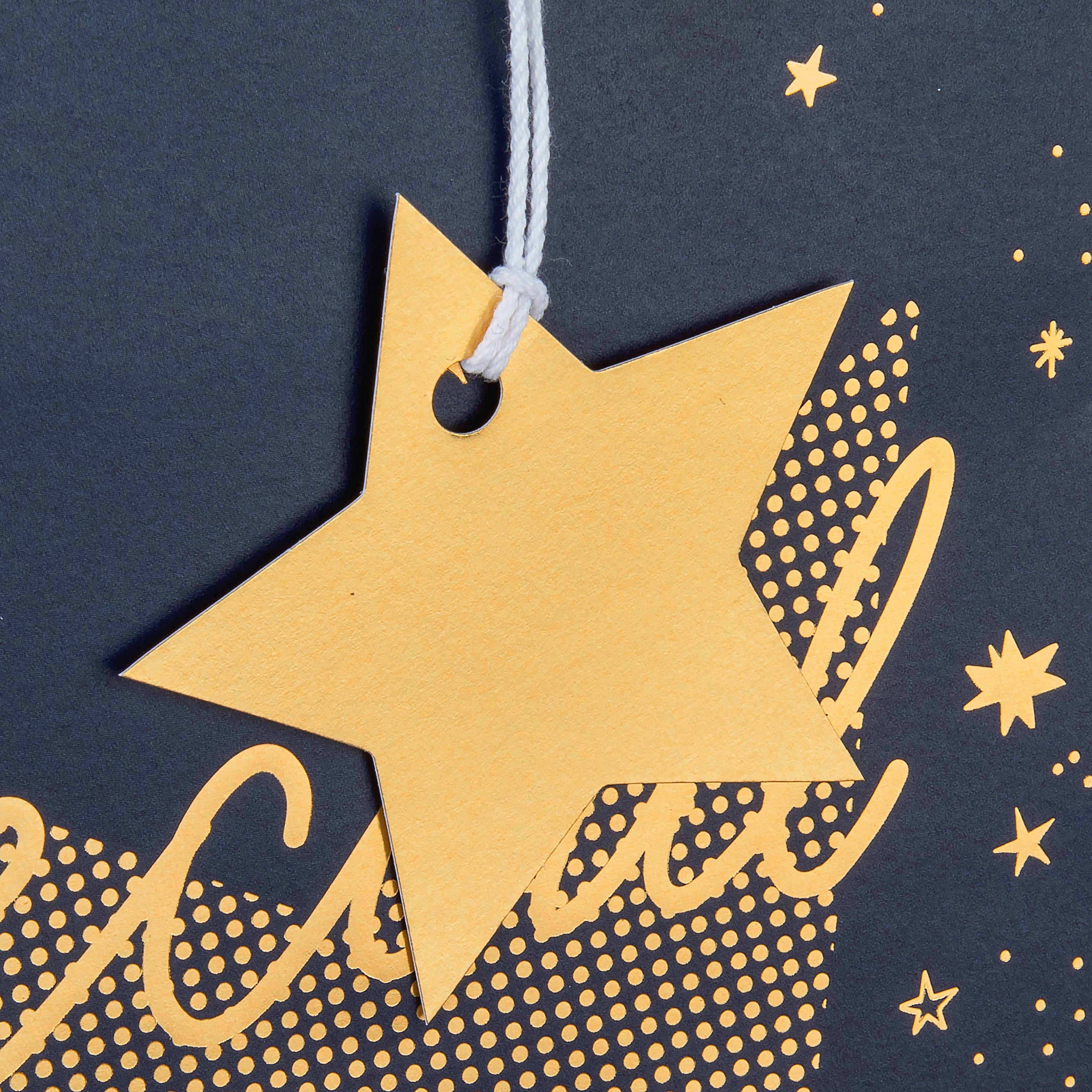 All 3 bags feature dazzling gold-foiled, star patterned designs on rich navy blue backgrounds with co-ordinating gold-coloured, woven paper ribbon handles and die-cut star-shaped gift tags. All bag components, including handles, are fully recyclable.