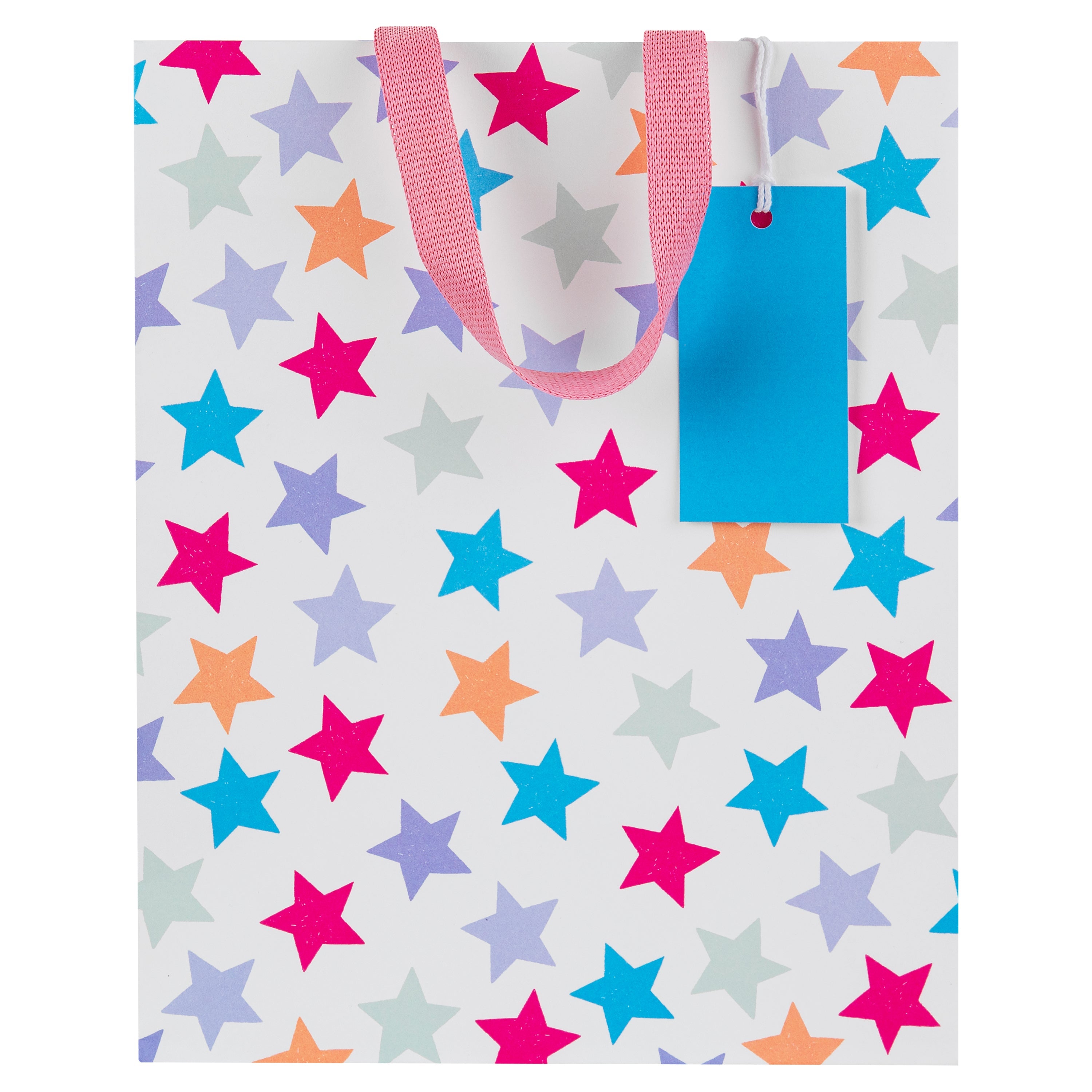 Medium Bag Design: Multi-coloured star print on a white background on the front panel with co-ordinating striped side panels and multi-coloured spots and stars on the back panel, with pink knitted paper ribbon handles and a turquoise gift tag.