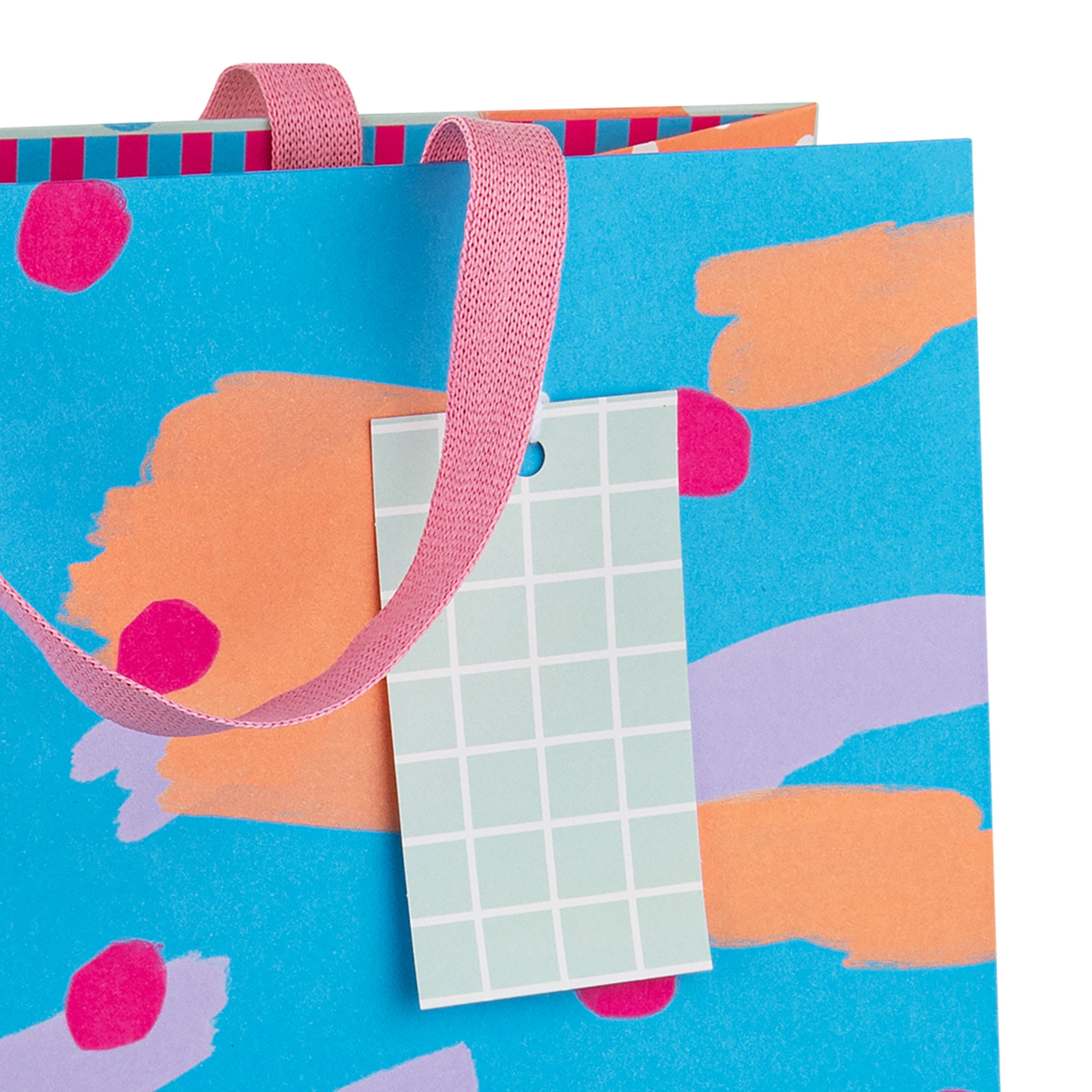 Large Bag Design: Abstract 'colour splash' pattern in pink, orange and lilac against a bright turquoise background on the front panel, orange and white spotted right-side panel, lilac and white checked left-side panel, and the same 'colour splash' pattern on the back panel against a paler turquoise background, with pink knitted paper ribbon handles and a pale turquoise checked gift tag.