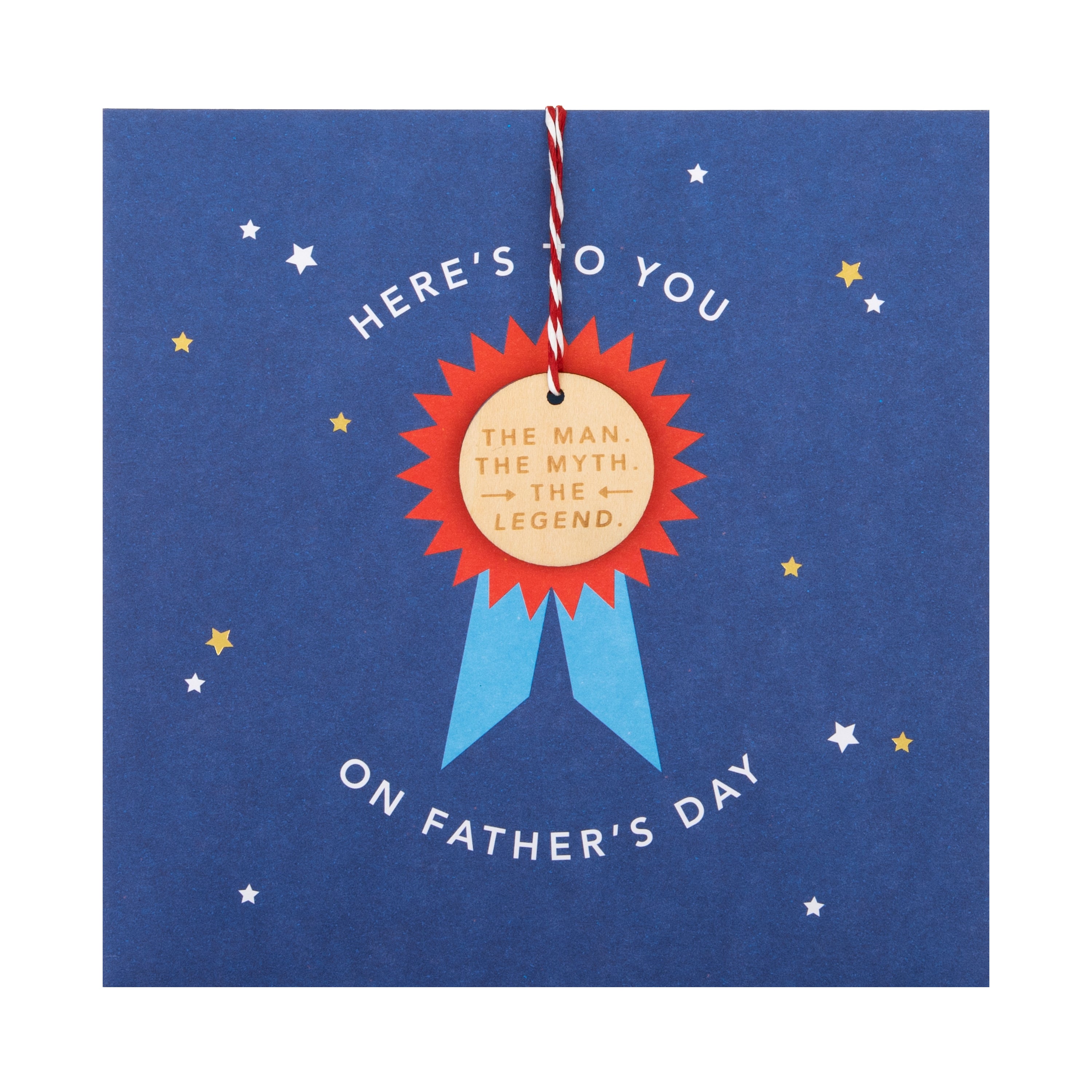 Printed on high quality board, this Father's day card features the message 'Here's to you on Father's Day' on the front, gold foil details, comes complete with a Hallmark branded, red envelope and includes a laser cut, wooden keepsake hanging attachment with red and white paper twine and the message 'The man, the myth, the legend.' Why not tie this fun keepsake to your keys or place inside your wallet?