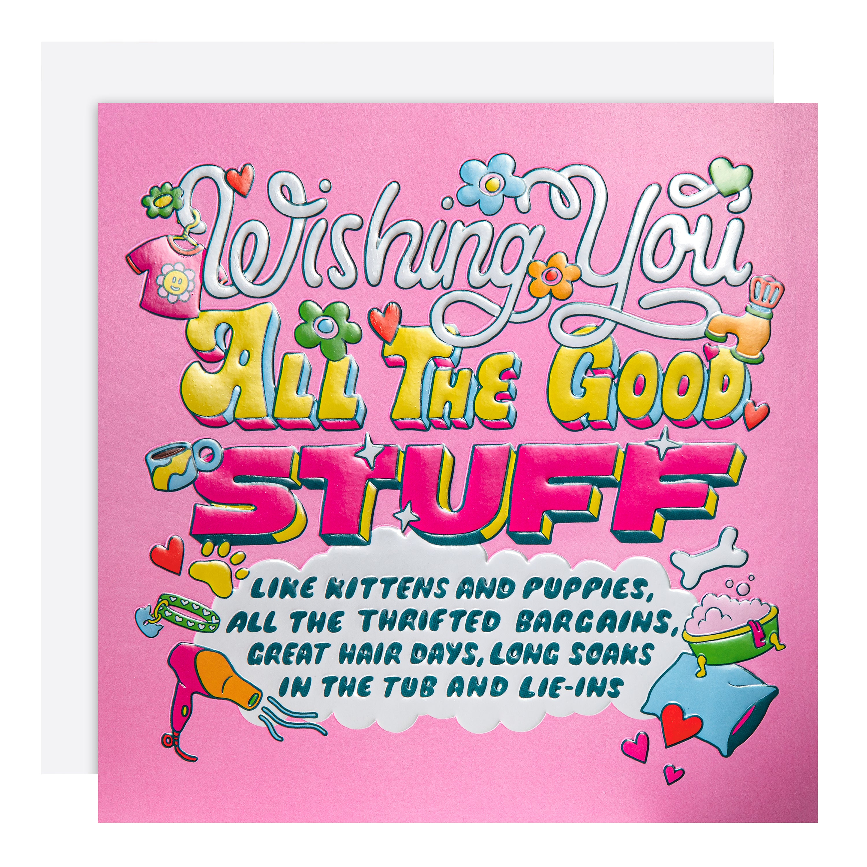 Send a special wish for all the good stuff, on their birthday or any other day, with this colourful and fun, text-led card from the exclusive Liz Harry collection.