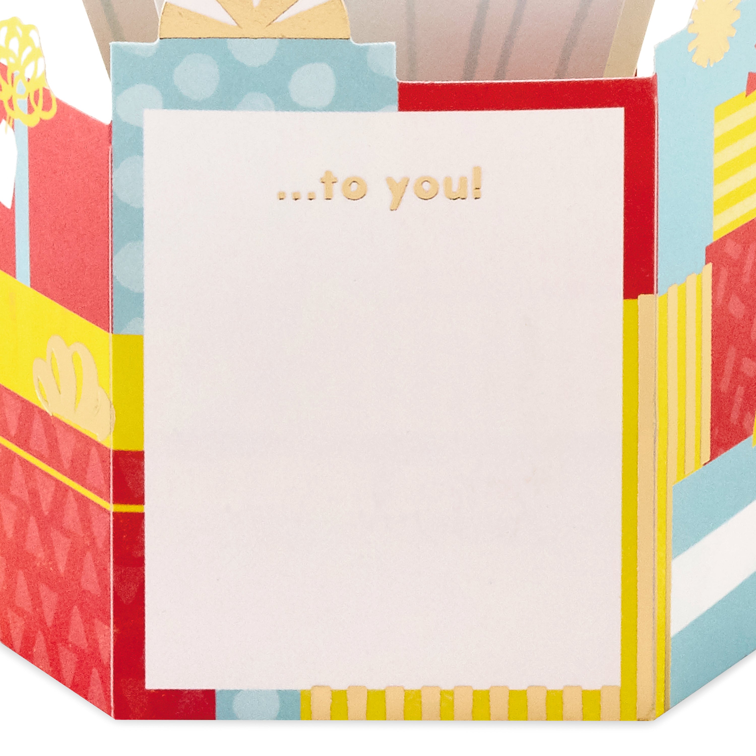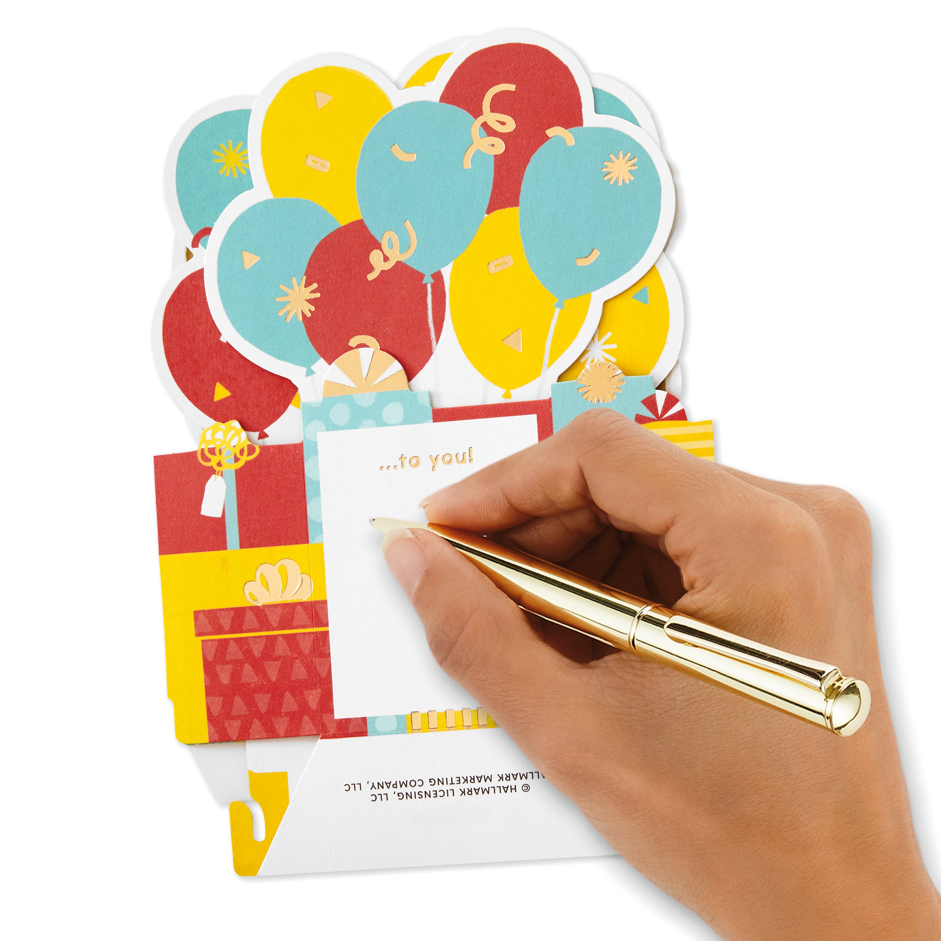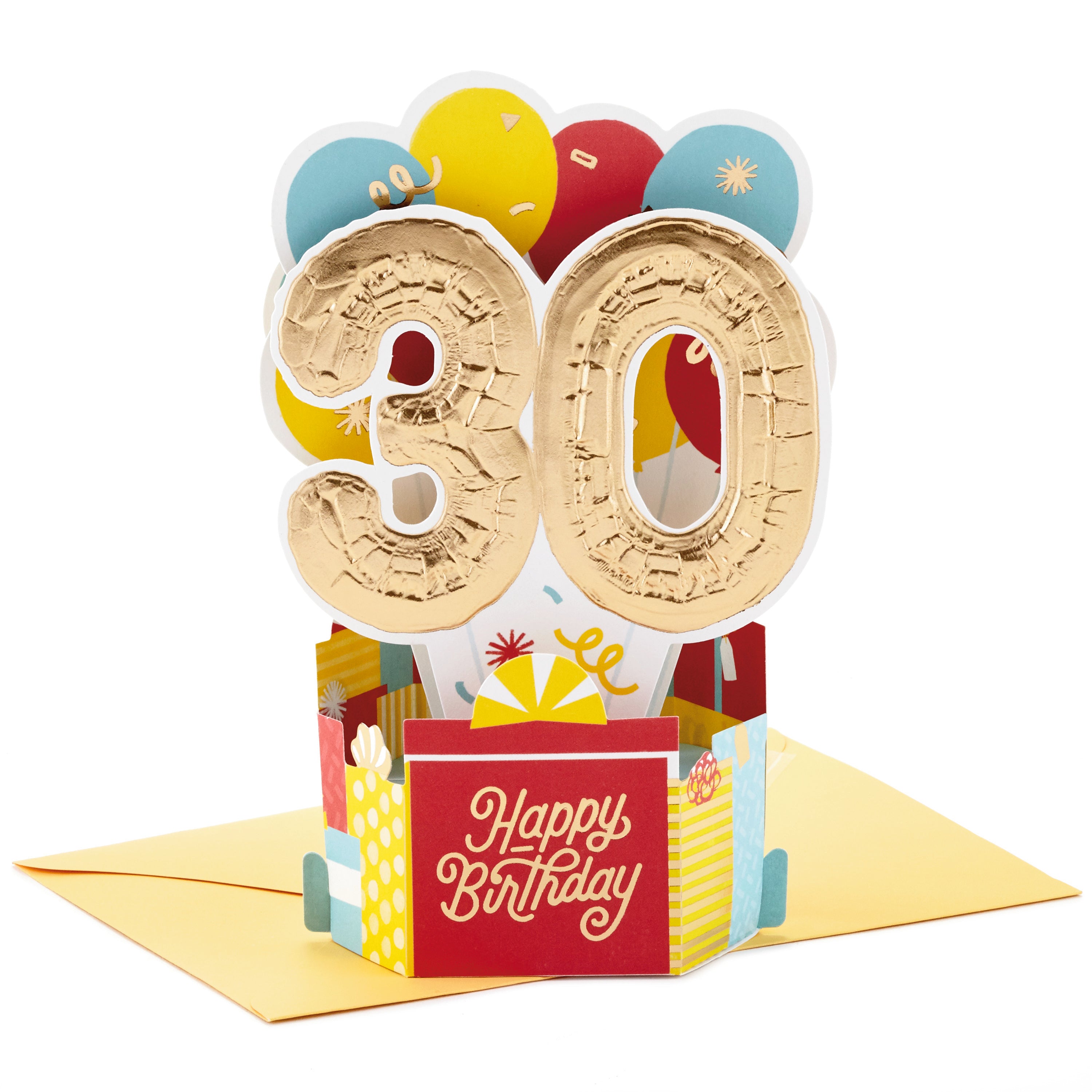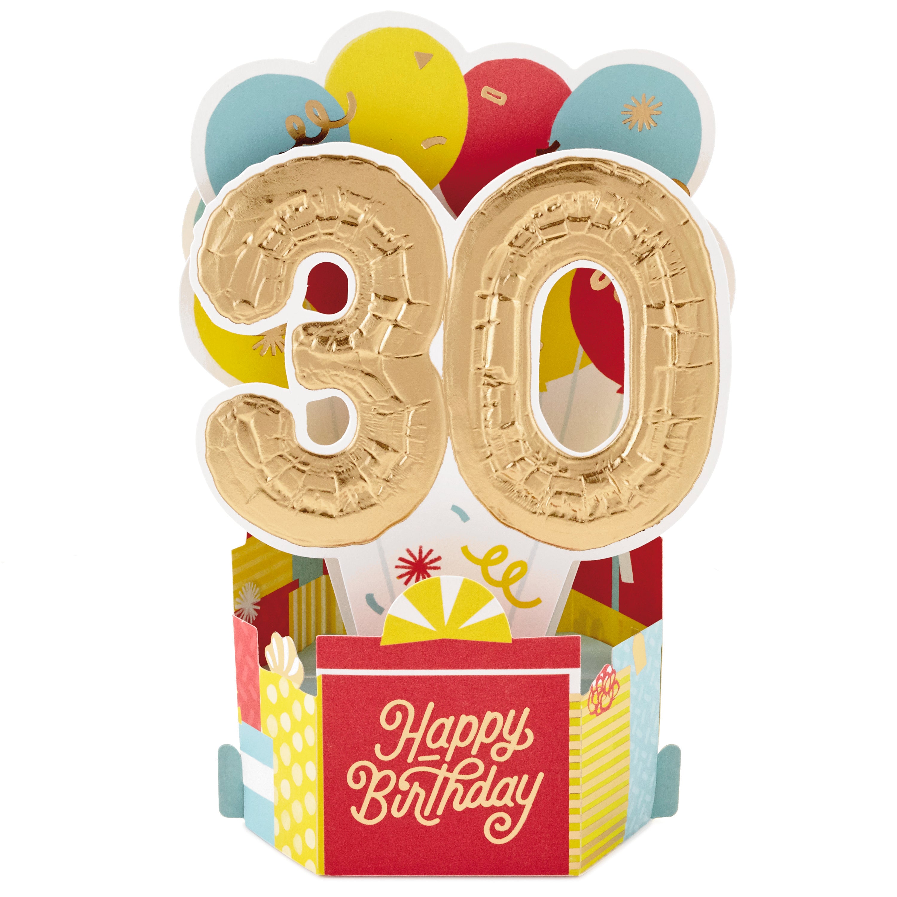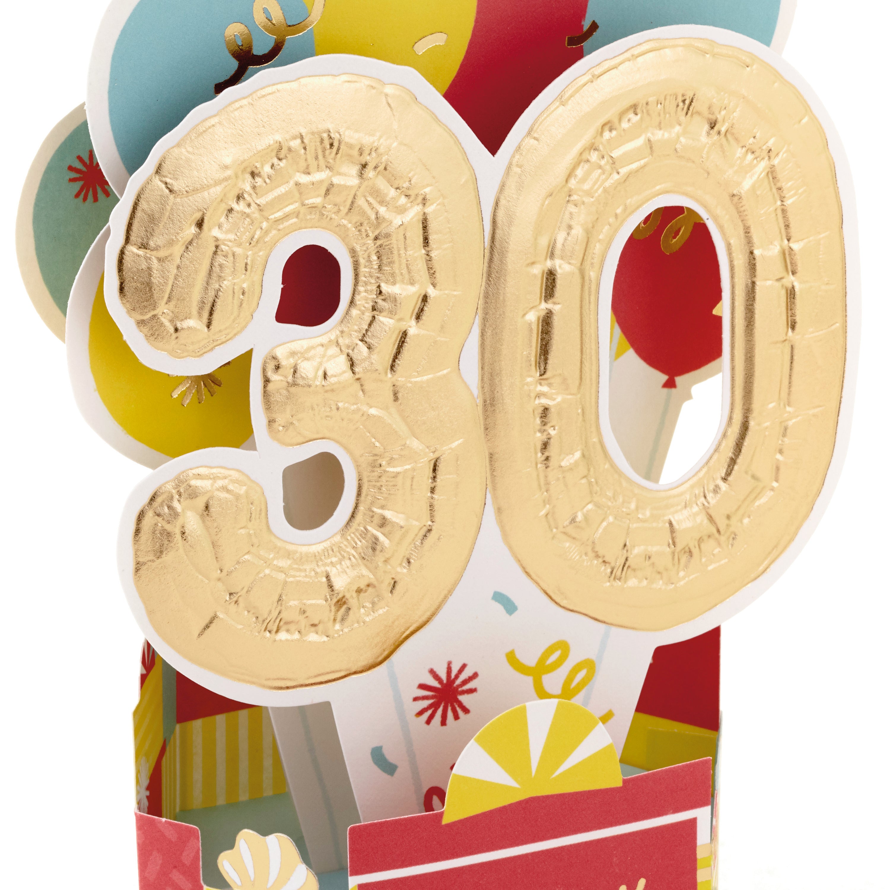Printed on high quality board, with a simple, squeeze-to-pop-up mechanism, this fun card features a bold die-cut, 3D, yellow, red and blue balloons design, with gold-foil 30 feature and lettering, and comes complete with a Hallmark branded, yellow envelope.