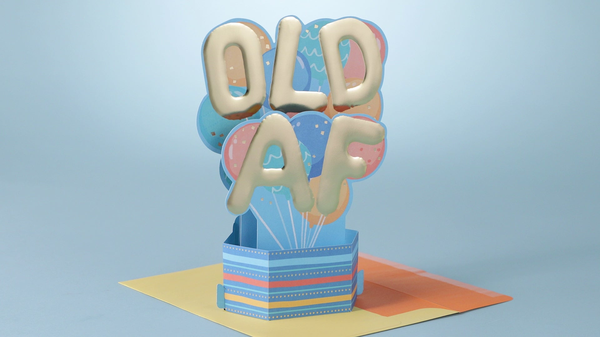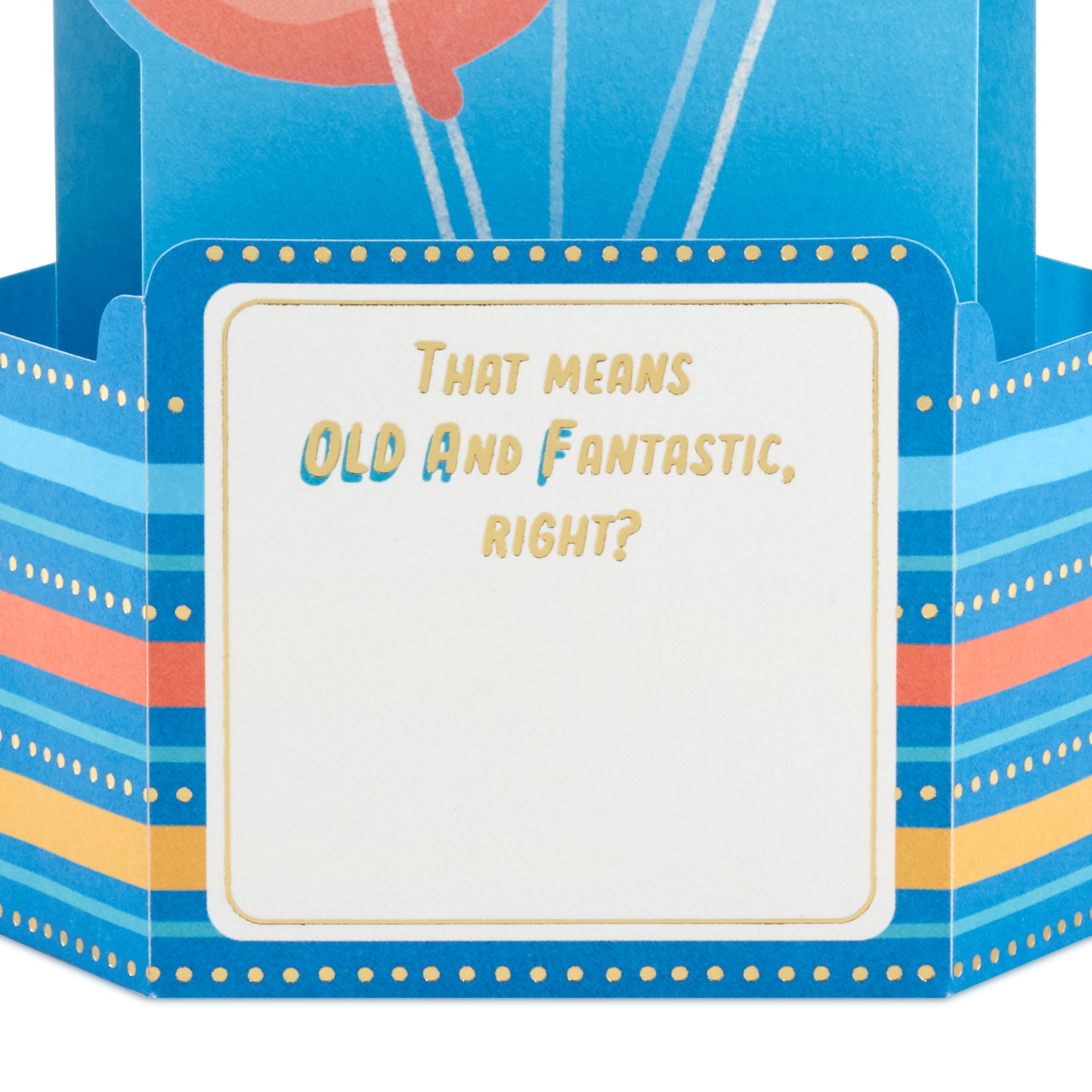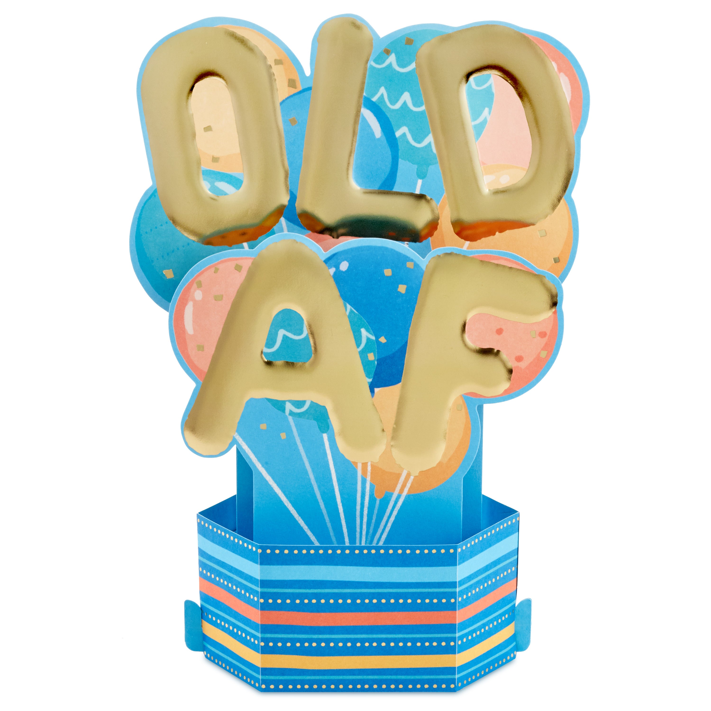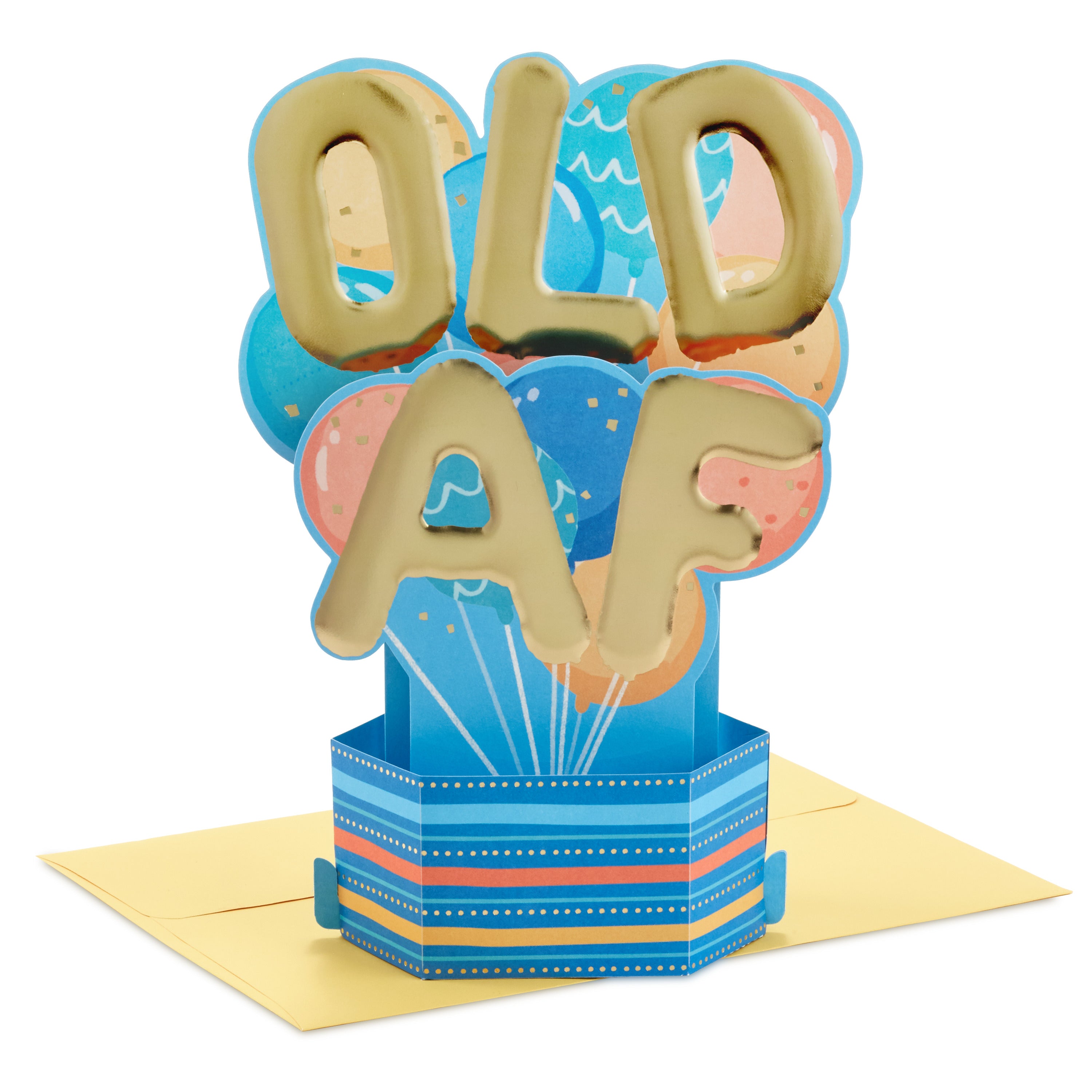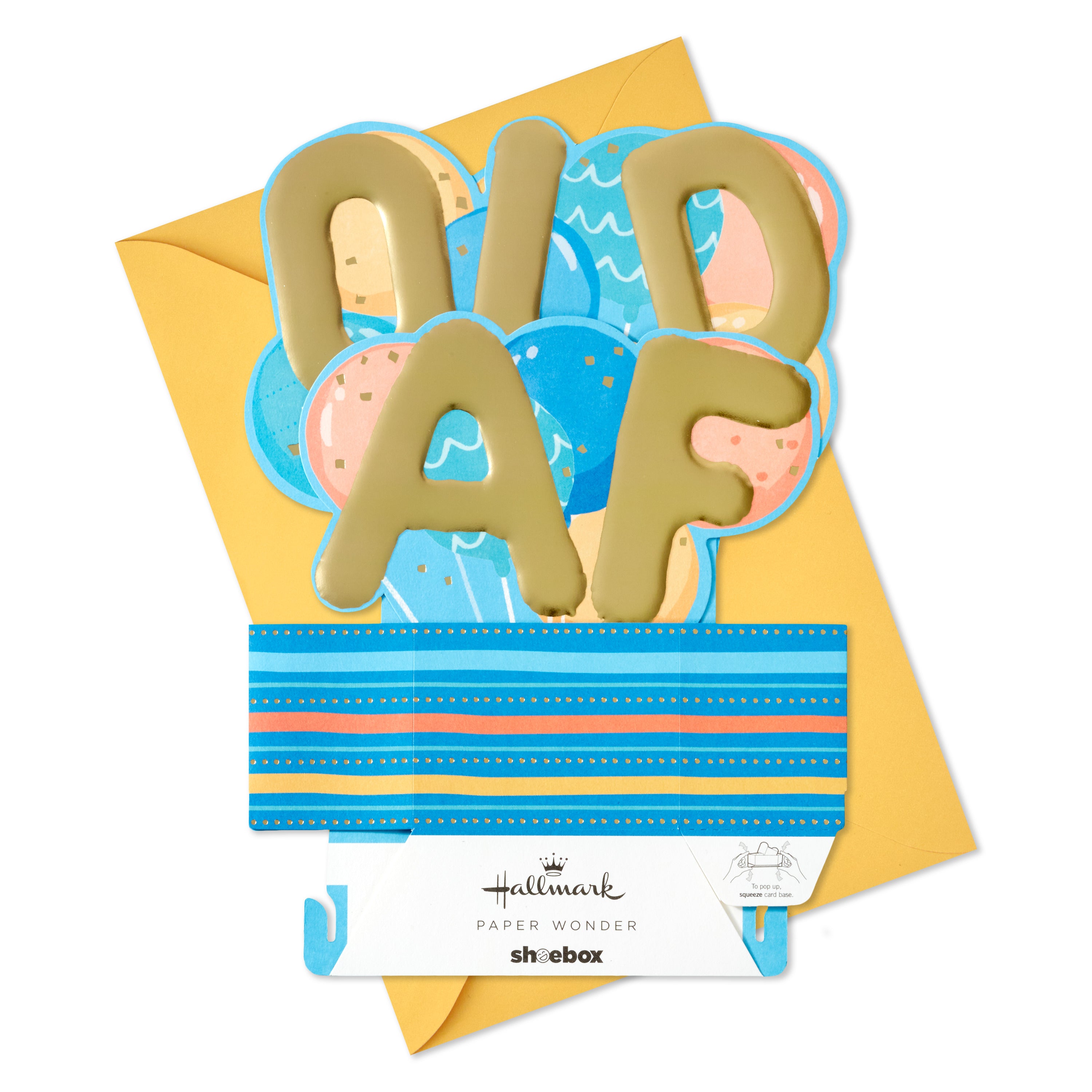 Printed on high quality board, with a simple, squeeze-to-pop-up mechanism, this fun card features a bold die-cut, 3D, letter balloons design, with gold-foil design details, and comes complete with a Hallmark branded, yellow envelope.