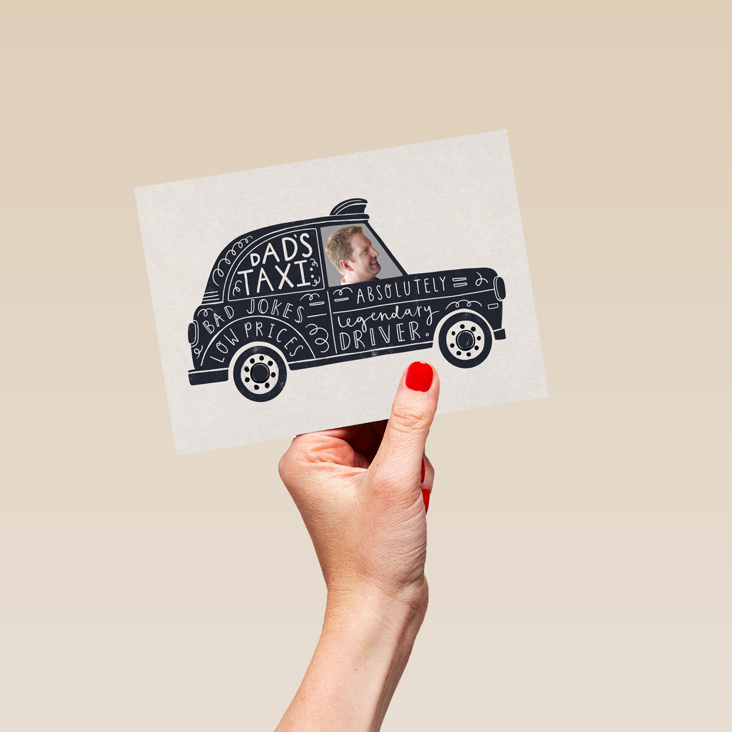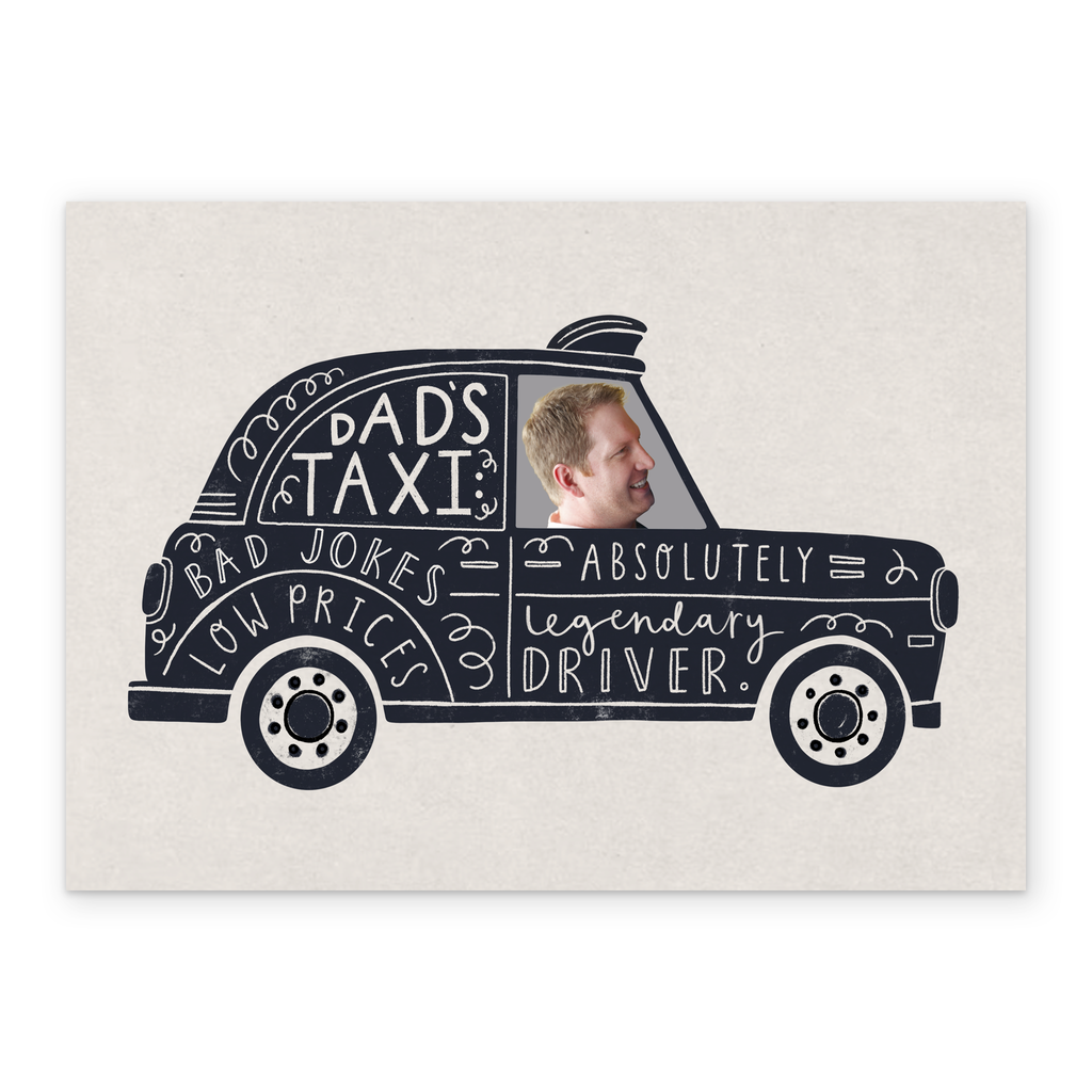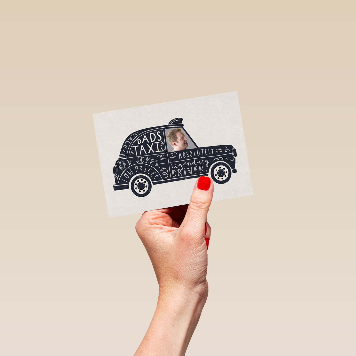 Printed on premium-quality board, this card features a classic black cab taxi, with the message 'Dad's Taxi. Bad jokes, low prices, absolutely legendary driver', space to upload a photo, and comes complete with a co-ordinating white envelope.