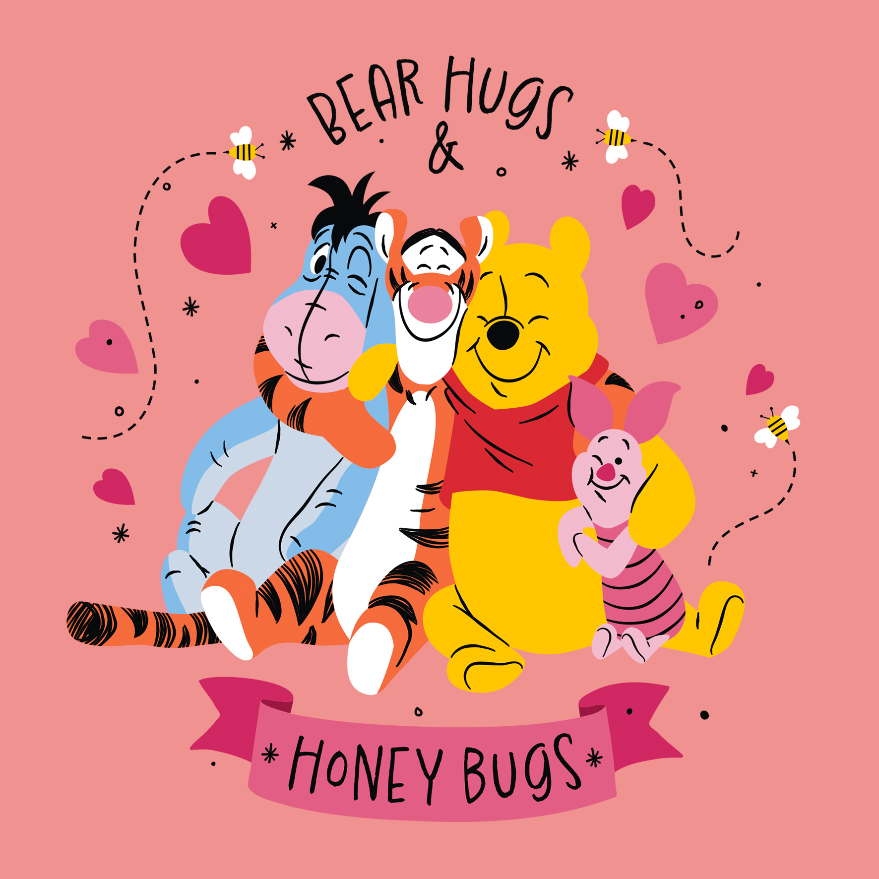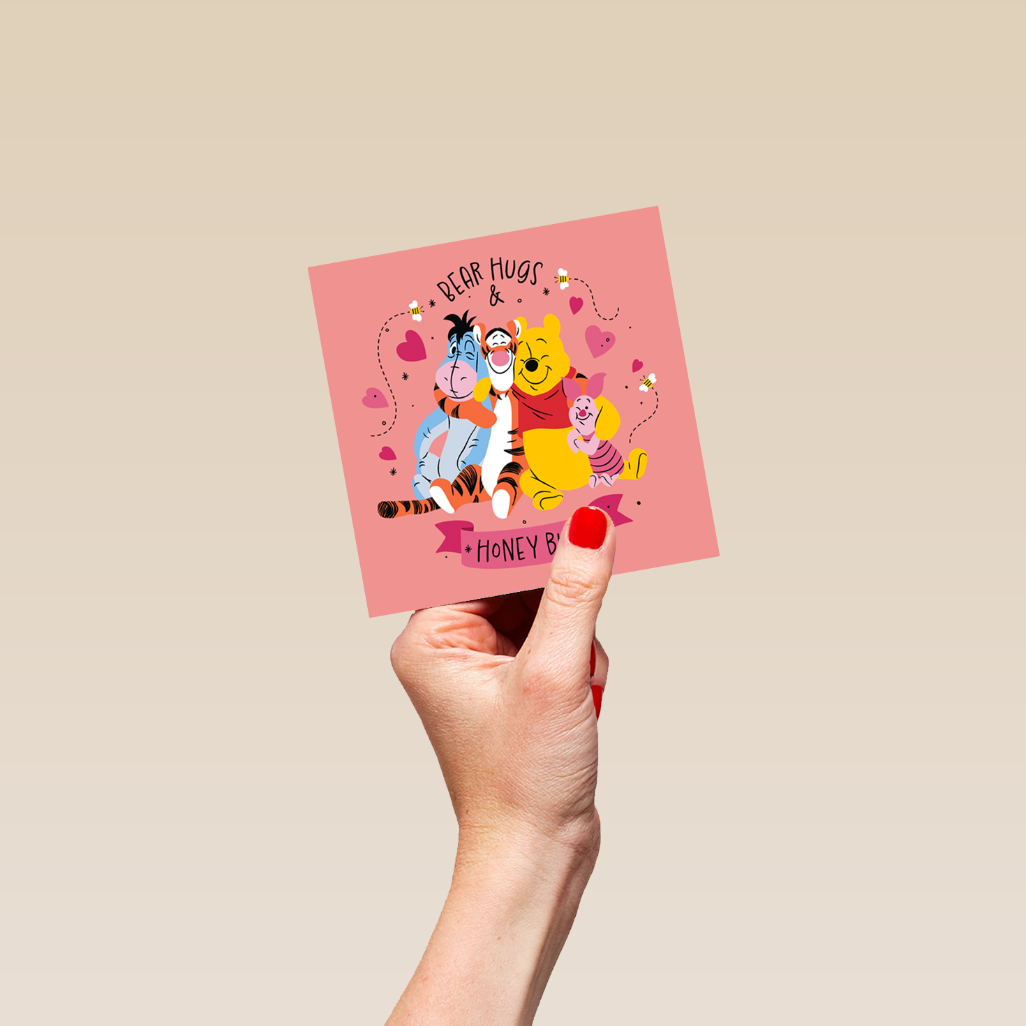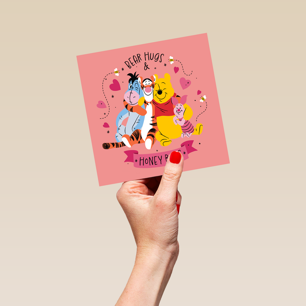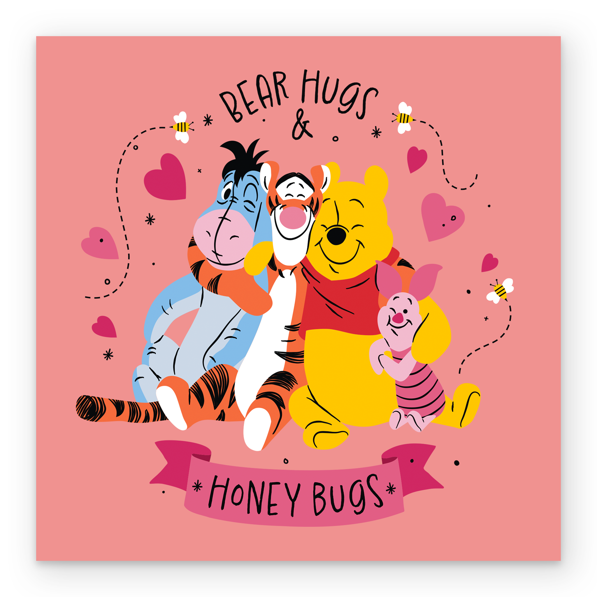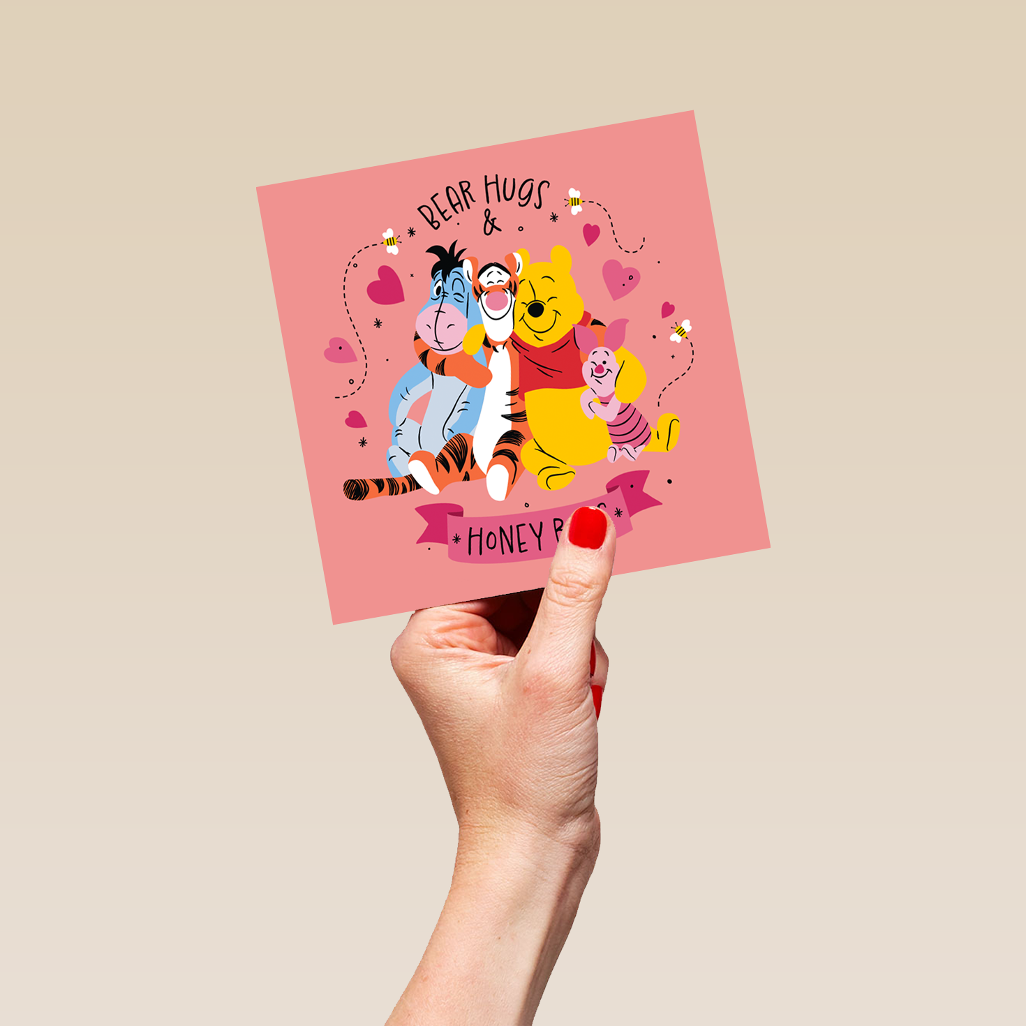 Printed on premium-quality board, this card features a cute illustration of Winnie the Pooh, Piglet, Tigger and Eeyore in a tight hug and surrounded by hearts, with the message 'Bear Hugs & Honey Bugs', and comes complete with a co-ordinating white envelope.