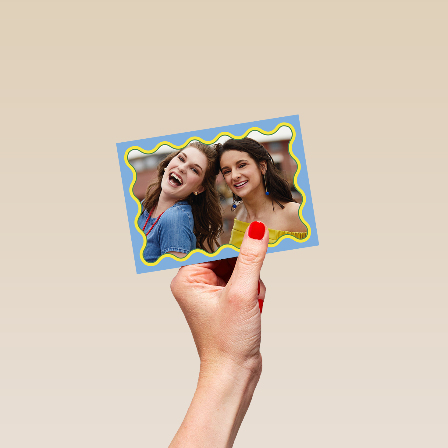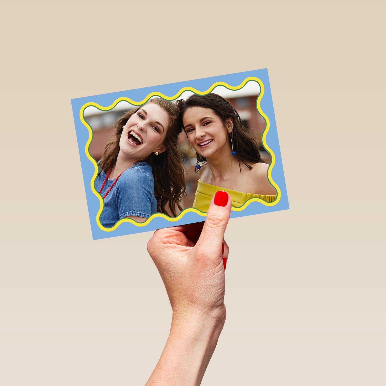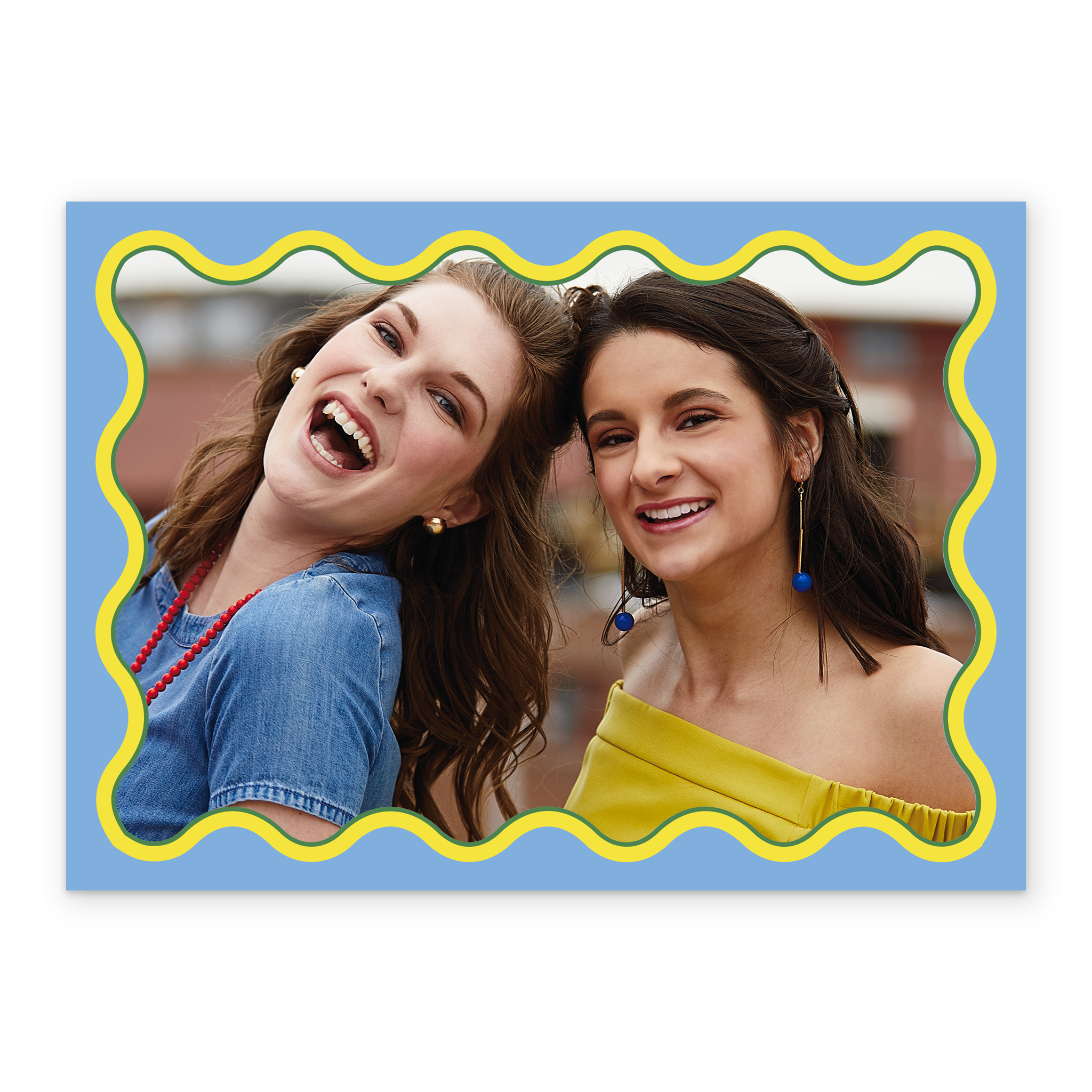 Printed on premium-quality board, this card features a blue and yellow squiggle border, space to upload a photo, and comes complete with a co-ordinating white envelope.