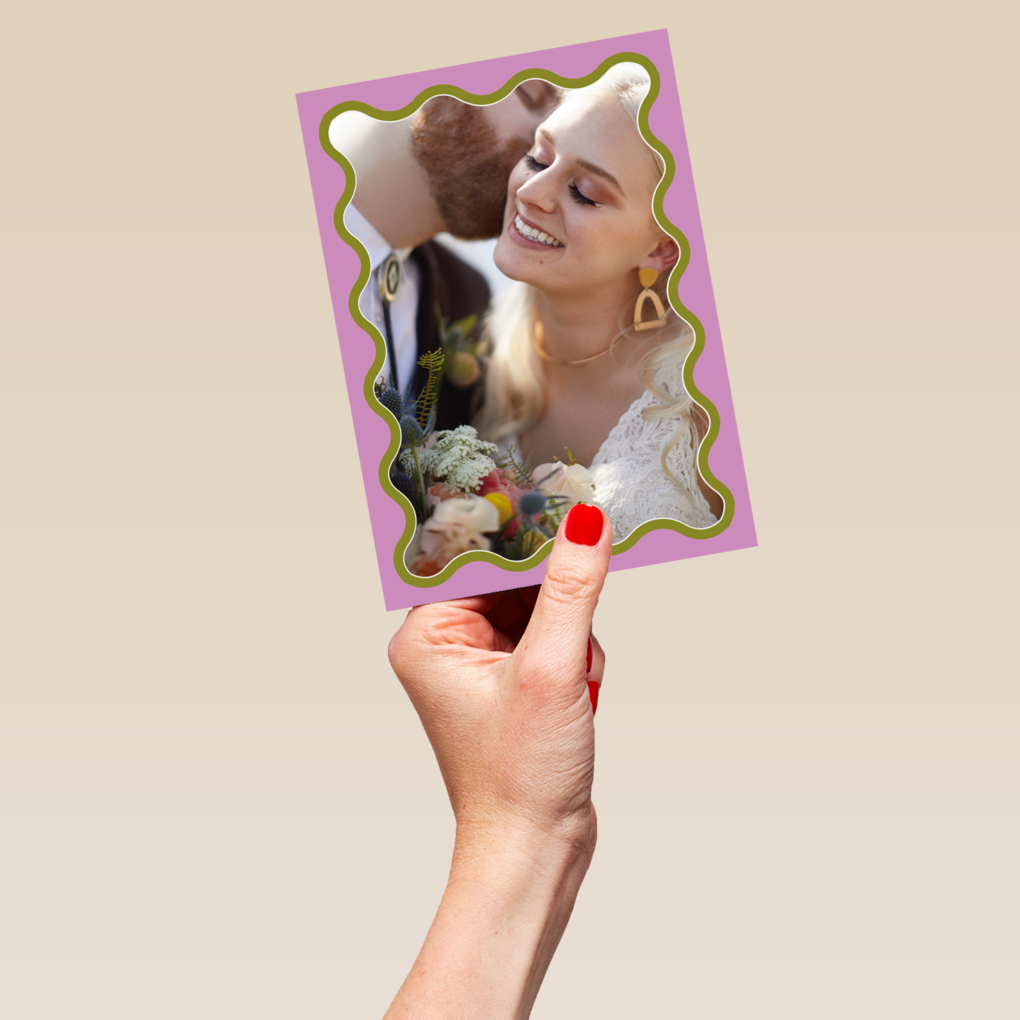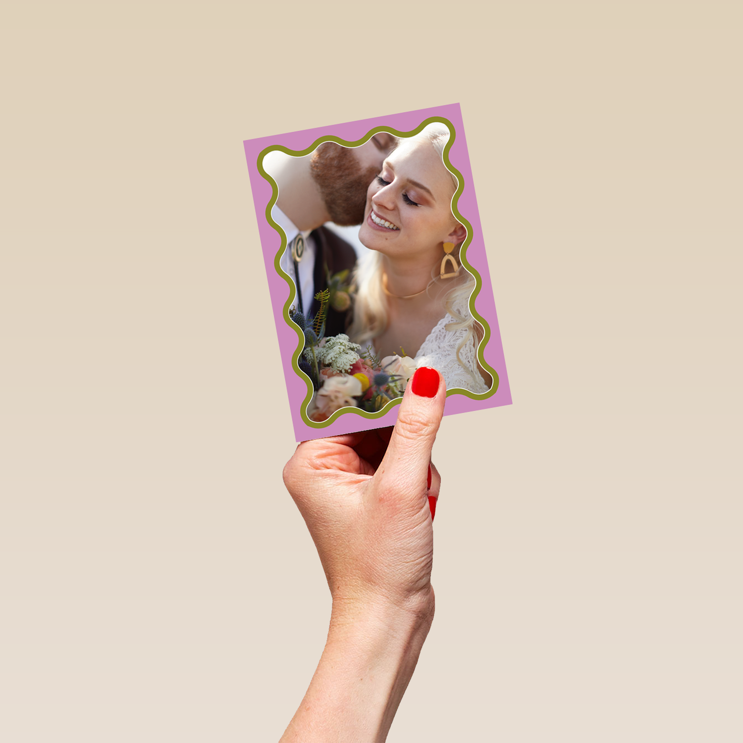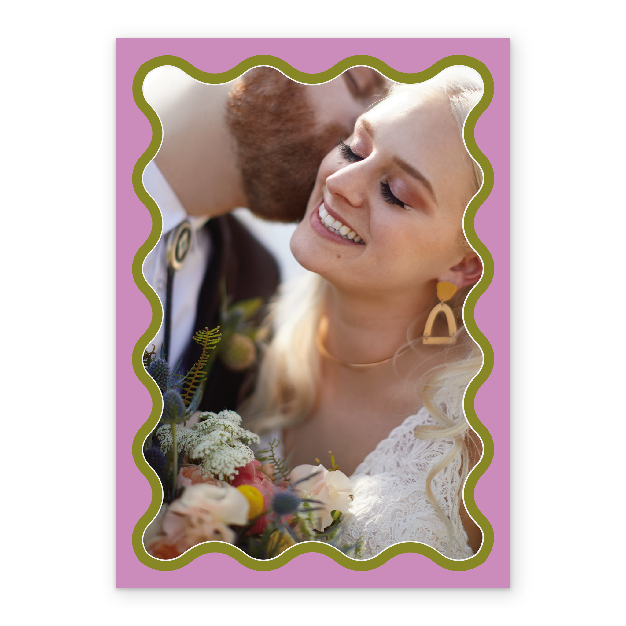 Printed on premium-quality board, this card features a pink and green squiggle border, space to upload a photo, and comes complete with a co-ordinating white envelope.