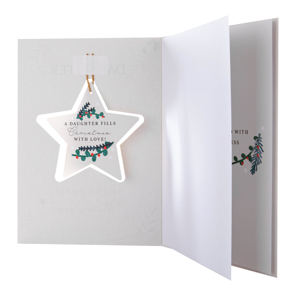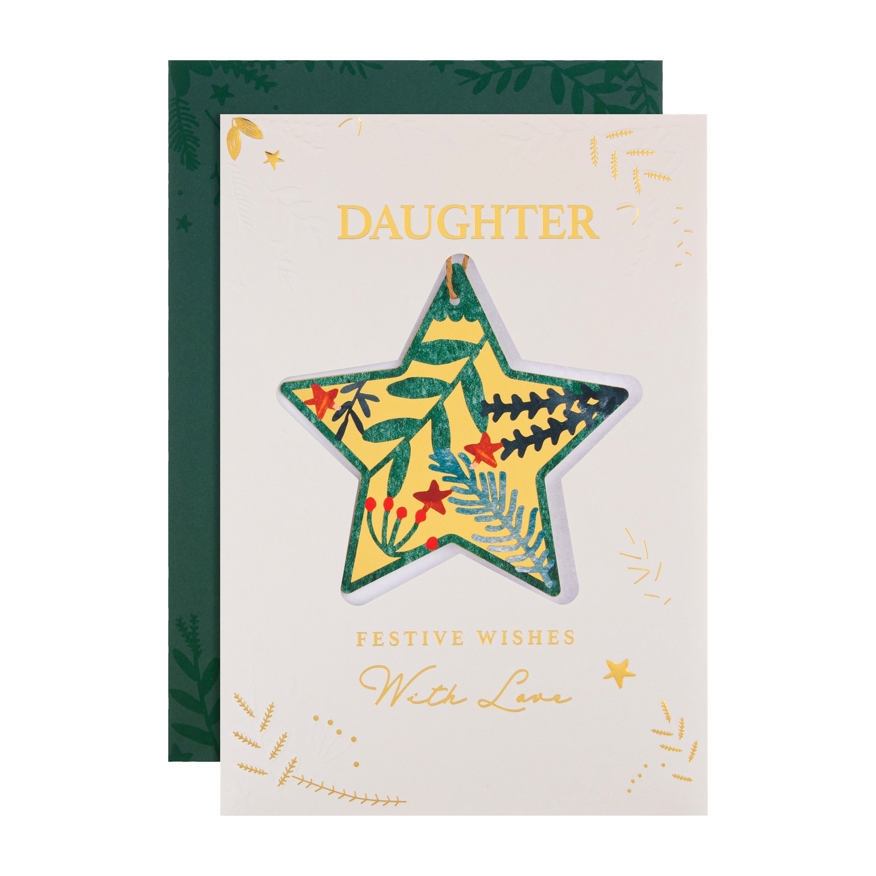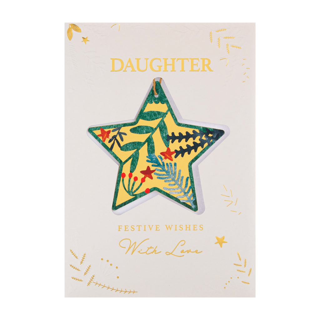 Printed on high-quality board, this Christmas card features traditional Christmas foliage and hanging star design, embossed elements, paper insert, metallic gold foil details, and the message, 'Daughter, festive wishes with love' on the front, and a detachable keepsake die-cut star shape hanging attachment with 3D die-cut embellishment and brown paper twine. This card comes complete with a co-ordinating Hallmark branded, green patterned envelope.