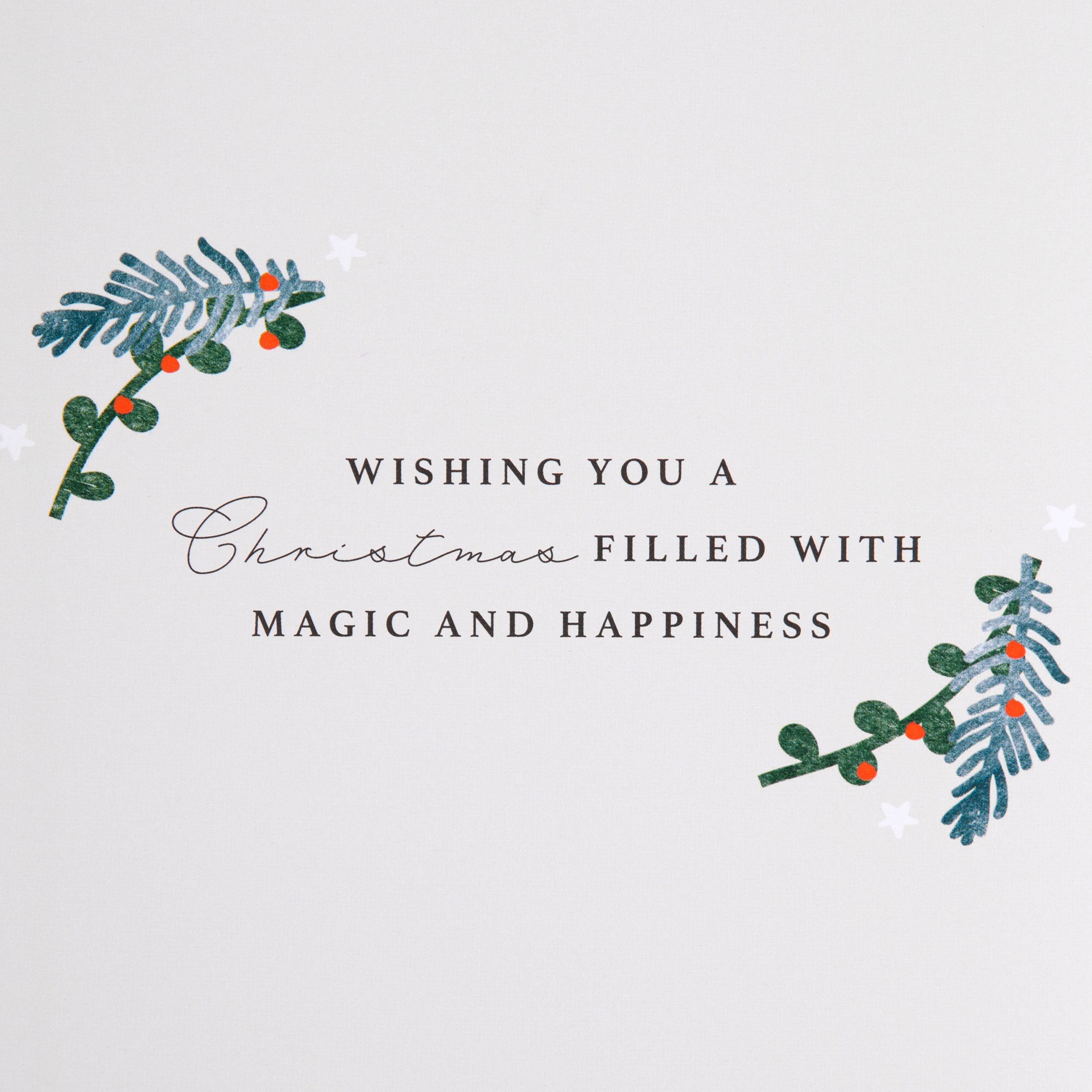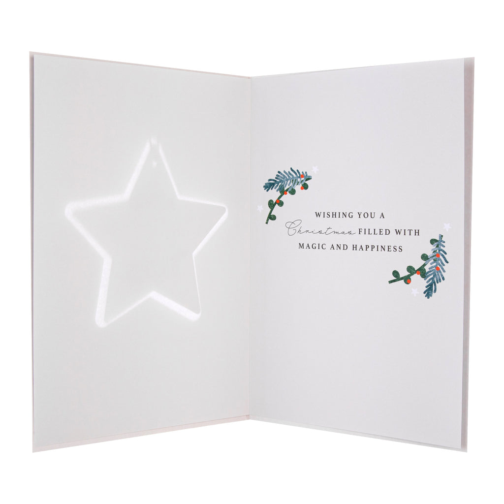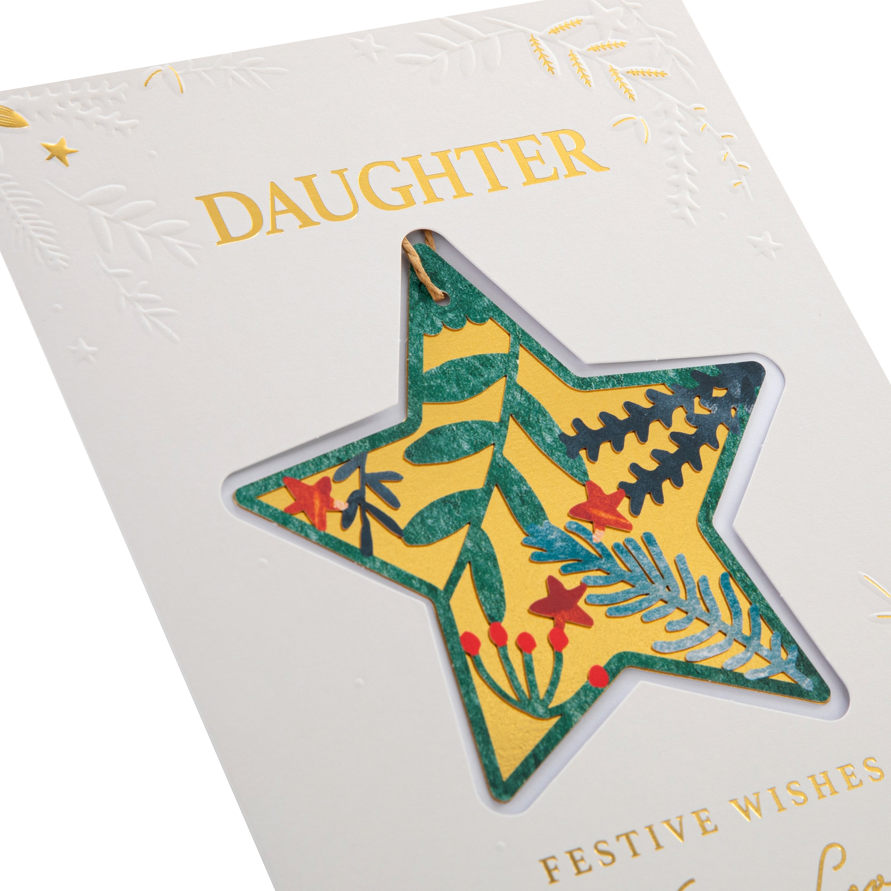 Printed on high-quality board, this Christmas card features traditional Christmas foliage and hanging star design, embossed elements, paper insert, metallic gold foil details, and the message, 'Daughter, festive wishes with love' on the front, and a detachable keepsake die-cut star shape hanging attachment with 3D die-cut embellishment and brown paper twine. This card comes complete with a co-ordinating Hallmark branded, green patterned envelope.