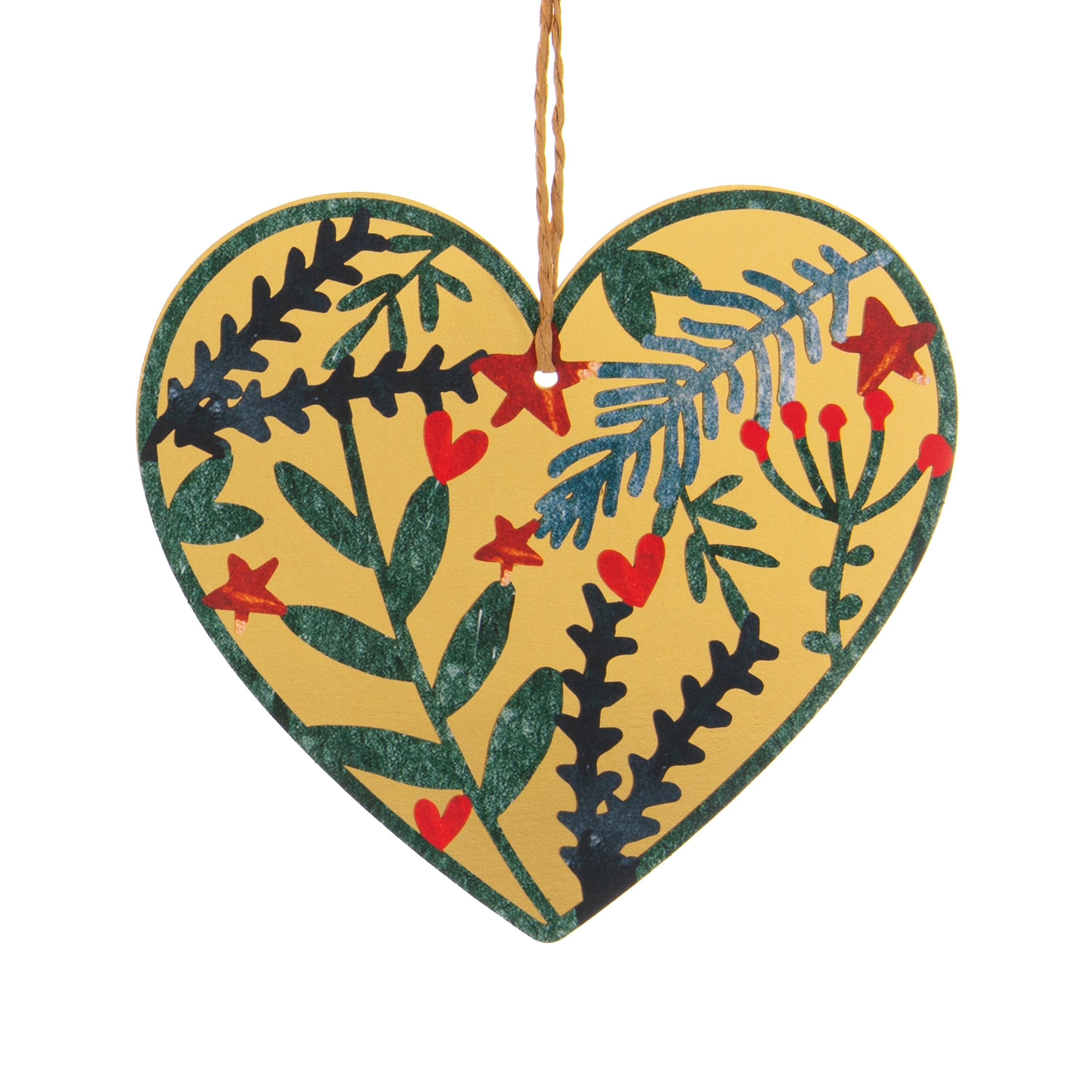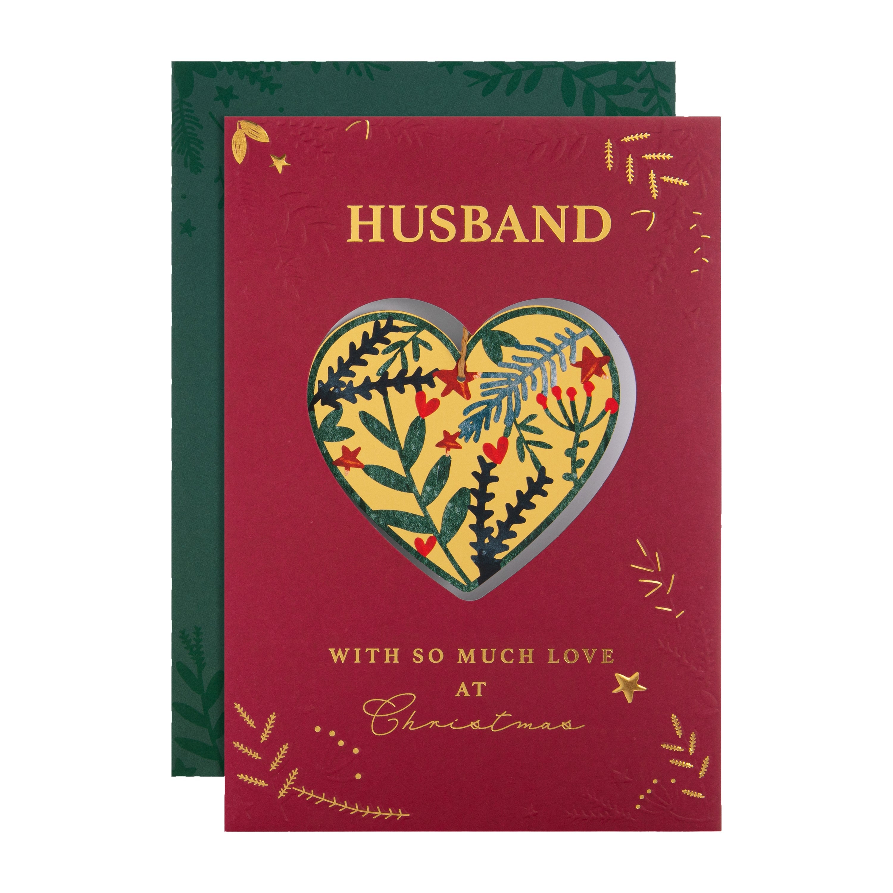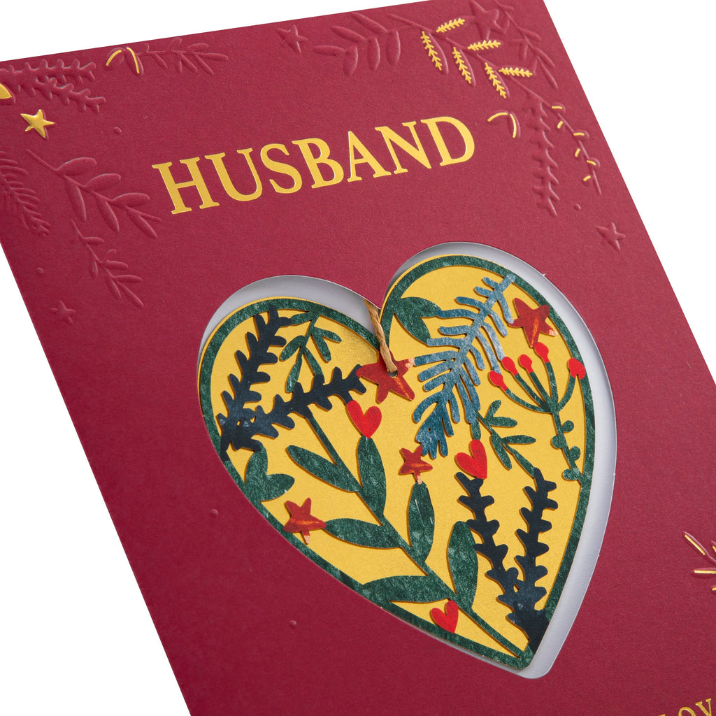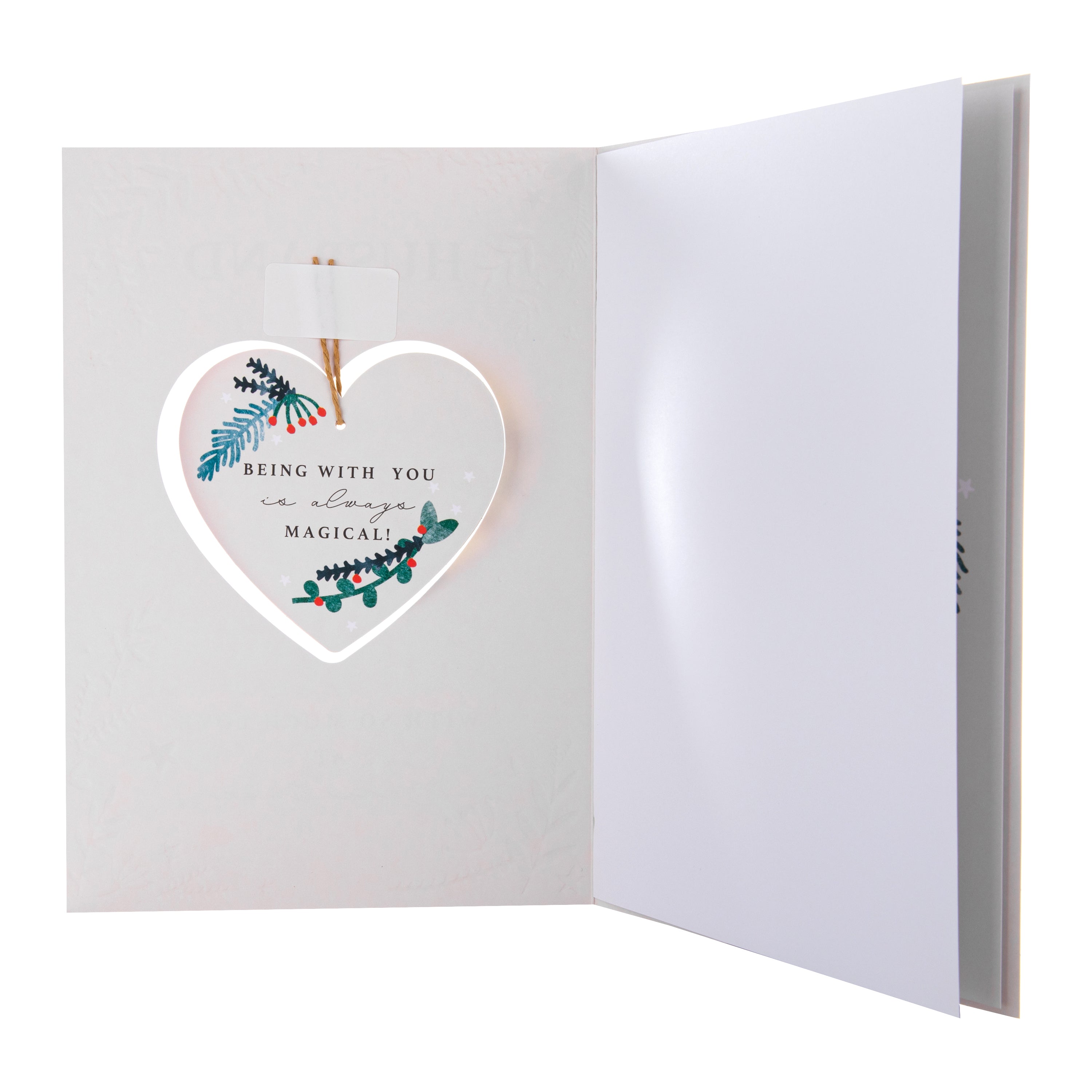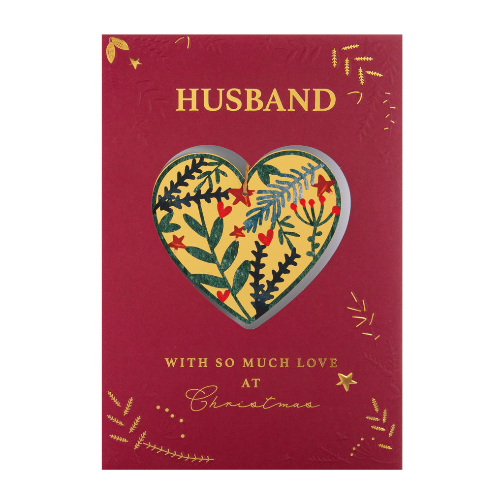 Printed on high-quality board, this Christmas card features traditional Christmas foliage and hanging heart design, embossed elements, paper insert, metallic gold foil details, and the message, 'Husband, with so much love at Christmas' on the front, and a detachable keepsake die-cut heart shape hanging attachment with 3D die-cut embellishment and brown paper twine. This card comes complete with a co-ordinating Hallmark branded, green patterned envelope.
