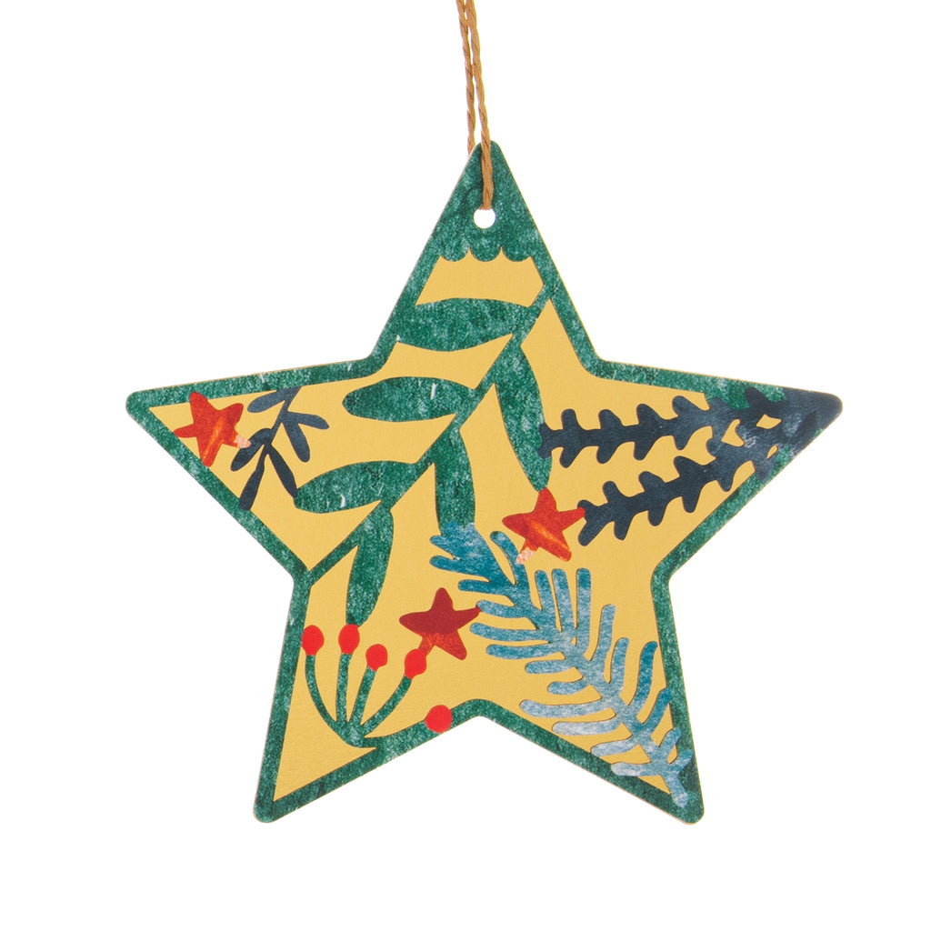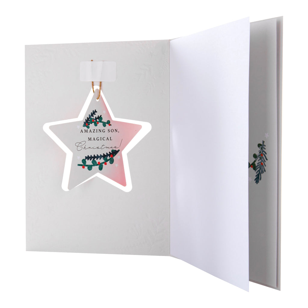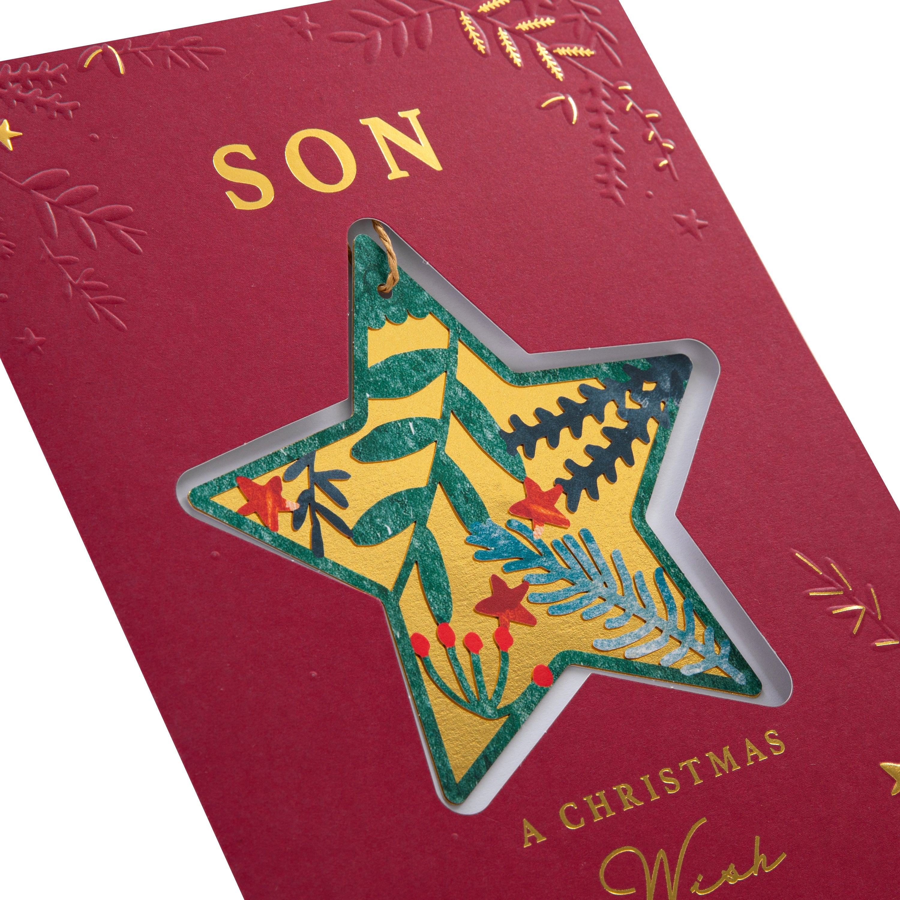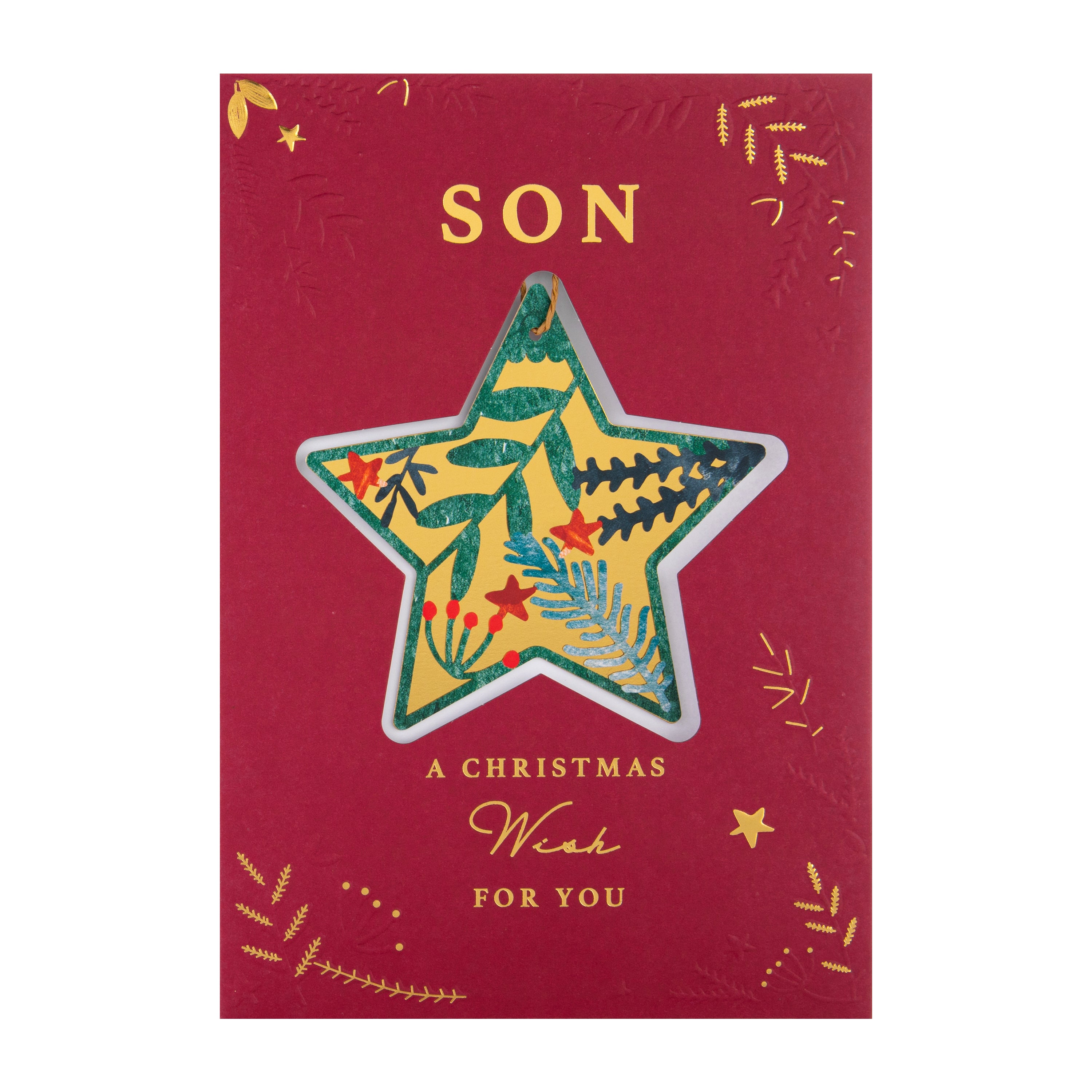 Printed on high-quality board, this Christmas card features traditional Christmas foliage and hanging star design, embossed elements, paper insert, metallic gold foil details, and the message, 'Son, a Christmas wish for you' on the front, and a detachable keepsake die-cut star shape hanging attachment with 3D die-cut embellishment and brown paper twine. This card comes complete with a co-ordinating Hallmark branded, green patterned envelope.