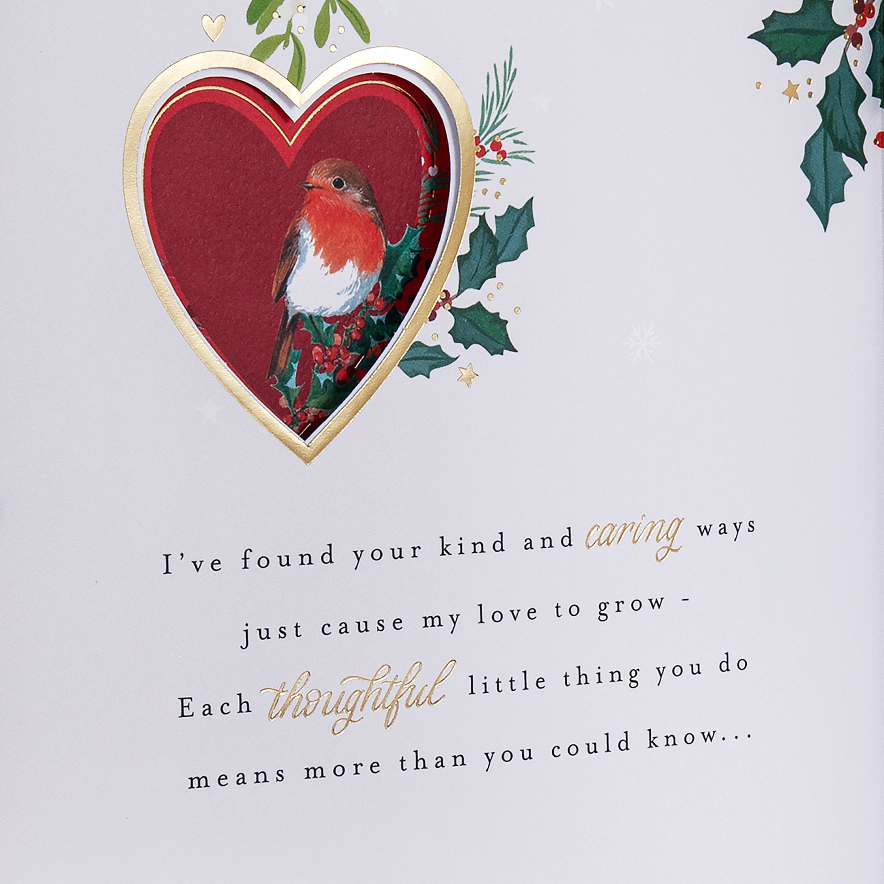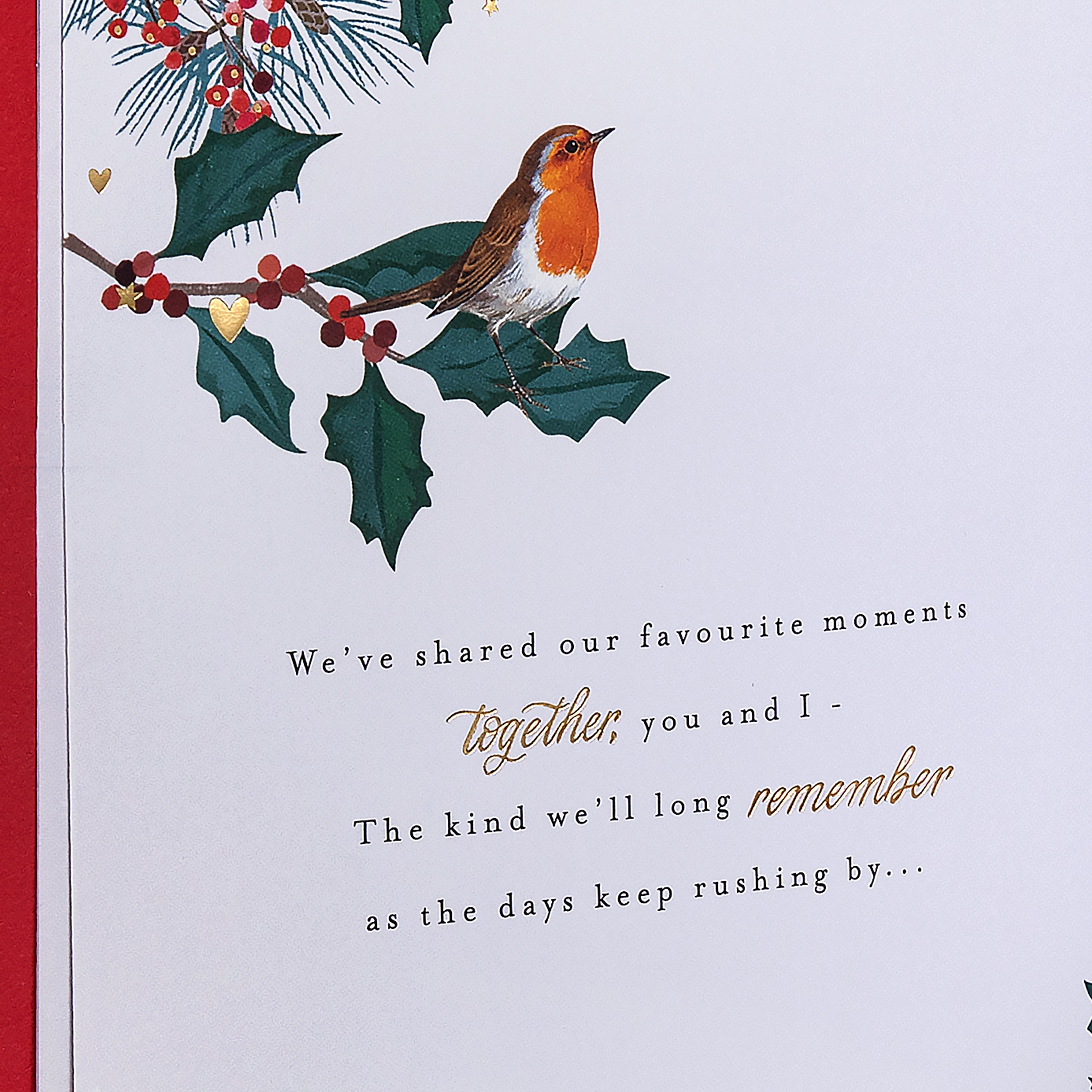 Message Inside: Your words can really cheer my heart, your smile lights up my life - You’ll never know the joy it brings to have you for my wife… I’ve found your kind and caring ways just cause my love to grow - Each thoughtful little thing you do means more than you could know… You’ve been there with your love and your unwavering loyalty - I’ll always be so thankful for the friend you are to me… We shared our favourite moments together, you and I - The kind we’ll long remember as the days keep rushing by…And so I want to tell you now that Christmas time is here - I feel so very lucky that I have your love all year. Here's to us as we celebrate another happy Christmas.
