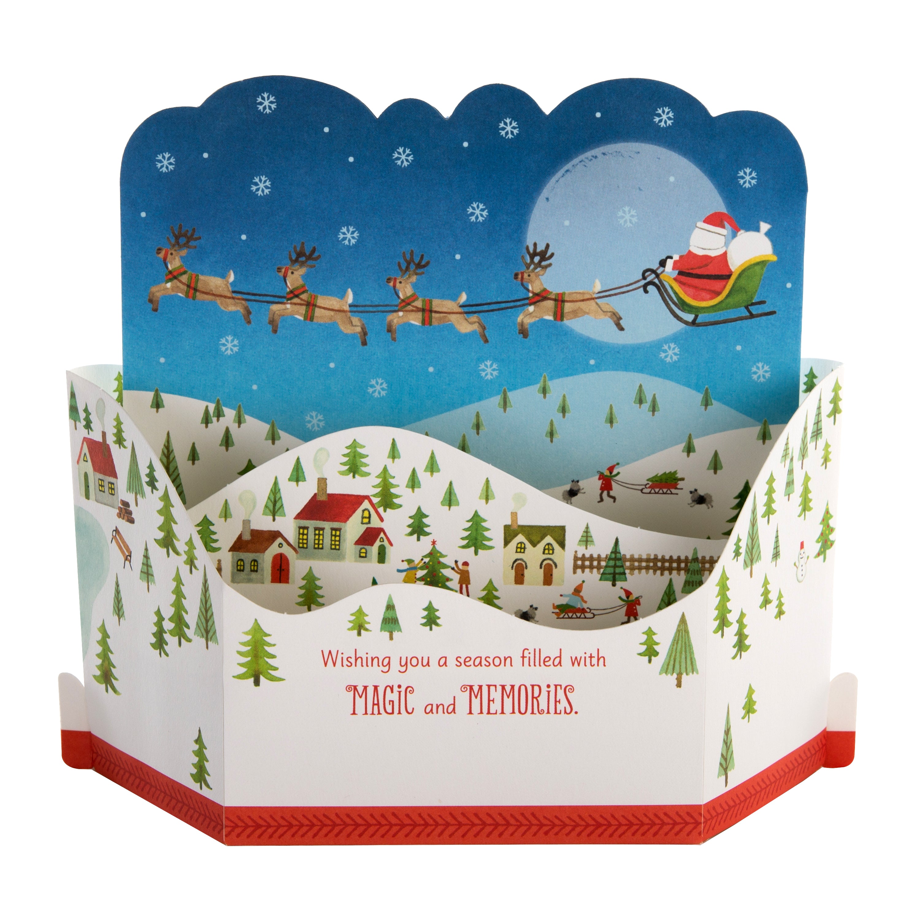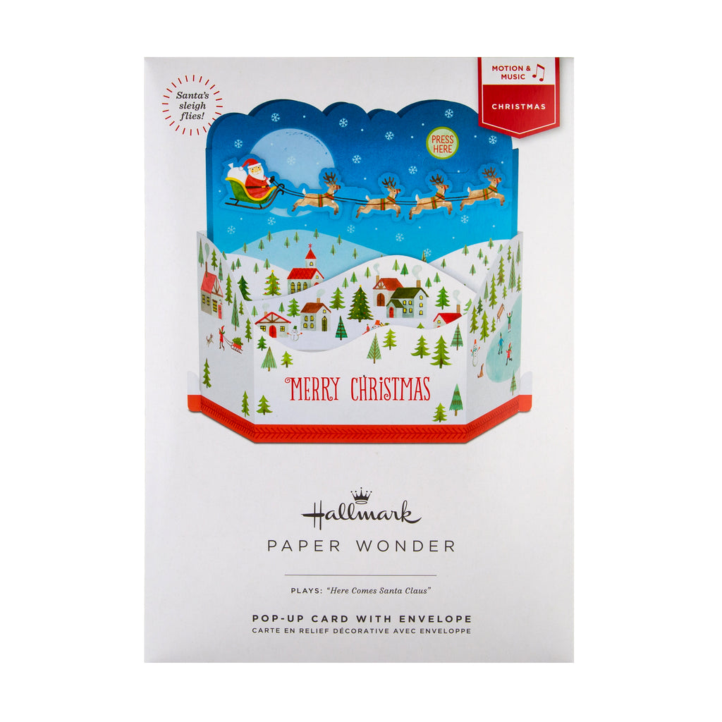 Printed on high-quality board, this card features a moving Santa flying through the Christmas sky with his reindeer, and a musical feature which plays 'Here Comes Santa Claus' by Oakley Haldeman and Gene Autry, and comes complete with a red, Hallmark branded envelope.
