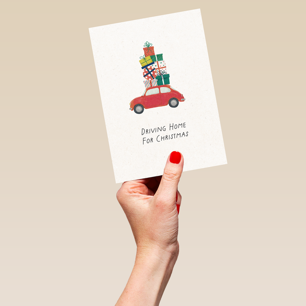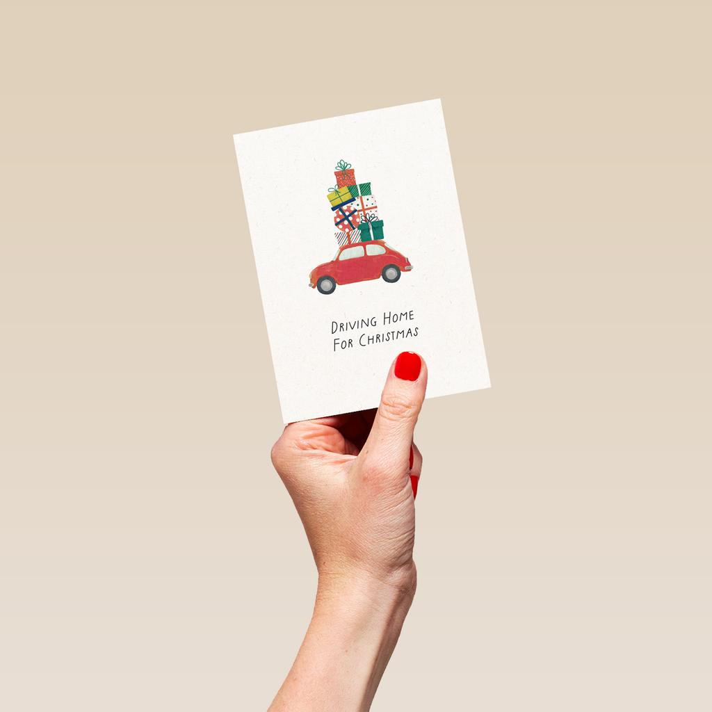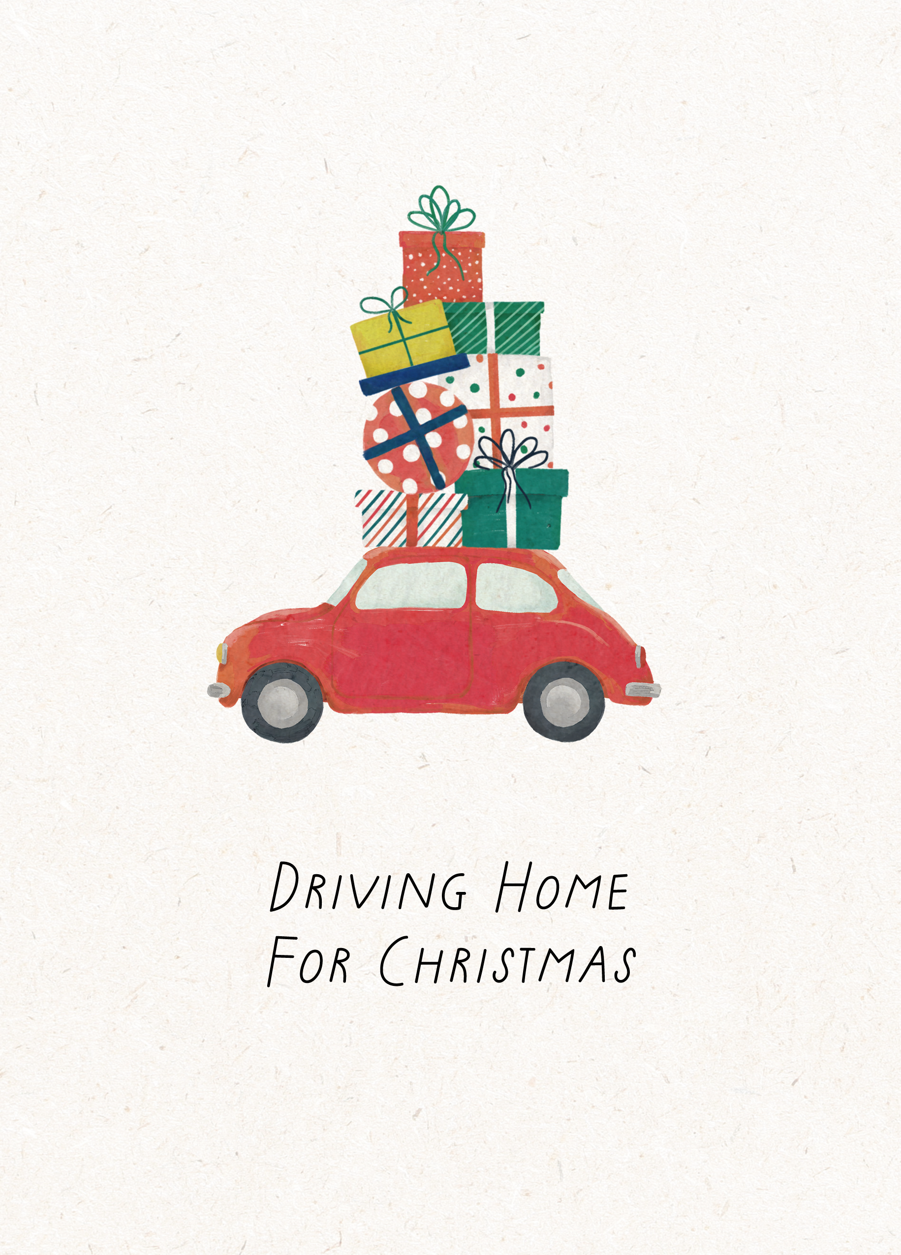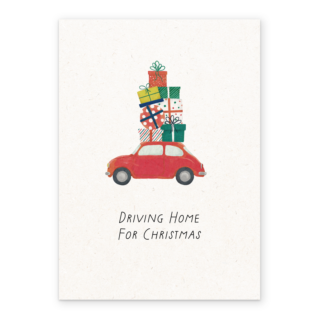 Printed on premium-quality board, this card features an illustration of a red car carrying Christmas presents on the roof, with the message 'Driving home for Christmas', and comes complete with a co-ordinating white envelope.