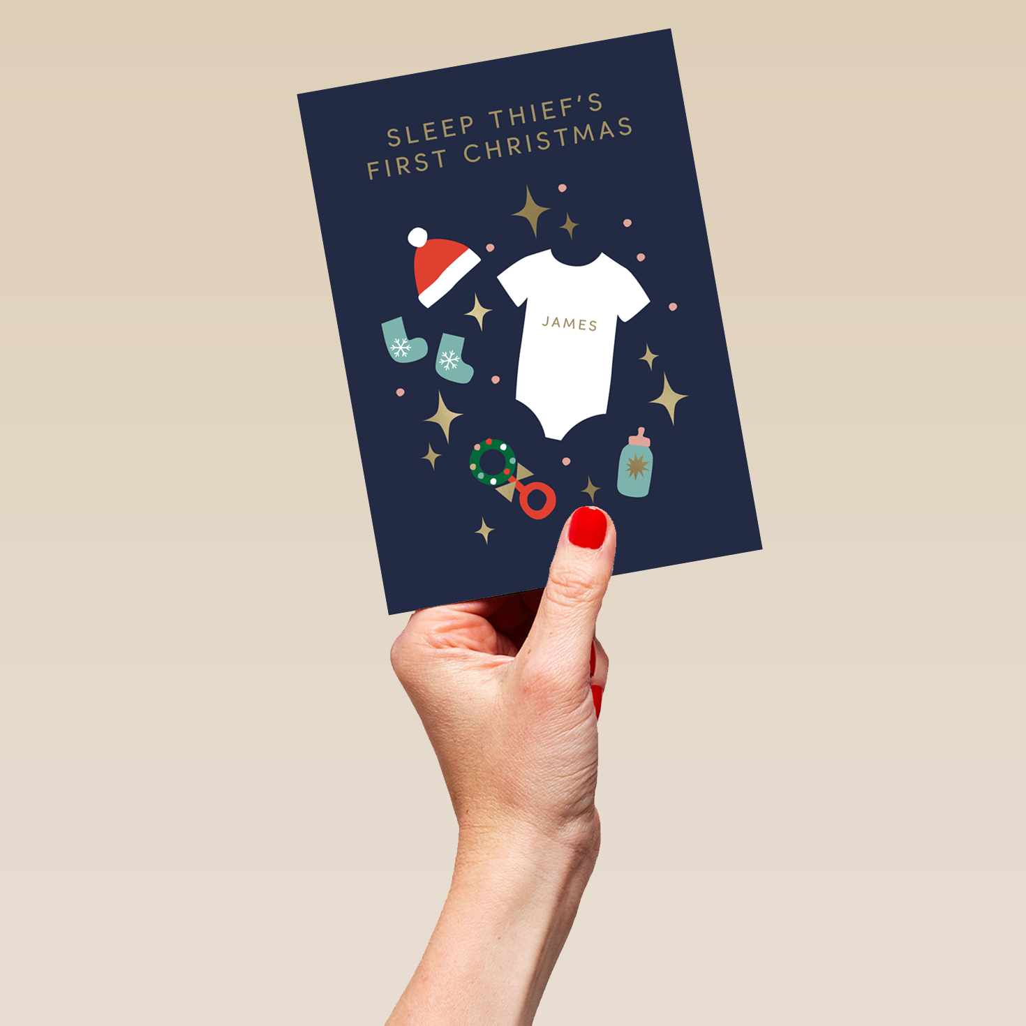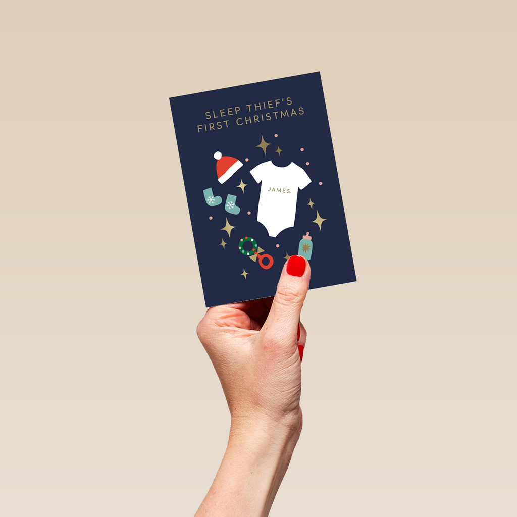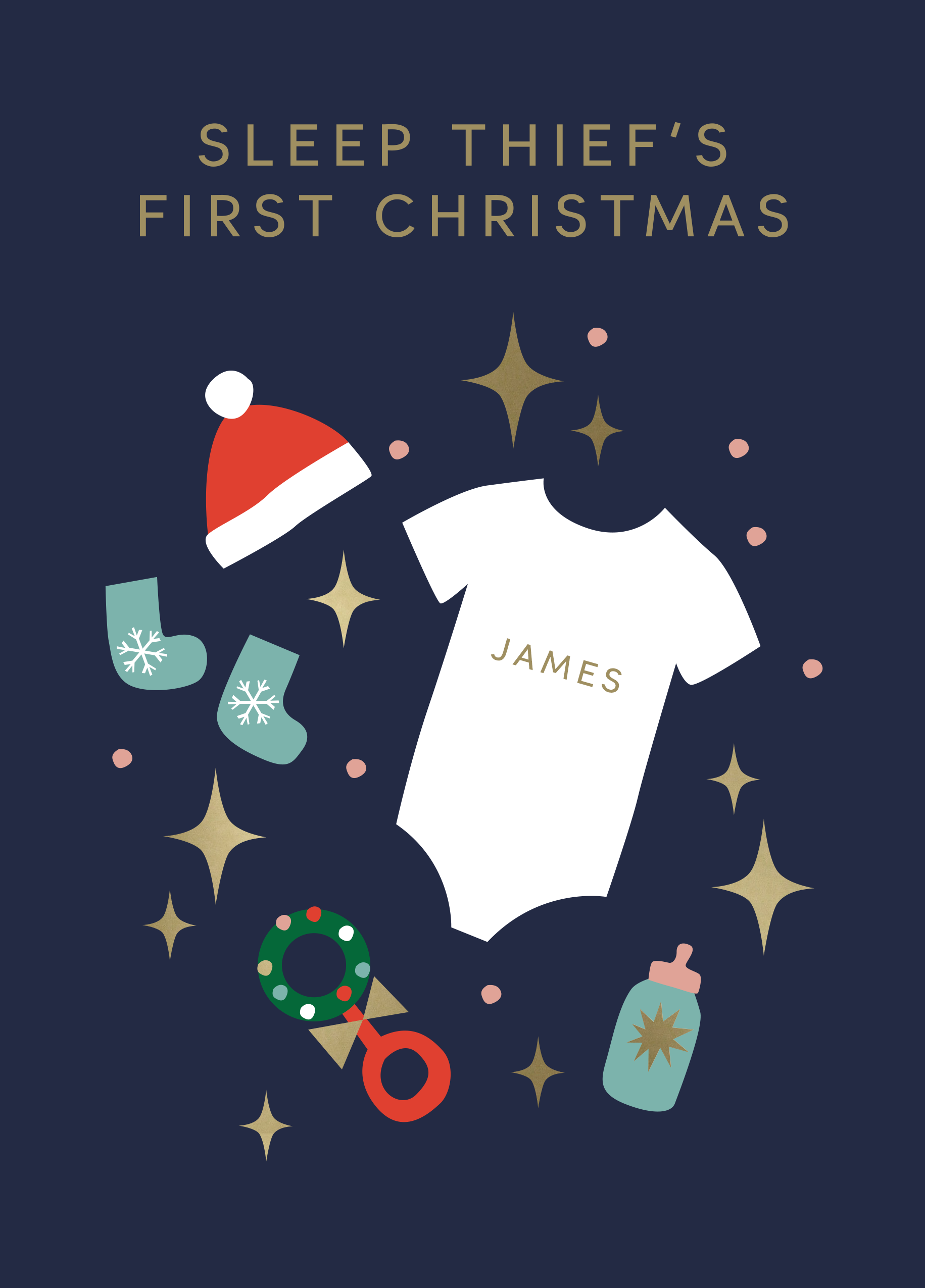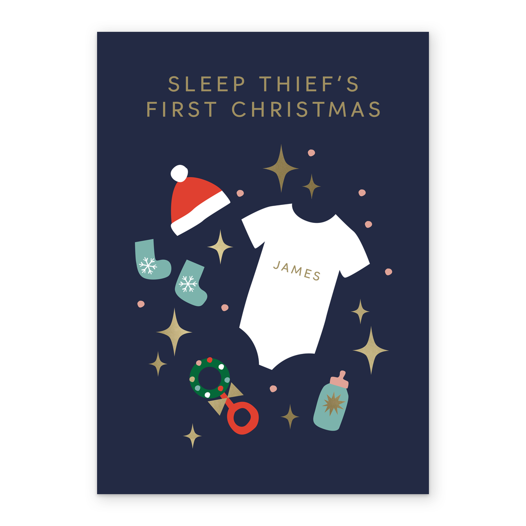 Printed on premium-quality board, this card features a cute illustration of a baby grow, baby socks, a shaker, bottle and Santa hat, with the message 'Sleep thief's first Christmas', space to personalise your message, and comes complete with a co-ordinating white envelope.