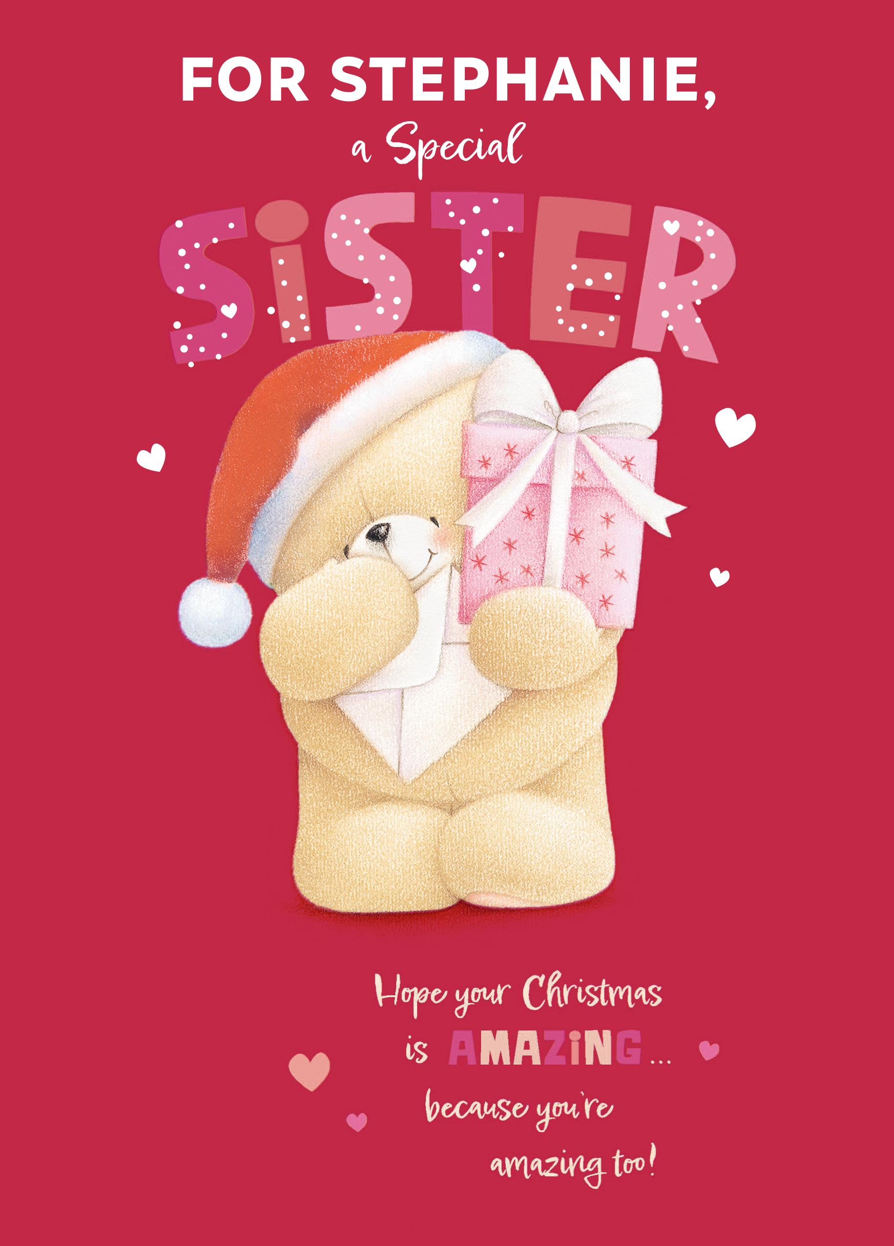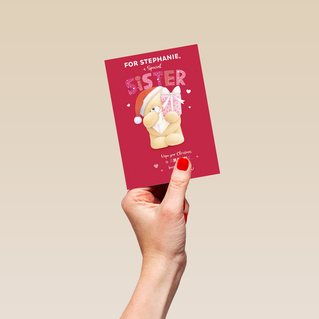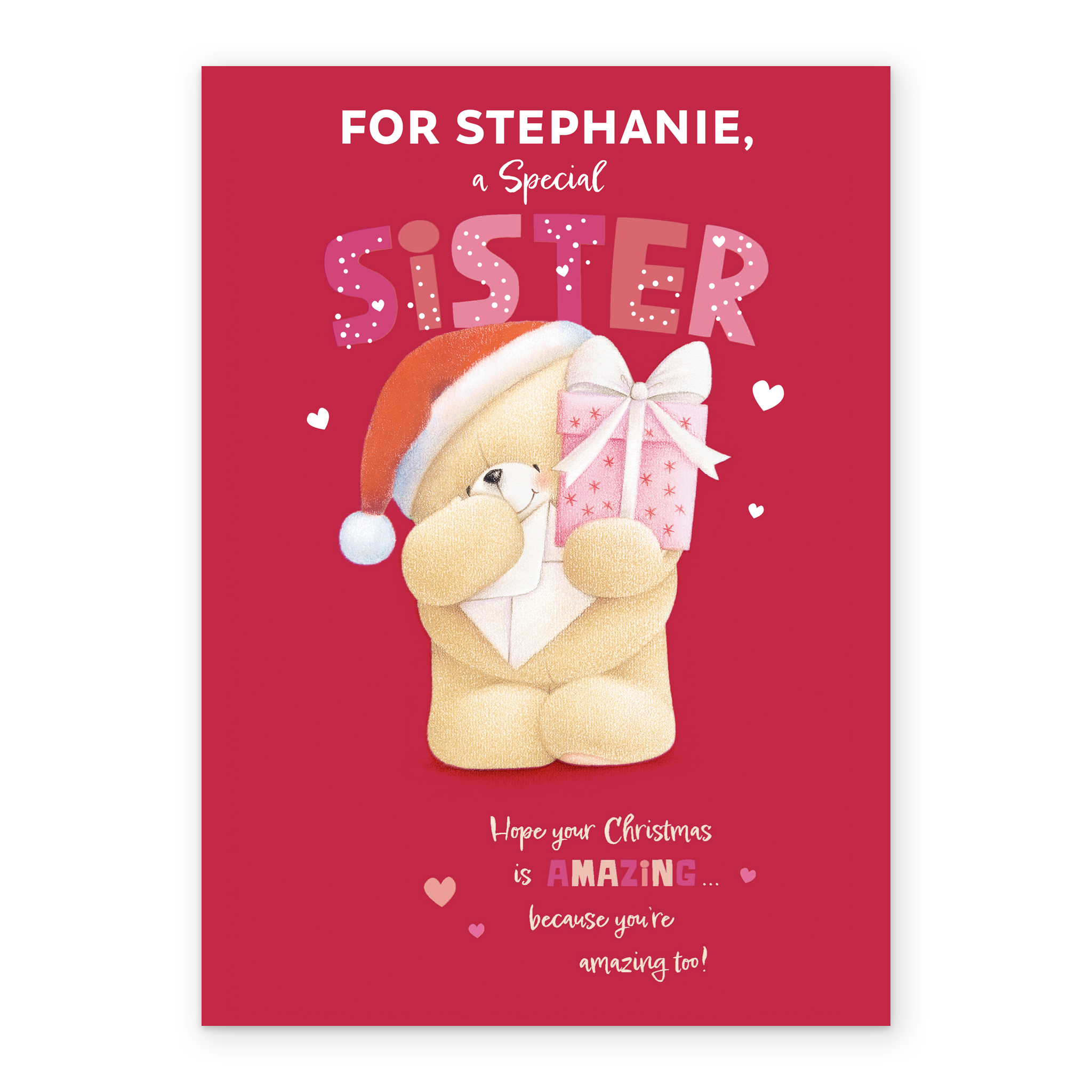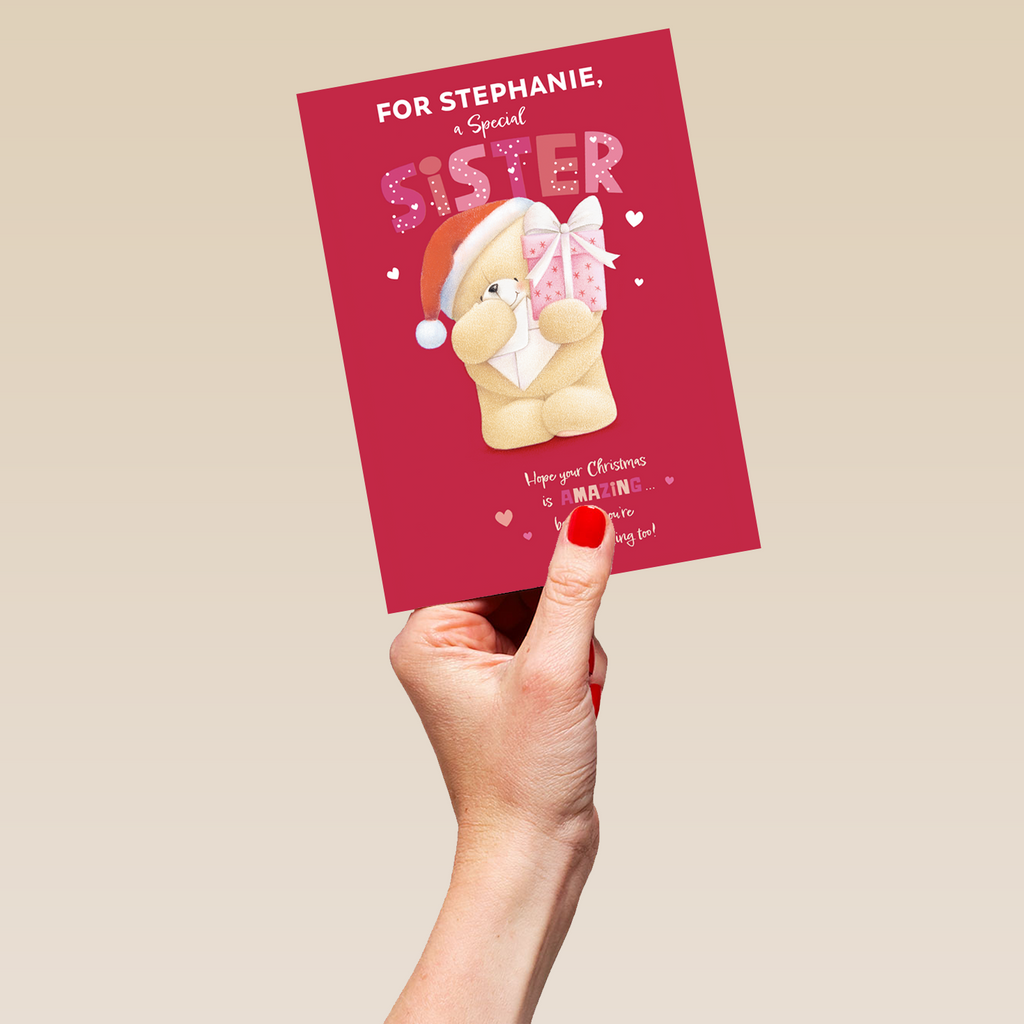 Printed on premium-quality board, this card features a Forever Friends bear in a Santa hat and holding a pink gift box and card, with the message 'For [Name], a special sister Hope your Christmas is amazing… because you're amazing too!', space to personalise a name, and comes complete with a co-ordinating white envelope.