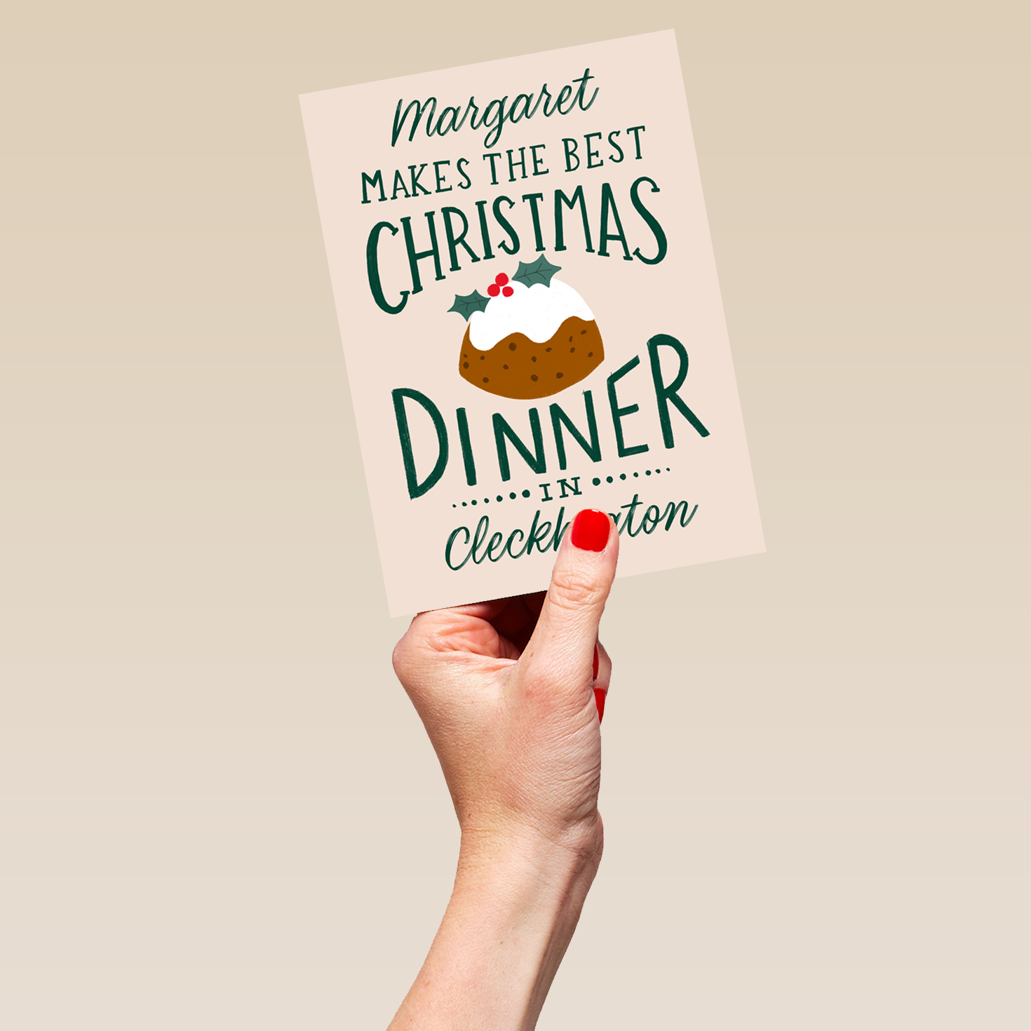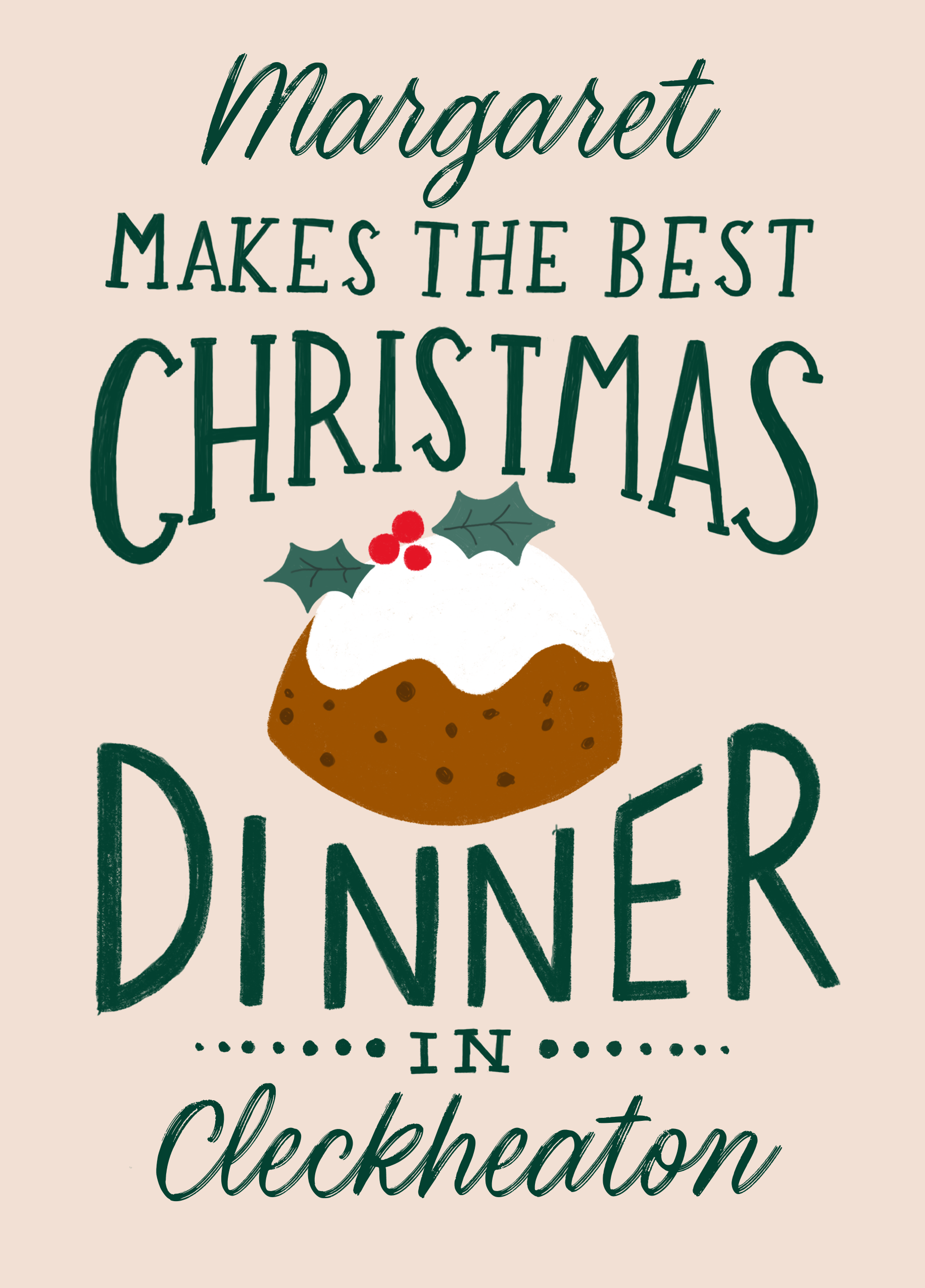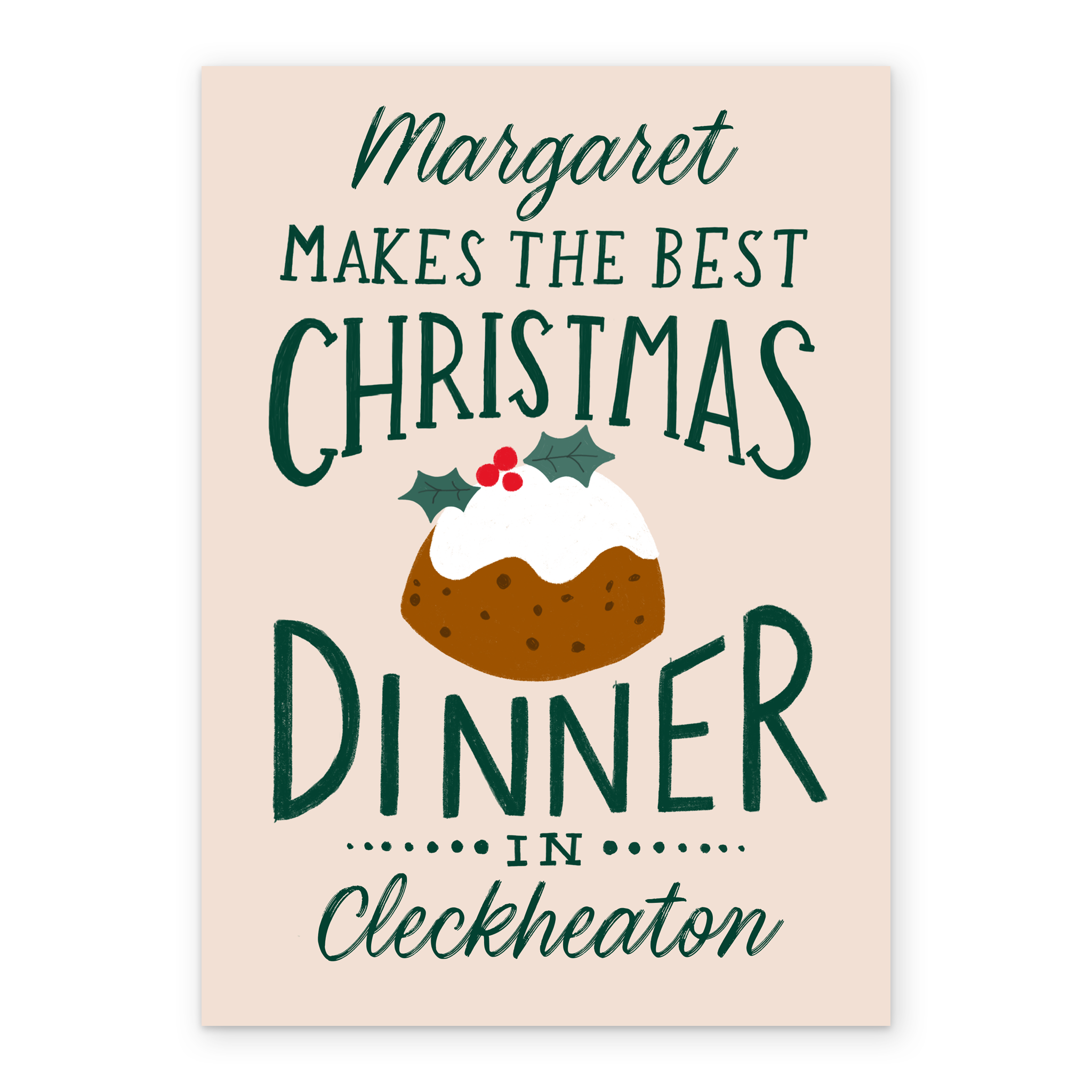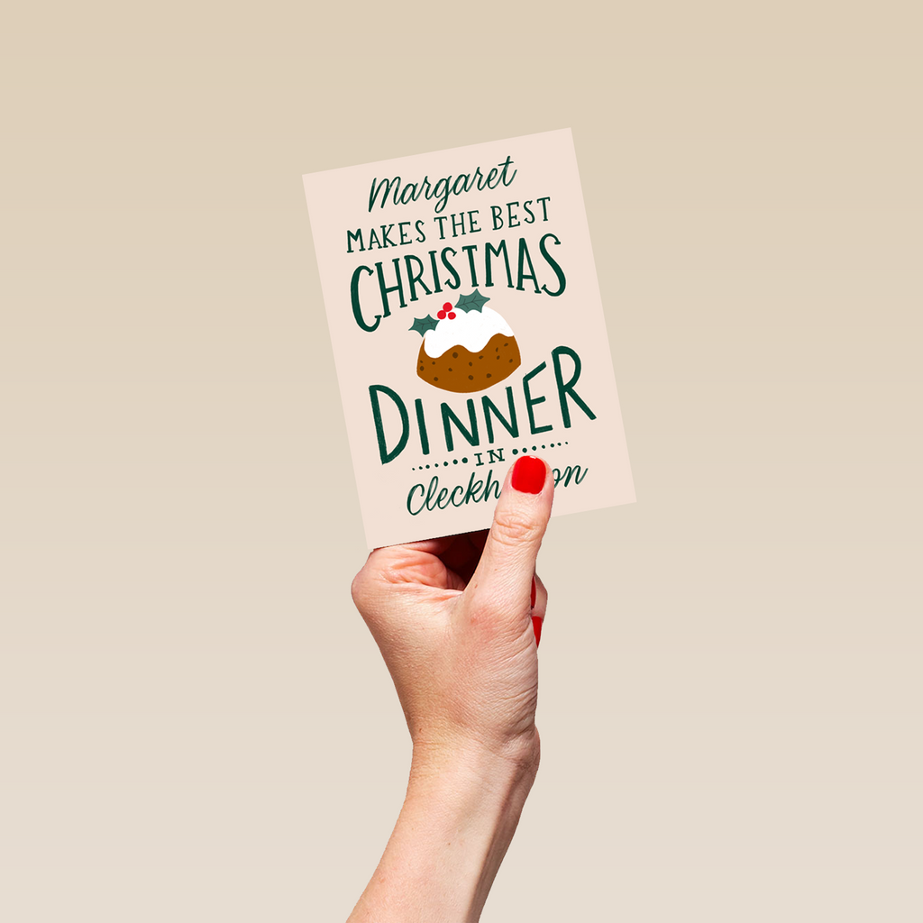 Printed on premium-quality board, this card features a festive illustration of a Christmas pudding, with the message '[Name] makes the best Christmas dinner in [Place Name]', space to personalise a name, and comes complete with a co-ordinating white envelope.