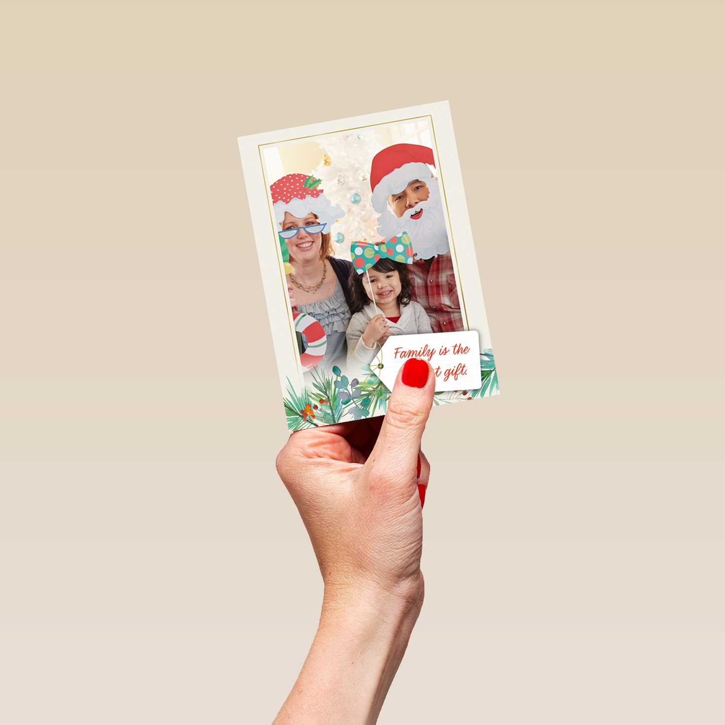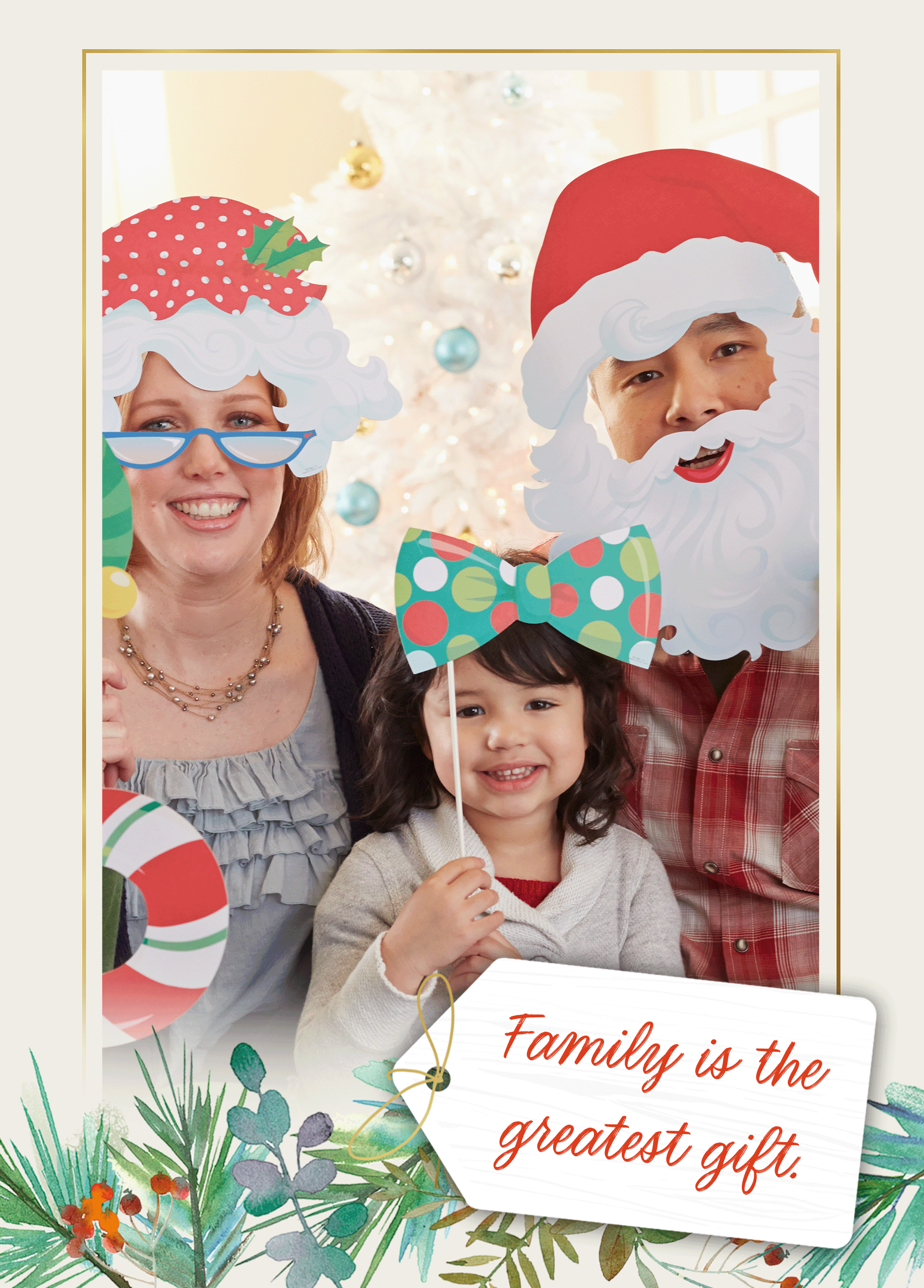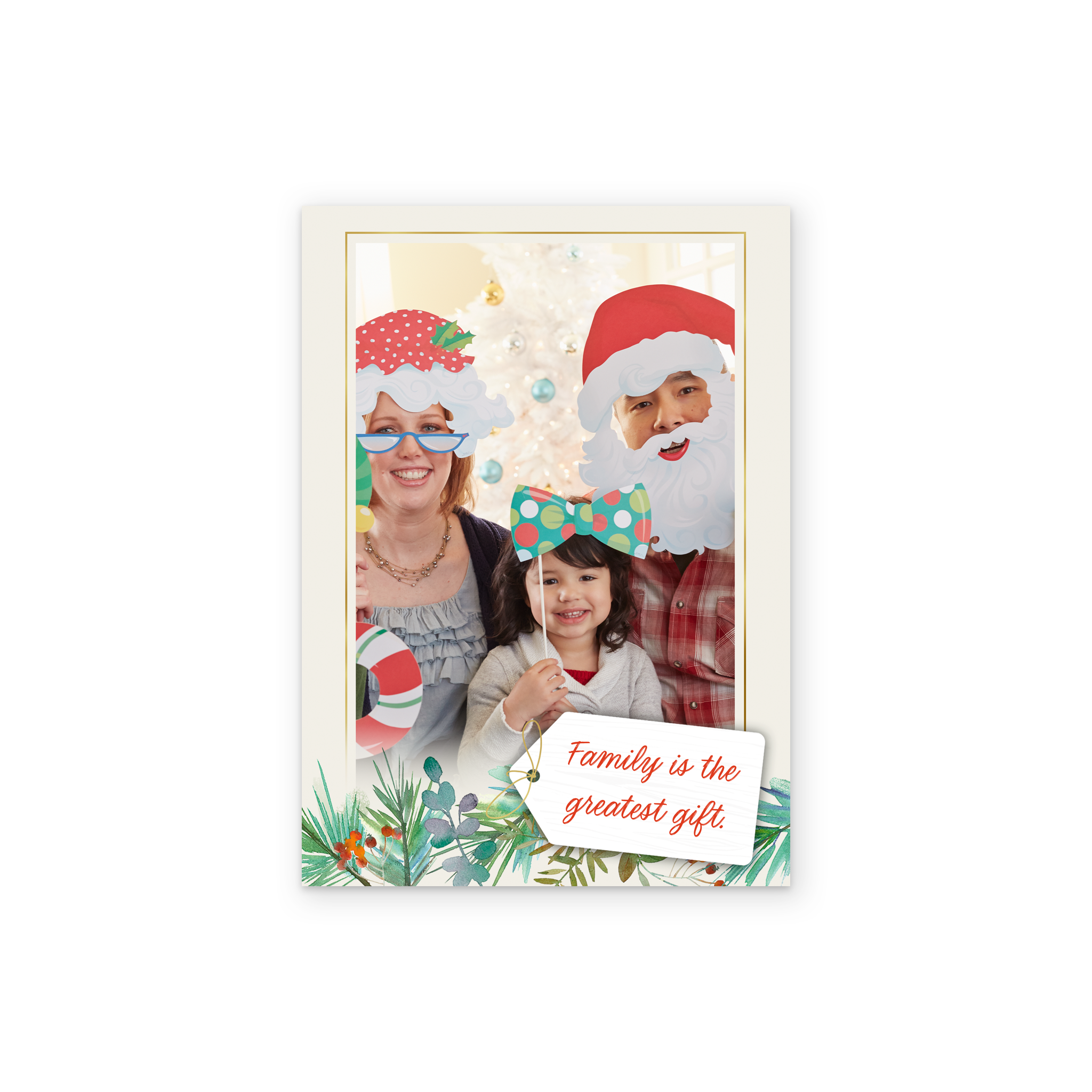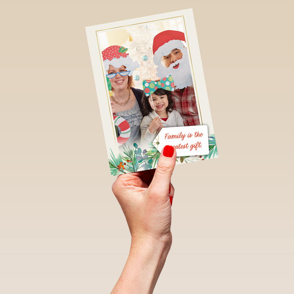 Printed on premium-quality board, this card features a simple white bordered frame with festive foliage illustrated along the bottom edge and a small 'tag' with deep red, handwritten style lettering, with the message 'Family is the greatest gift', space to upload a photo and personalise a name, and comes complete with a co-ordinating white envelope.