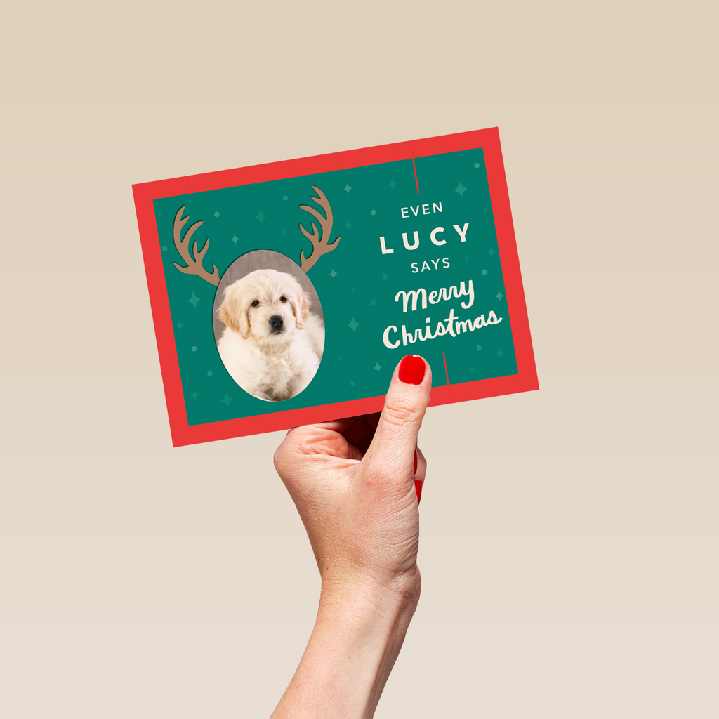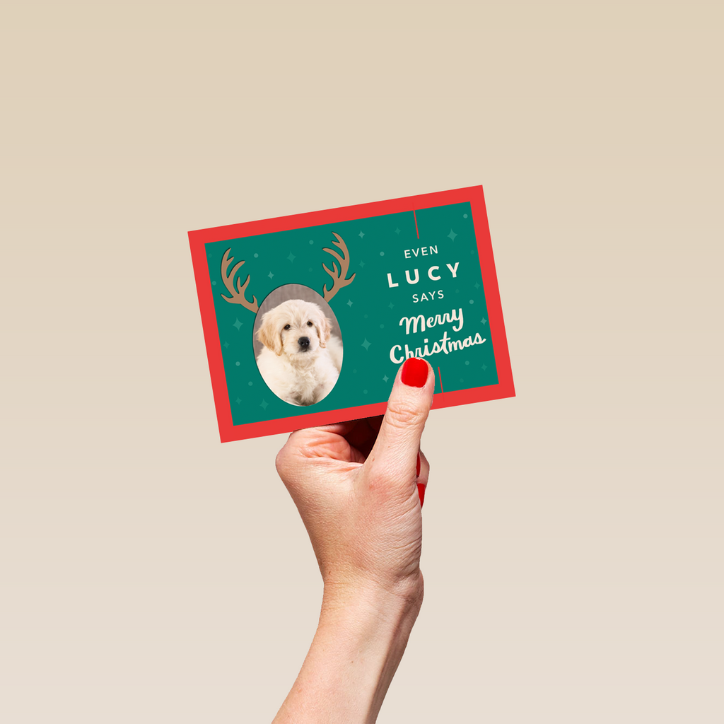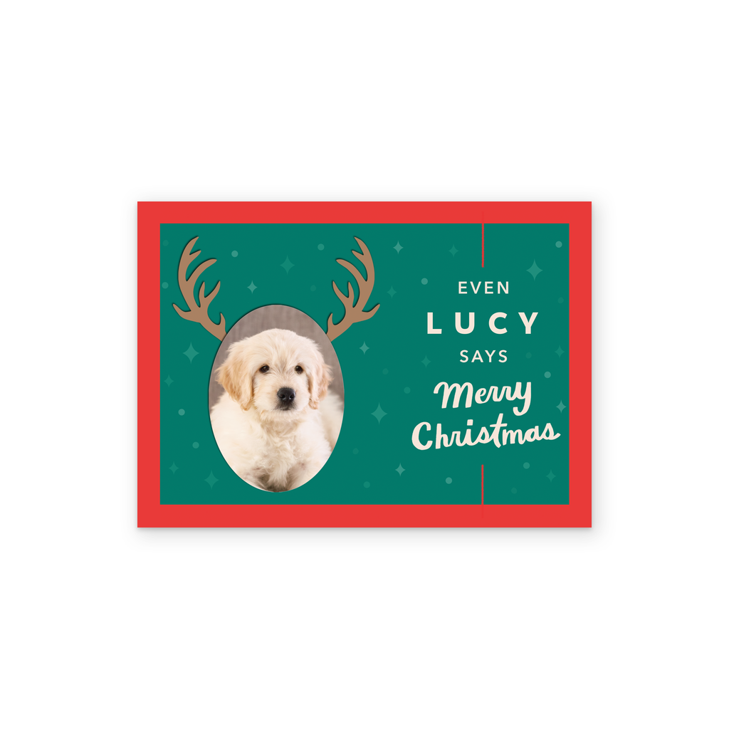 Printed on premium-quality board, this card features a rich green background surrounded by a bright red border with an antler enhanced frame element and white lettering, with the message 'Even [NAME] says Merry Christmas', space to upload a photo and personalise a name, and comes complete with a co-ordinating white envelope.