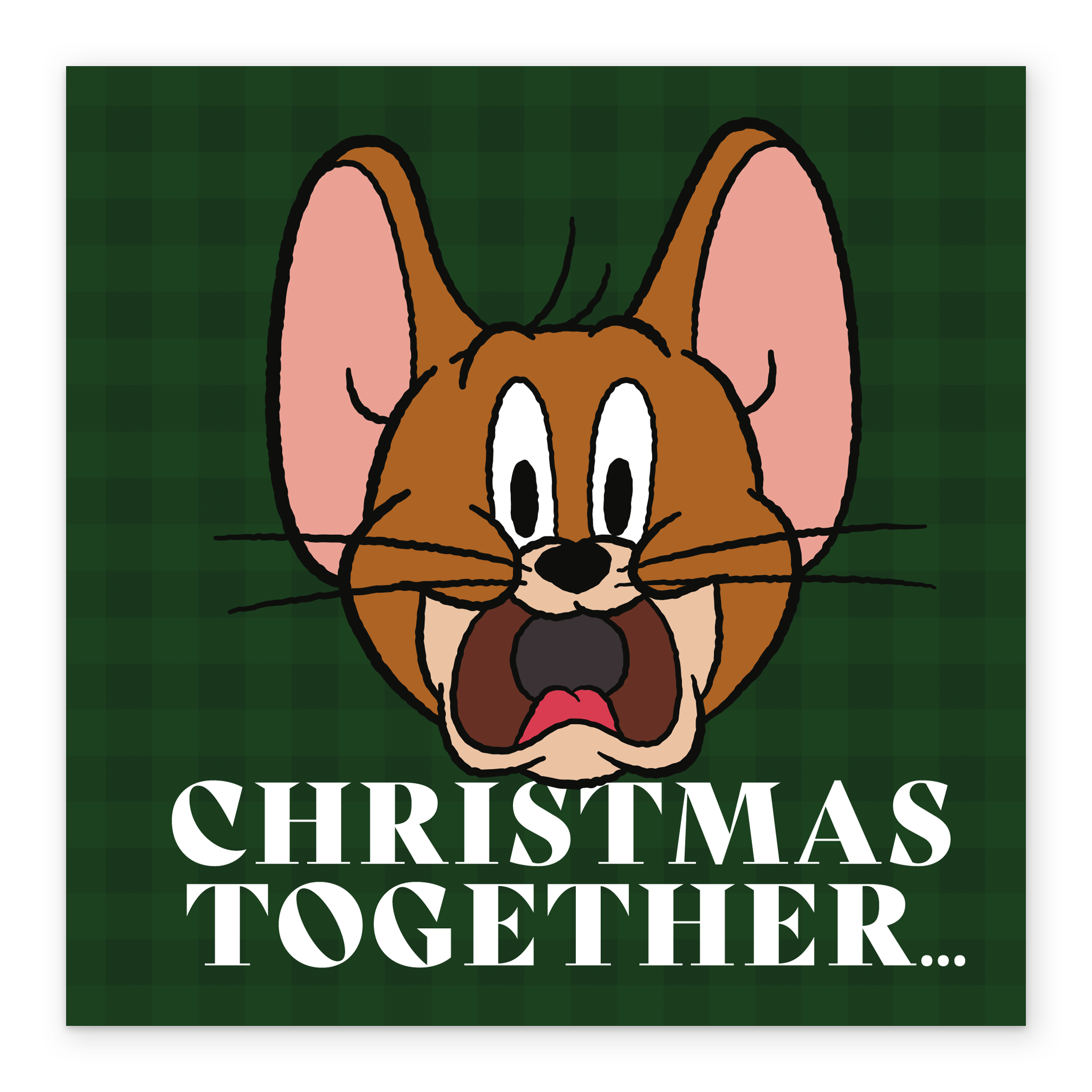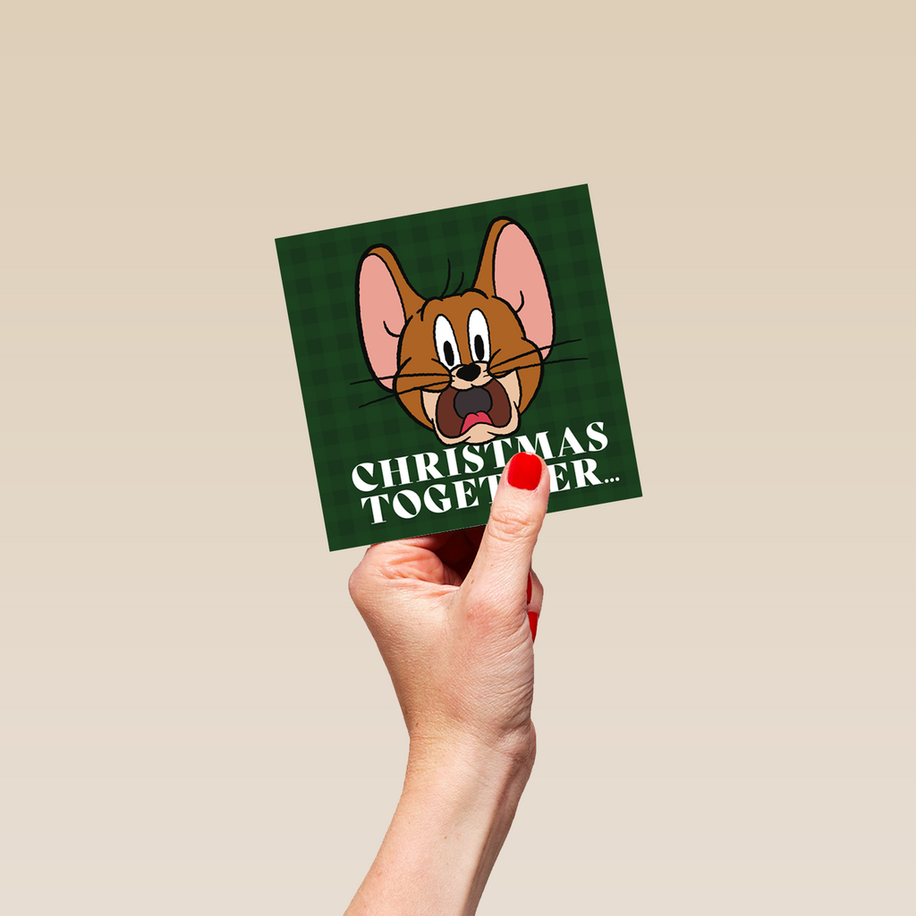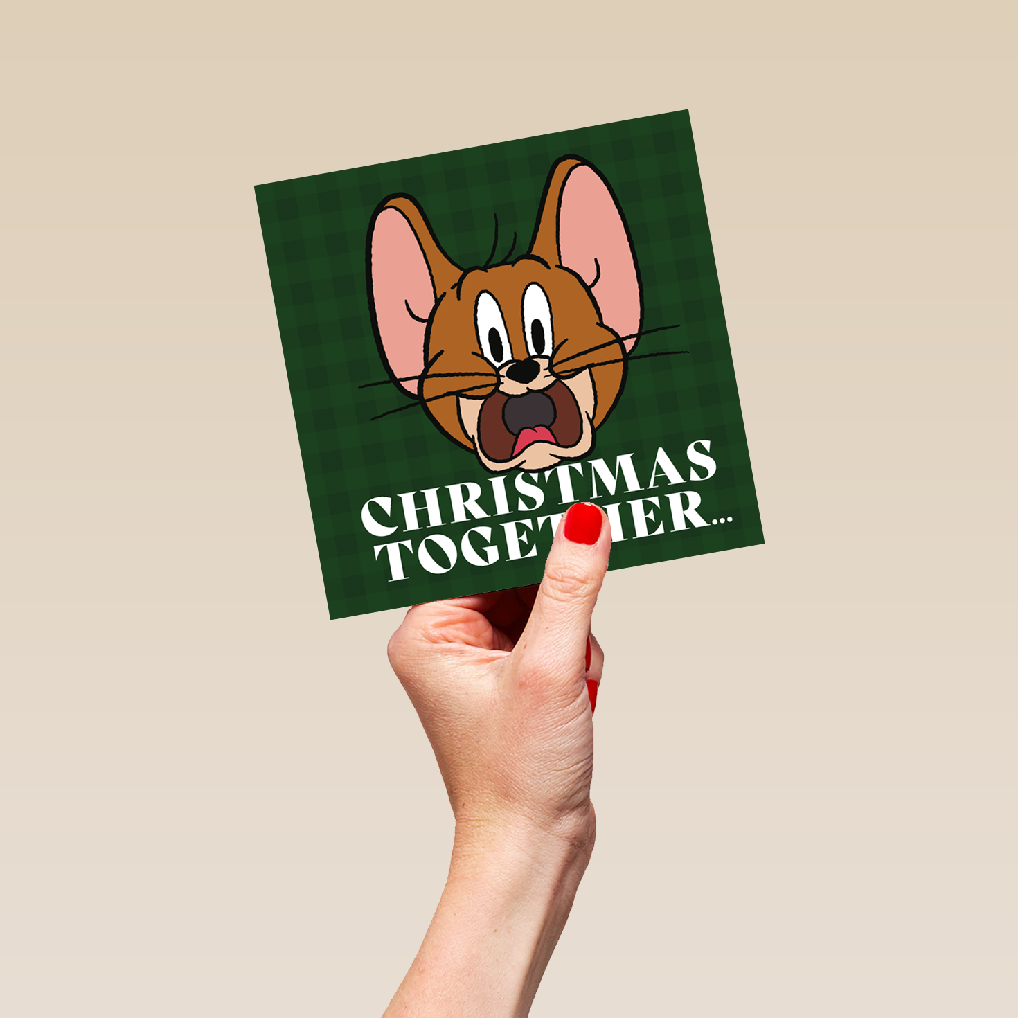 Printed on premium-quality board, this card features Jerry the mouse screaming, from the cartoon Tom and Jerry, with the message 'Christmas together...', and comes complete with a co-ordinating white envelope.