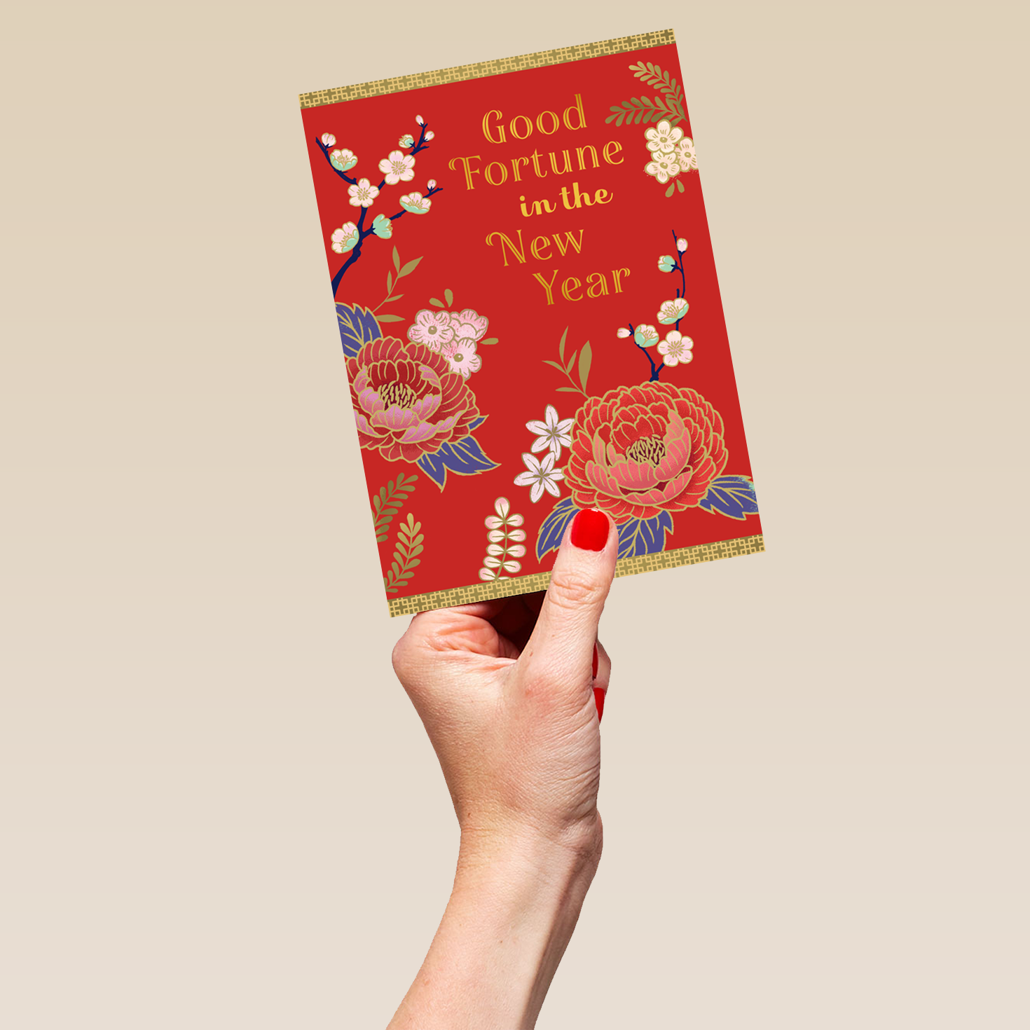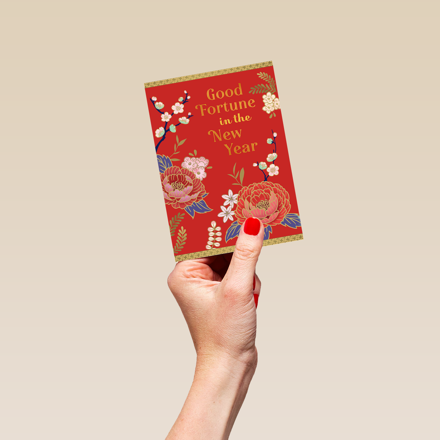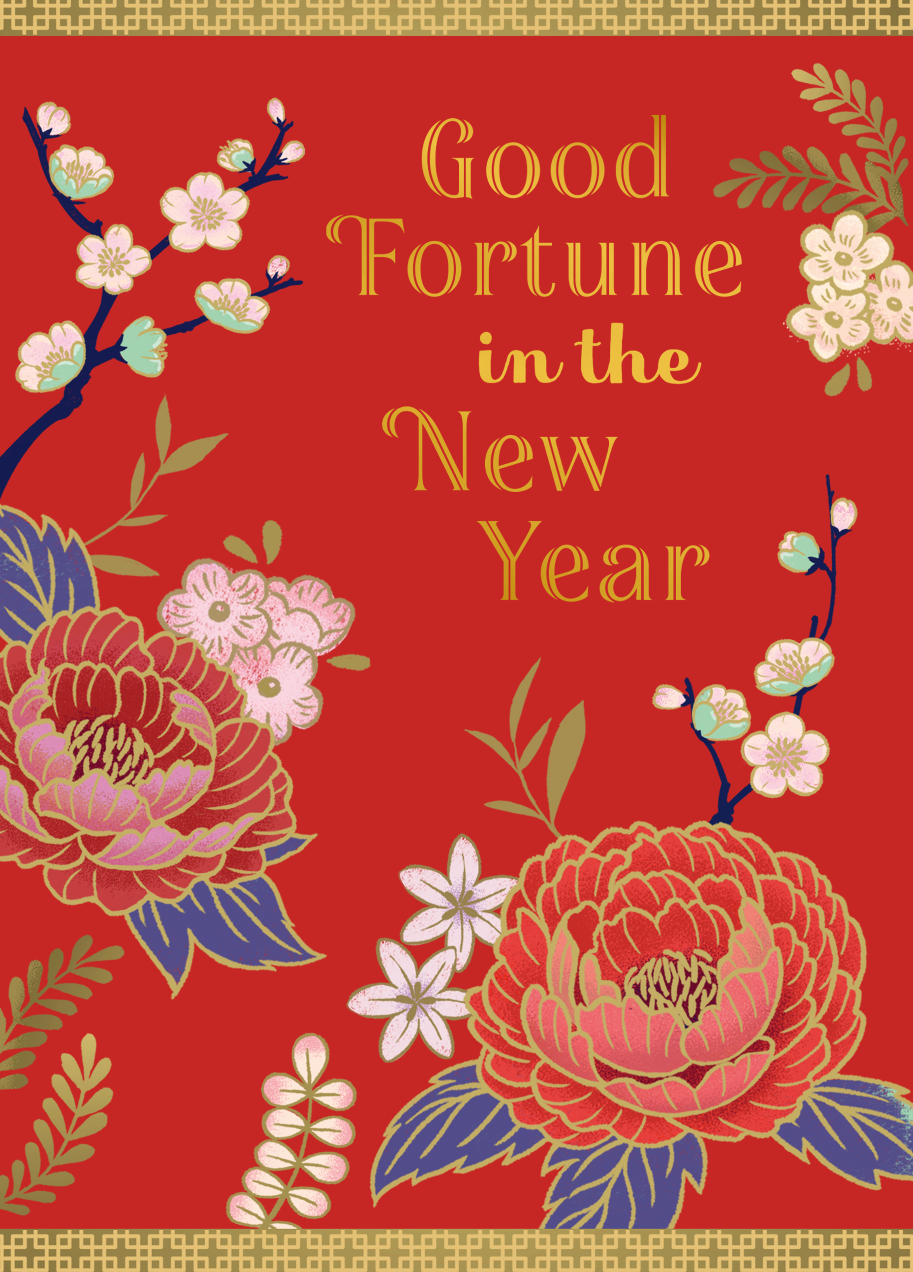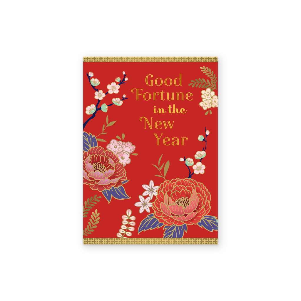 Printed on premium-quality board, this card features beautifully illustrated red flower blooms with blossom and foliage, set against a bright red background with patterned gold borders to the top and bottom and simple gold lettering, with the message 'Good Fortune in the New Year', and comes complete with a co-ordinating white envelope.
