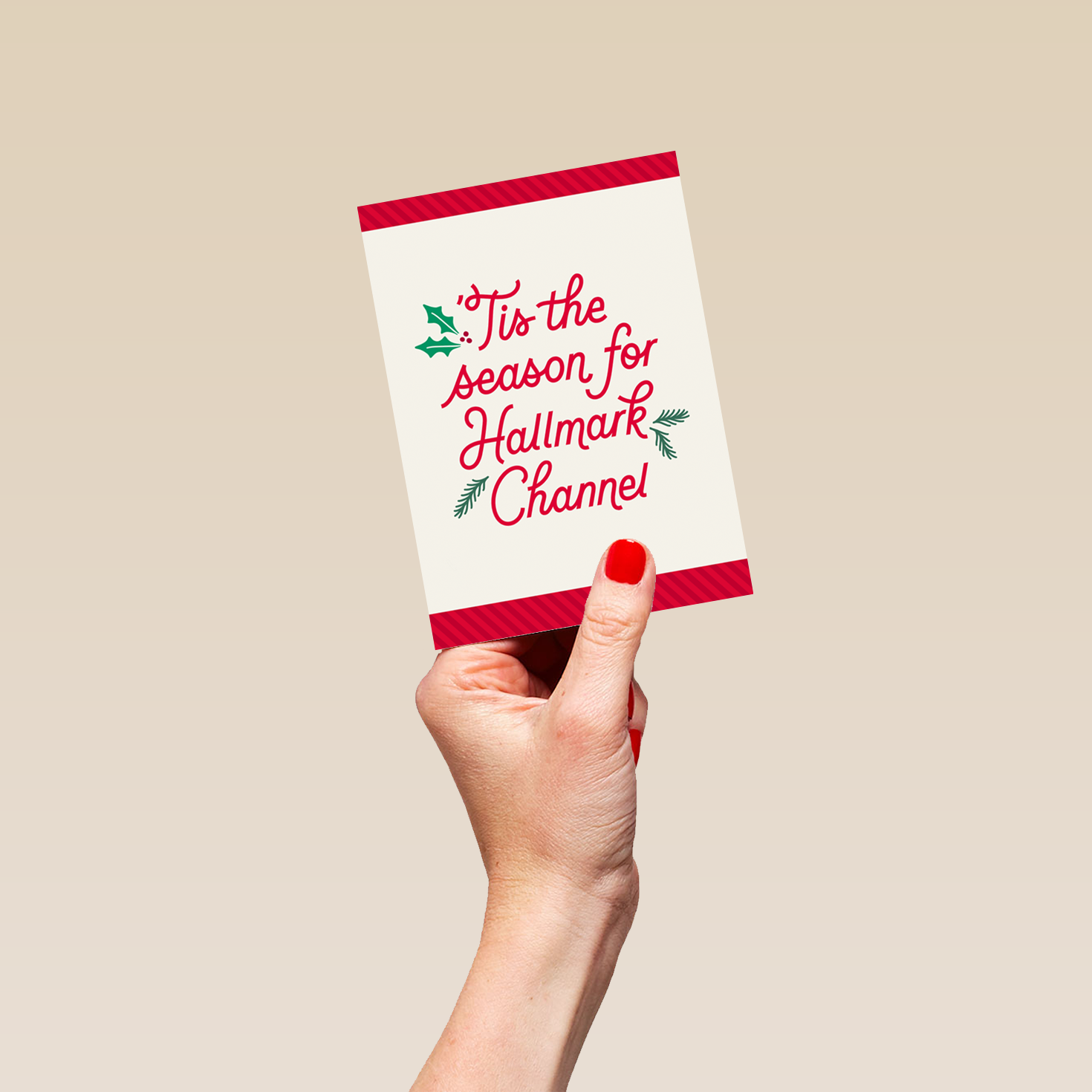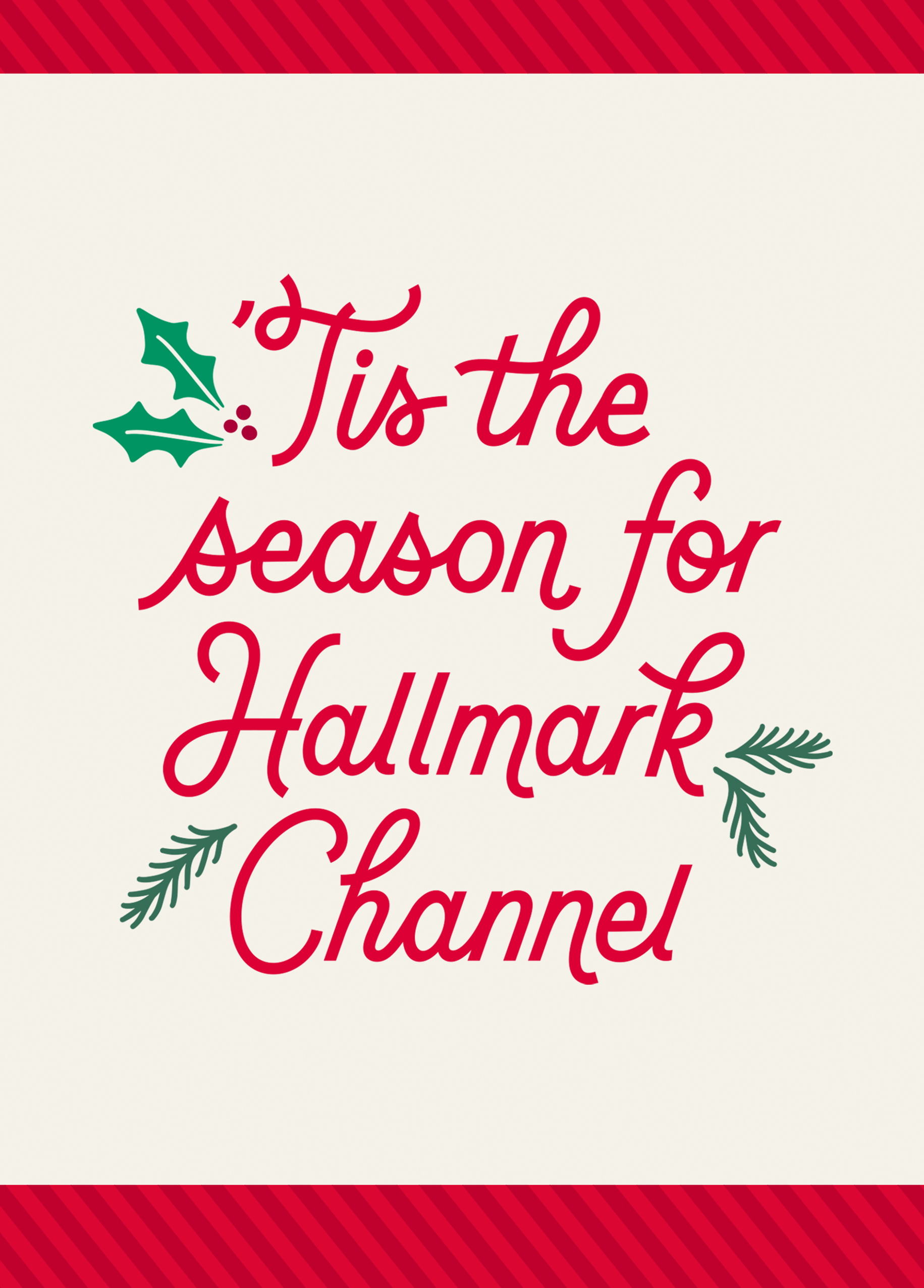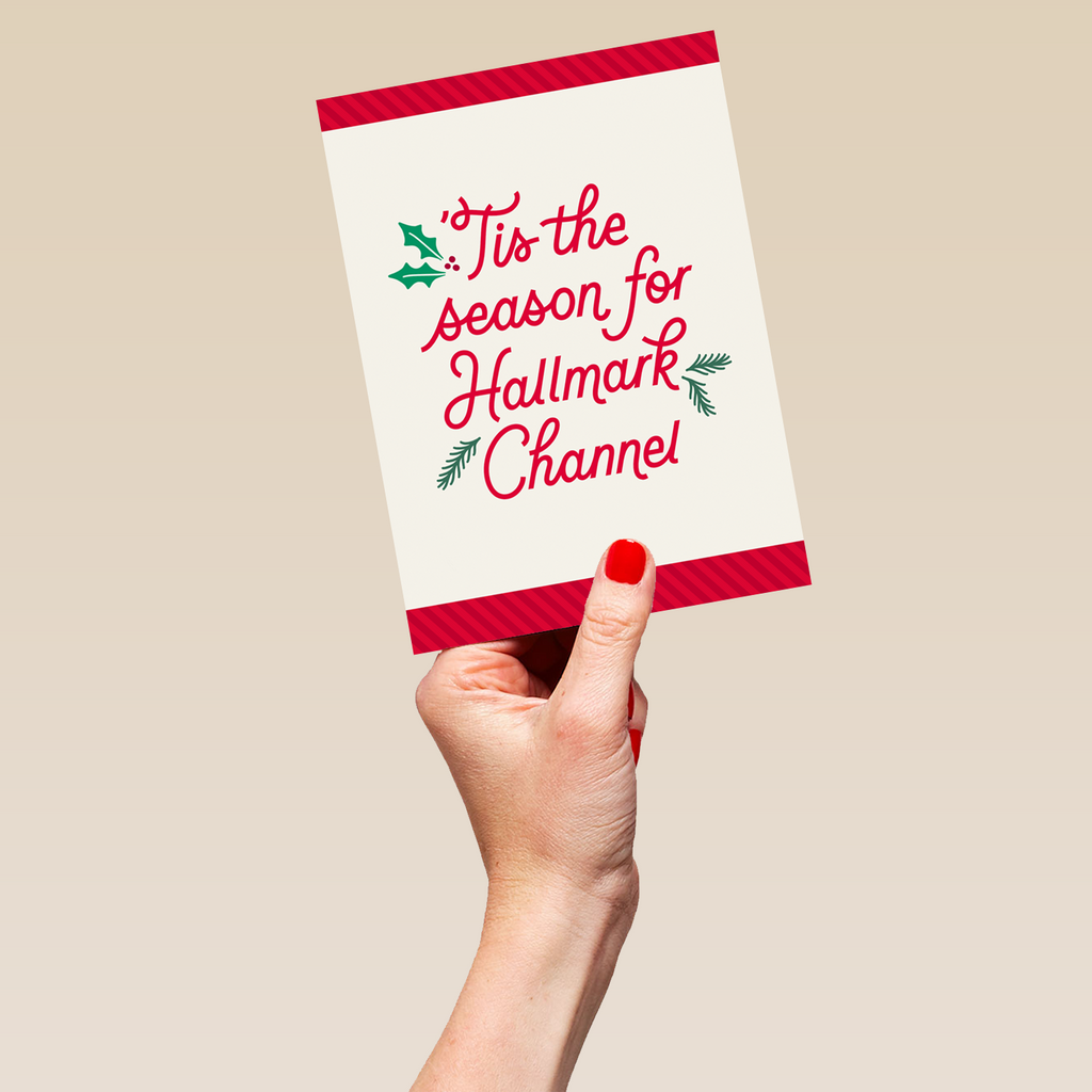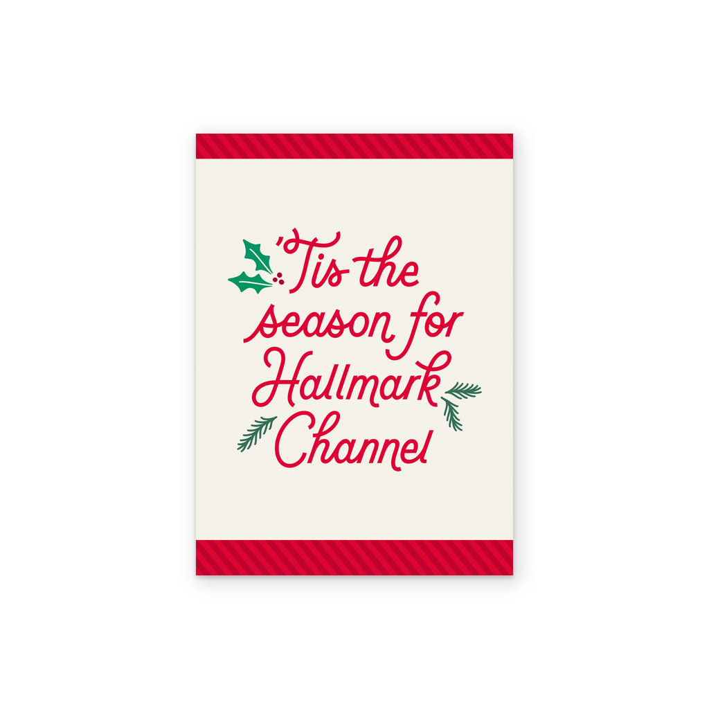 Printed on premium-quality board, this card features an off white background with bold red borders to the top and bottom, simple holly leaf and berry illustrations and bright red lettering, with the message 'Tis the season for Hallmark Channel', and comes complete with a co-ordinating white envelope.