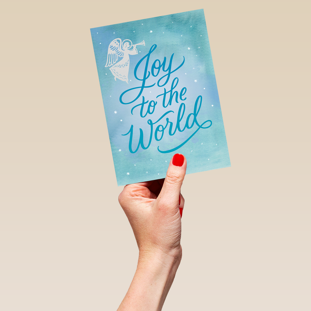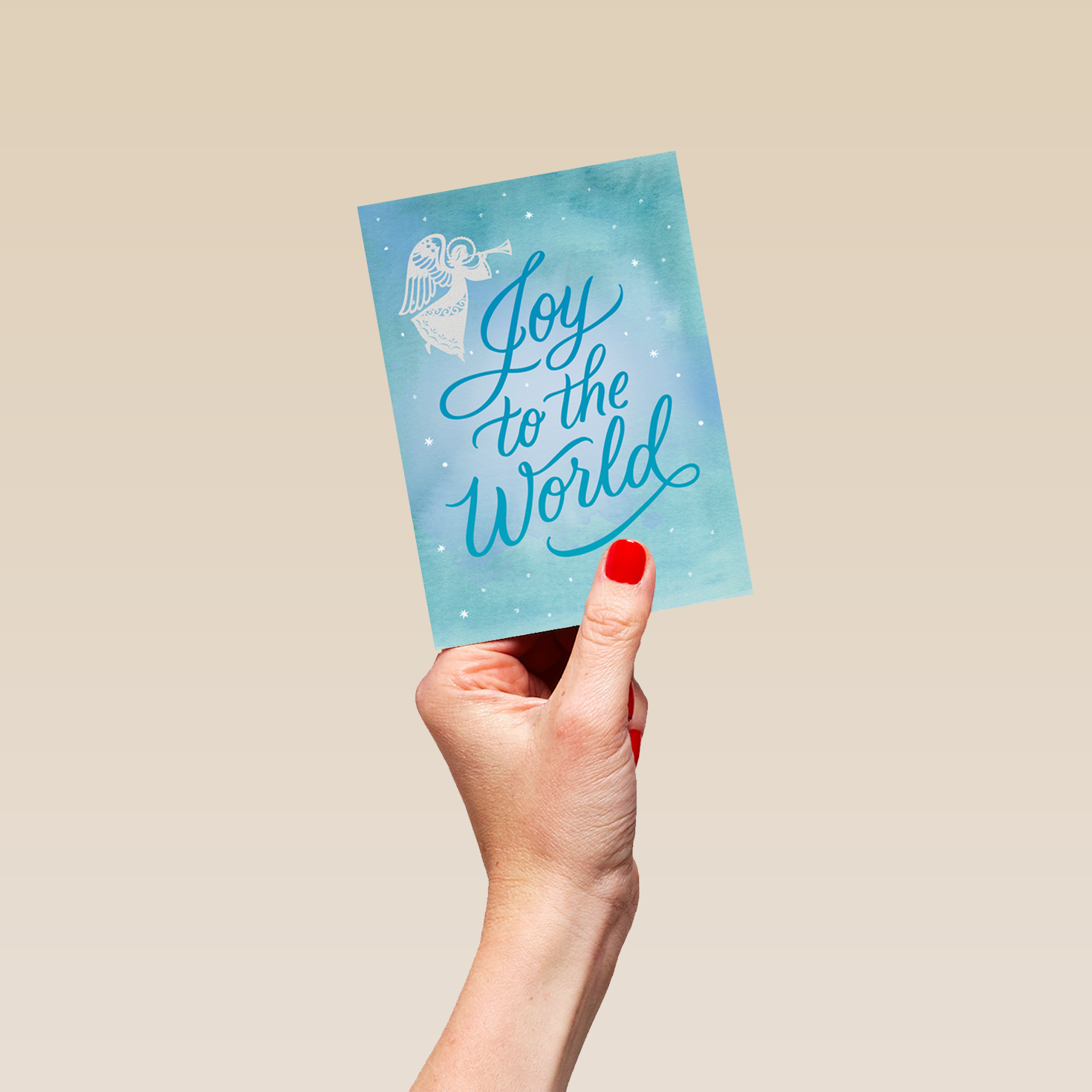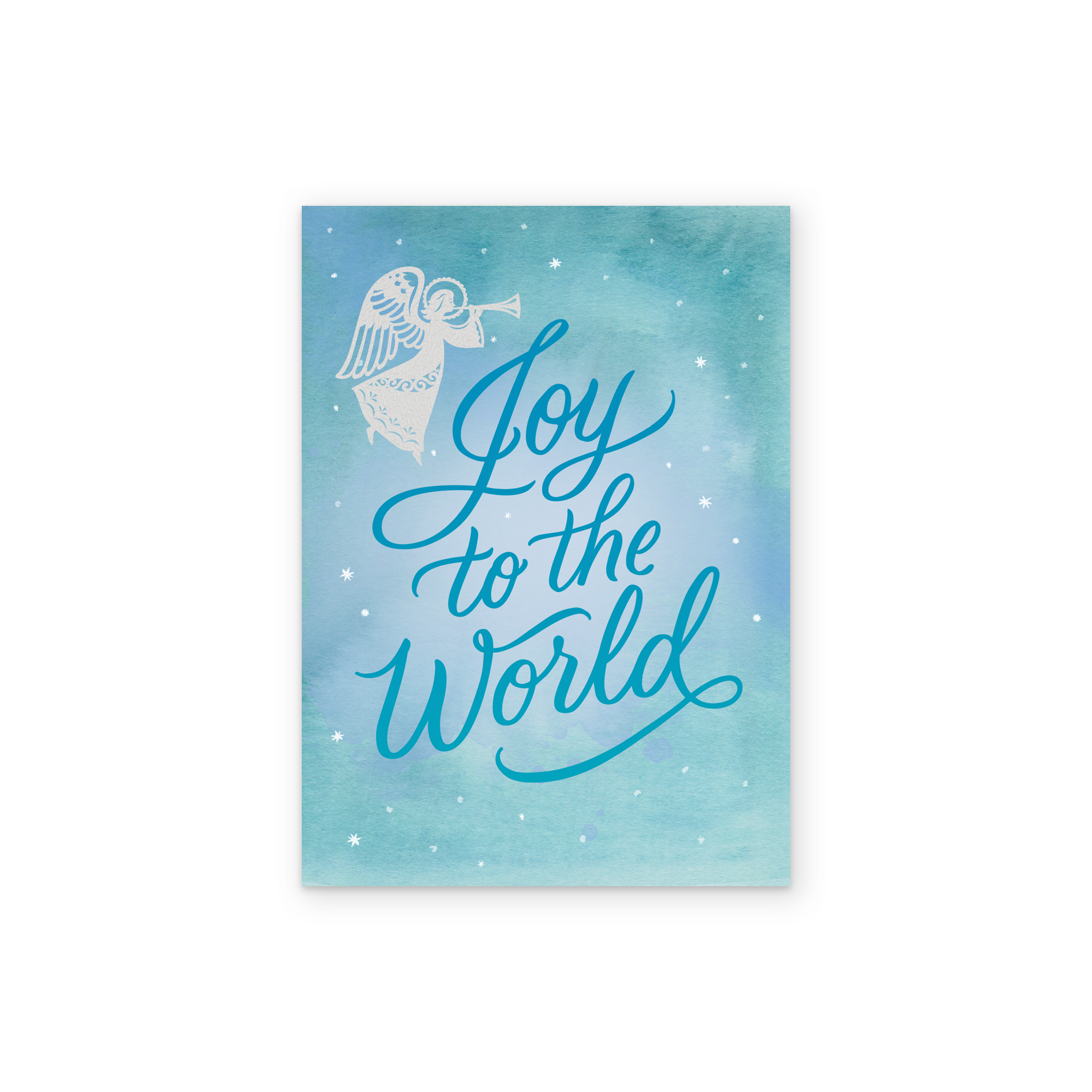 Printed on premium-quality board, this card features an ombre effect blue and green background with an angel illustration in the top left of the design in white above darker blue, script style lettering, with the message 'Joy to the World', and comes complete with a co-ordinating white envelope.