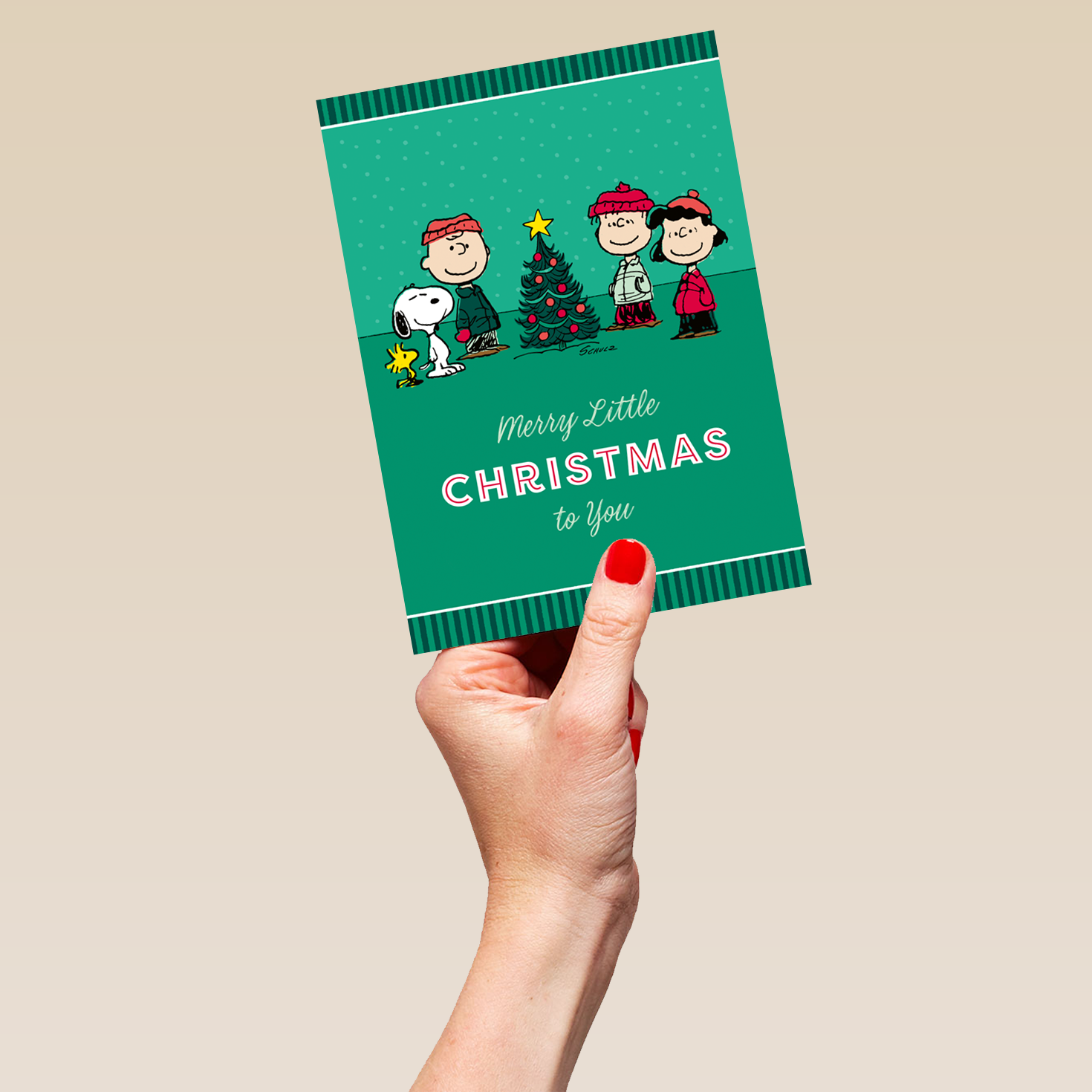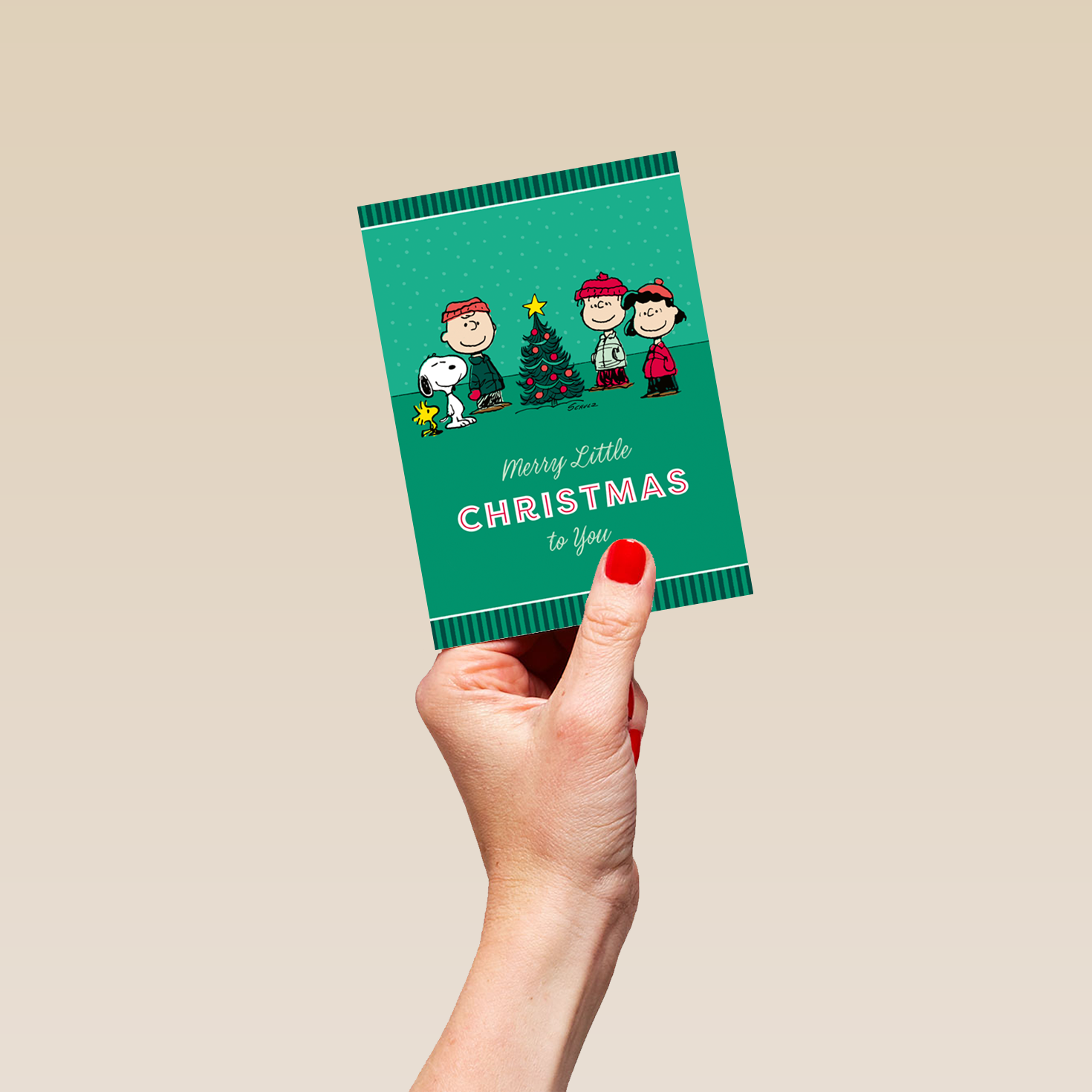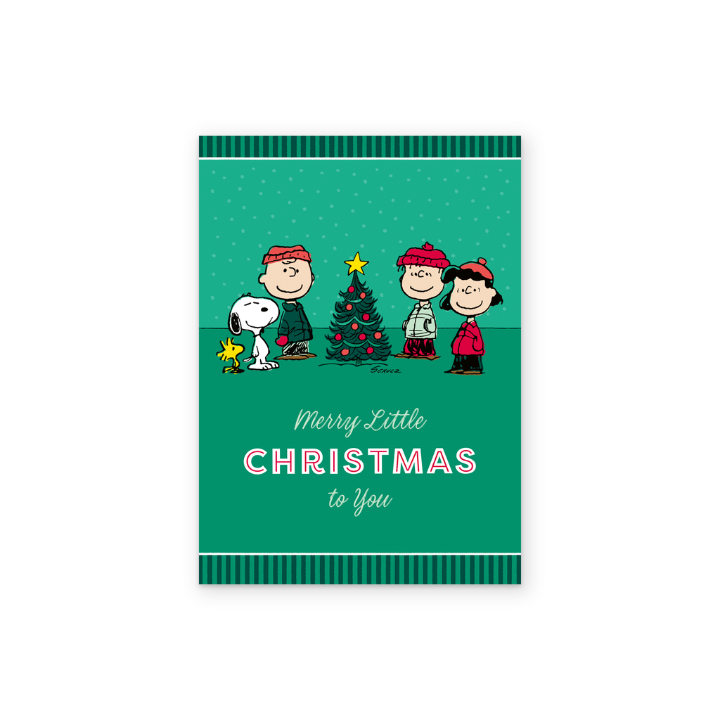 Printed on premium-quality board, this card features Snoopy, Woodstock, Charlie Brown, Lucy and Linus standing around a small, decorated, Christmas tree against a vibrant green background above red and white lettering, with the message 'Merry Little Christmas to You', and comes complete with a co-ordinating white envelope.