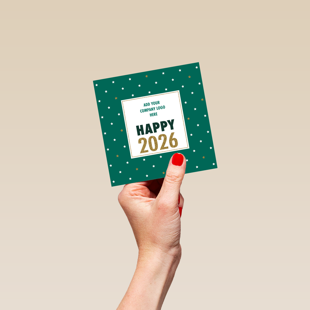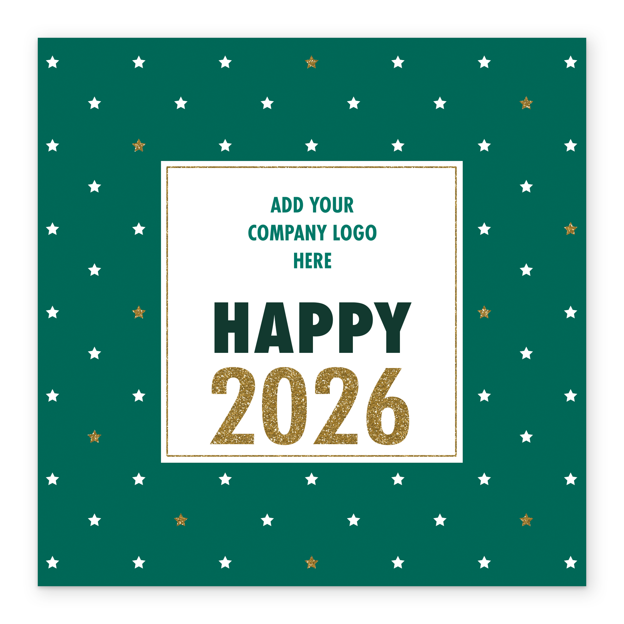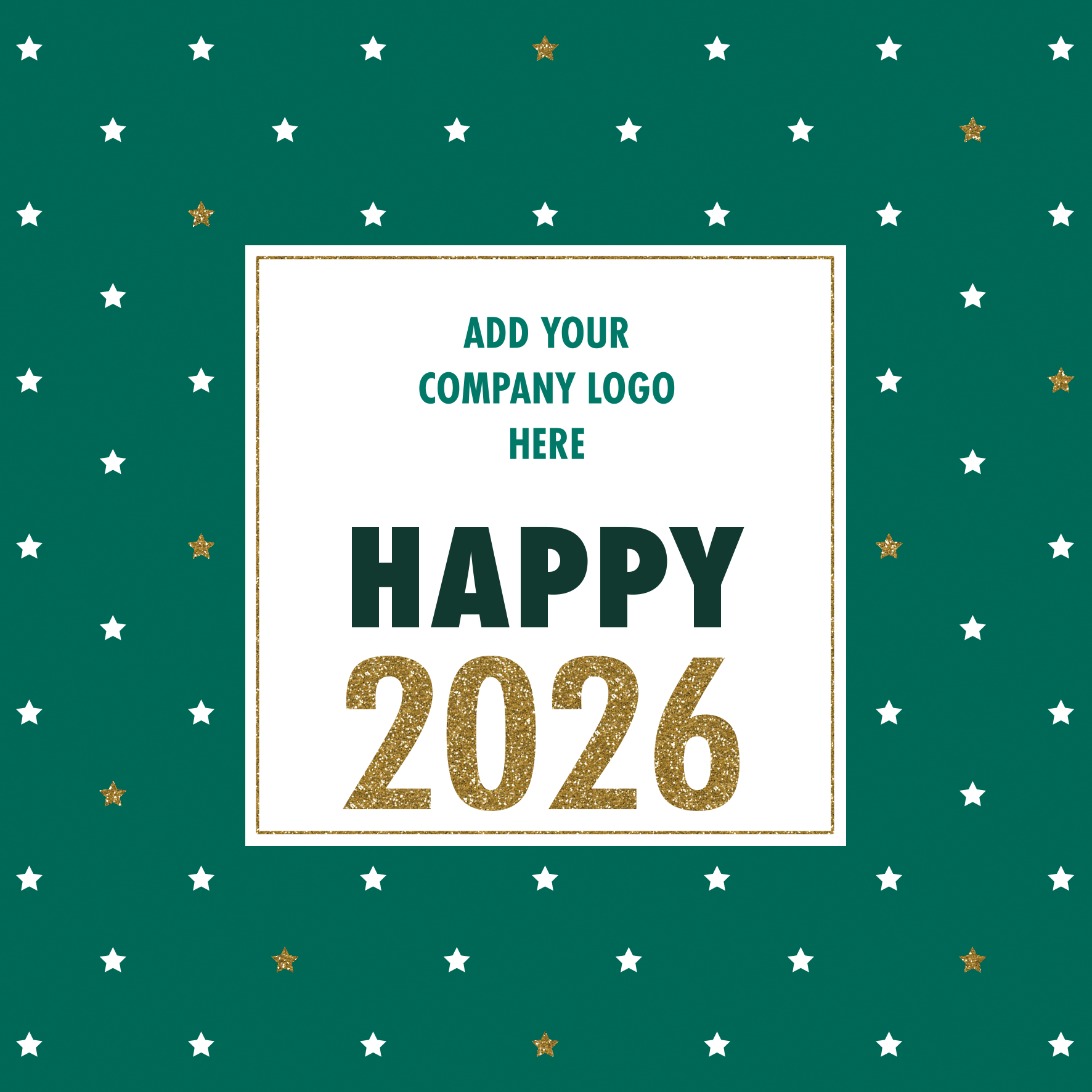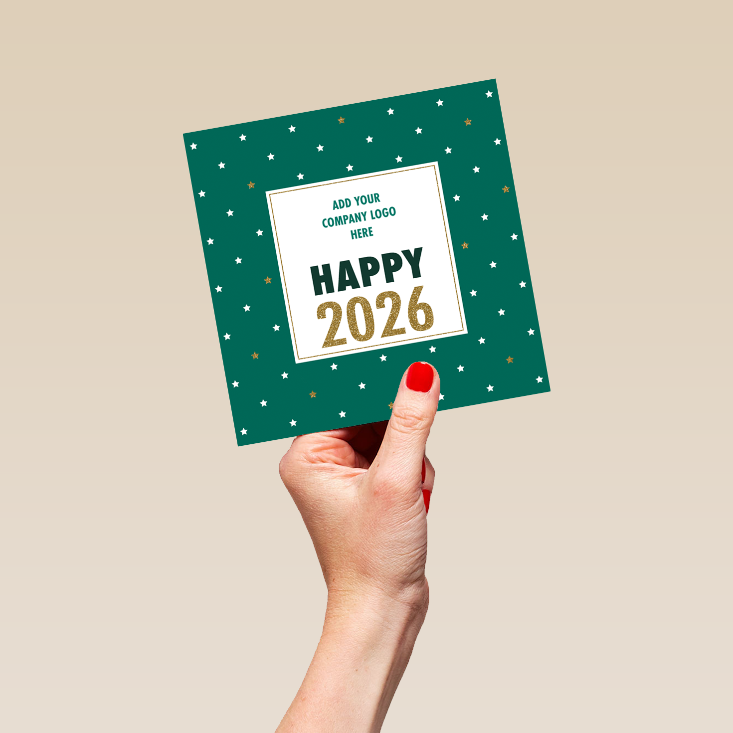 Printed on premium-quality board, this card features a green background with white and gold stars, with a white square in the middle for a photo and message, with the message 'Happy 2026', space to upload a photo, and comes complete with a co-ordinating white envelope.