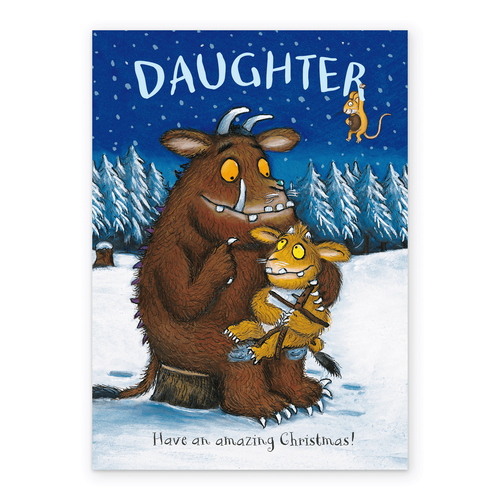Printed on premium-quality board, this card features a classic illustration of Julia Donaldson's Gruffalo and child sitting on a tree stump on a snowy landscape with yellow and black lettering above and below the image, with the message 'DAUGHTER Have an amazing Christmas!', and comes complete with a co-ordinating white envelope.
