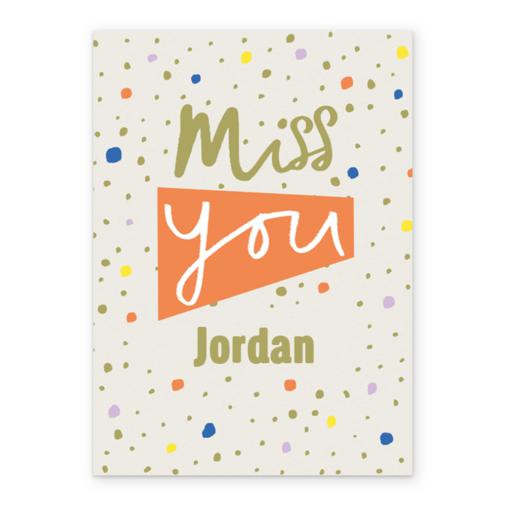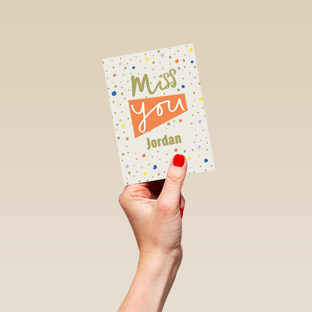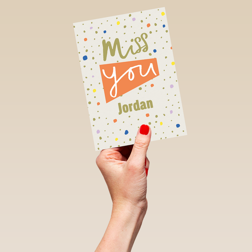 Show them you care with a personalised for you patterned miss you card from Hallmark. Our greetings cards are printed on premium quality, FSC®-certified card & delivered nationwide. This card is available as standard 12cm by 16.7cm and large 15.5cm by 21.6cm.