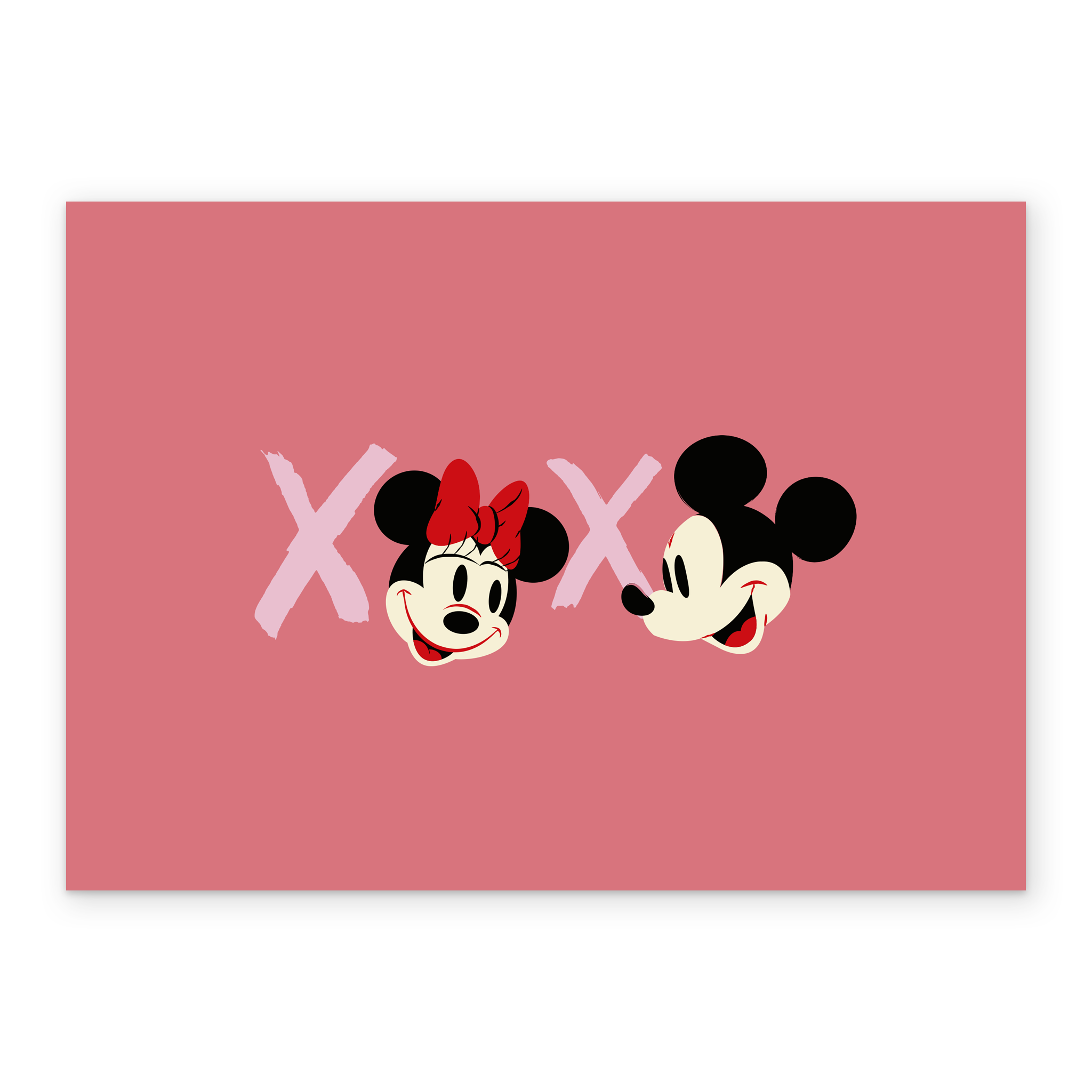 Printed on premium-quality board, this card features Mickey and Minnie Mouse in an 'xoxo' sequence on a pink background, and comes complete with a co-ordinating white envelope.