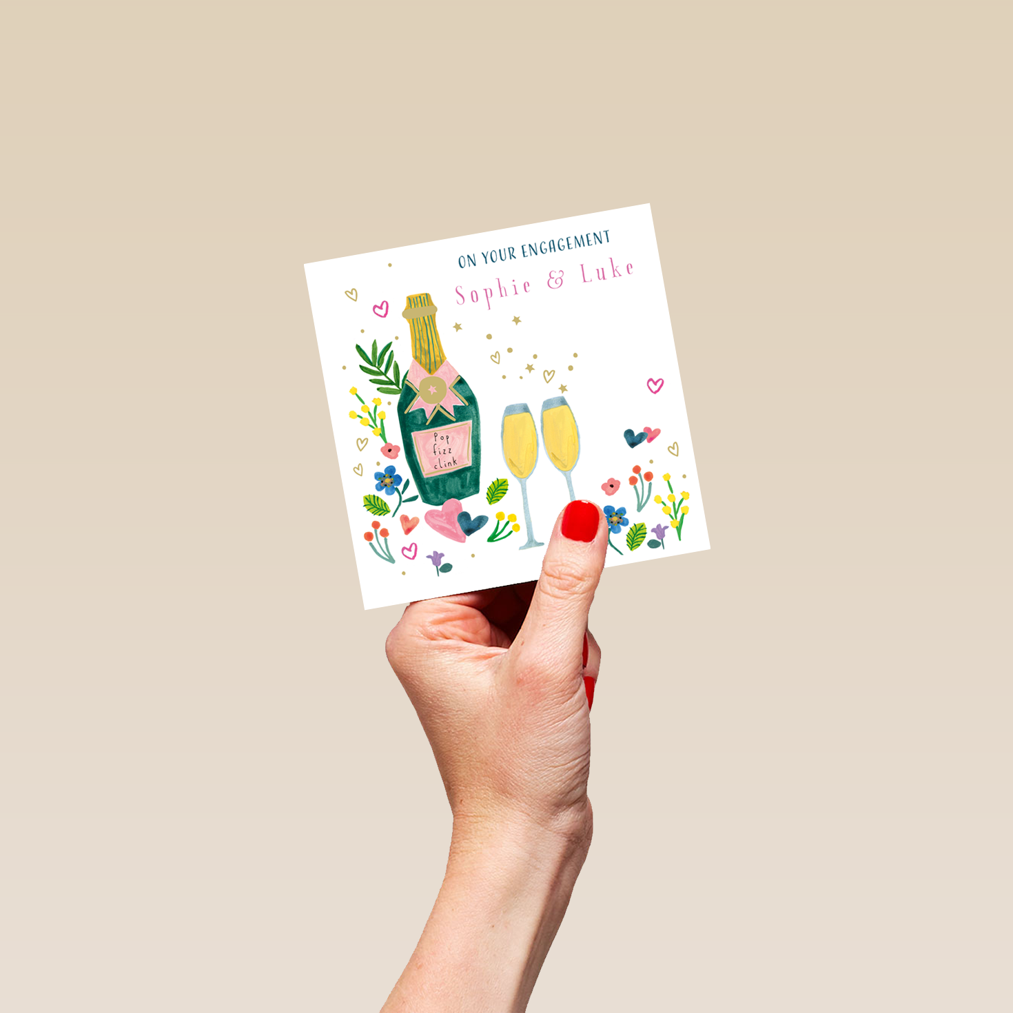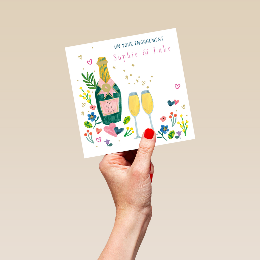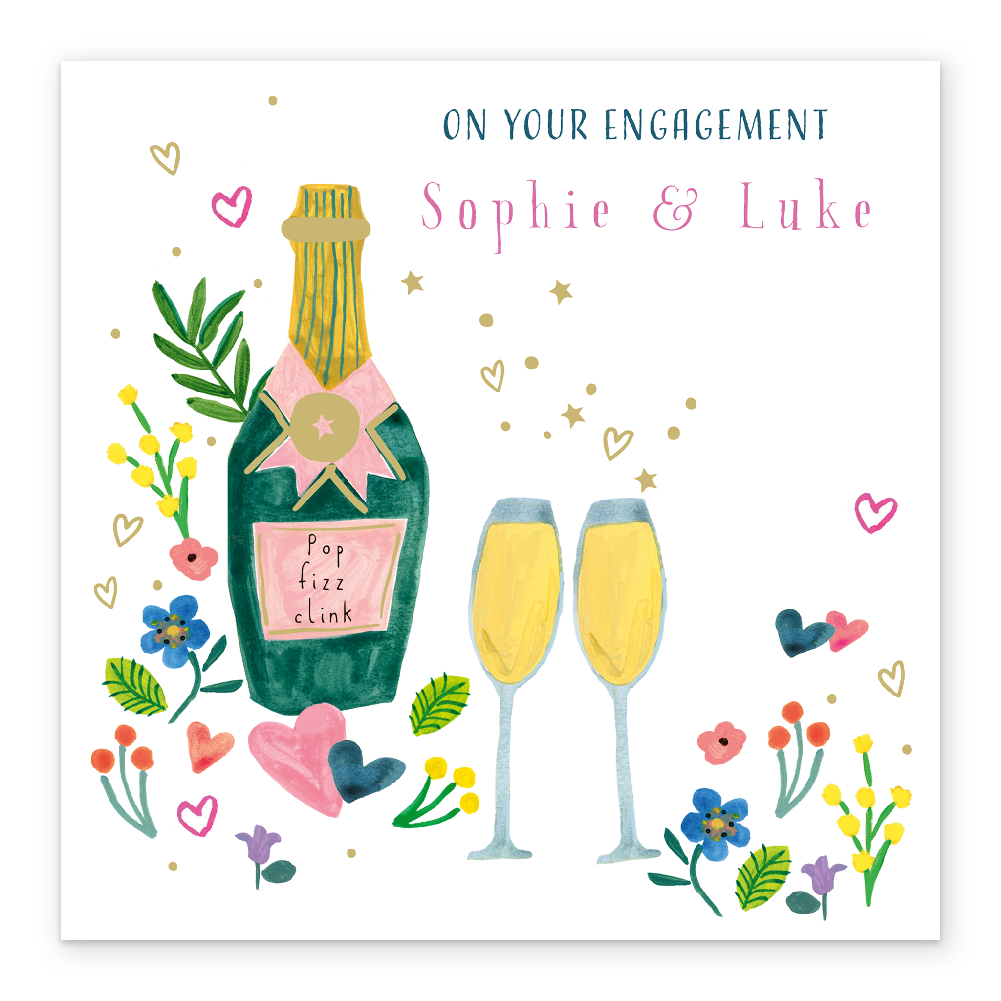 Printed on premium-quality board, this card features an illustrated champagne bottle and flutes, with a floral design, with the message 'On Your Engagement', space to personalise a name, and comes complete with a co-ordinating white envelope.