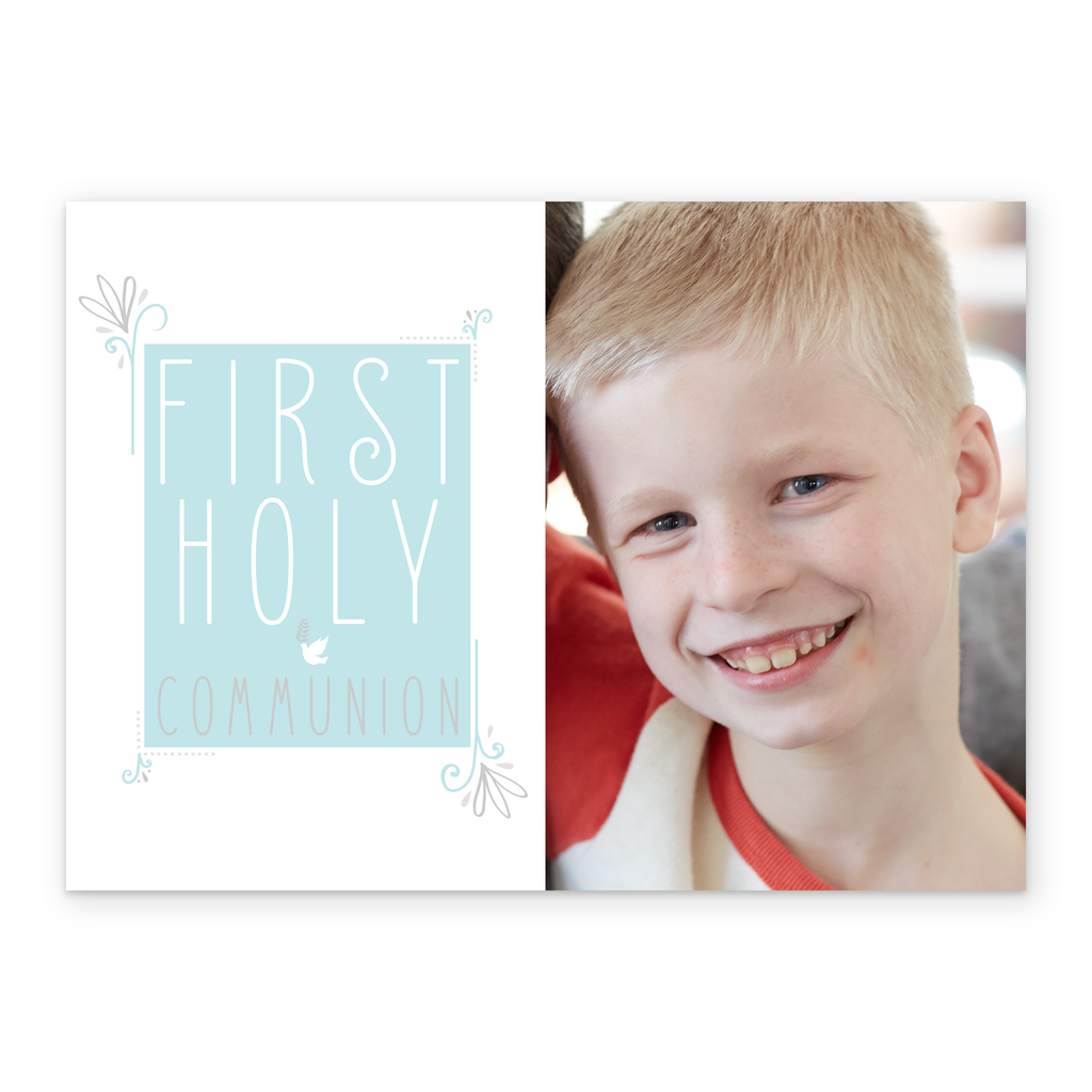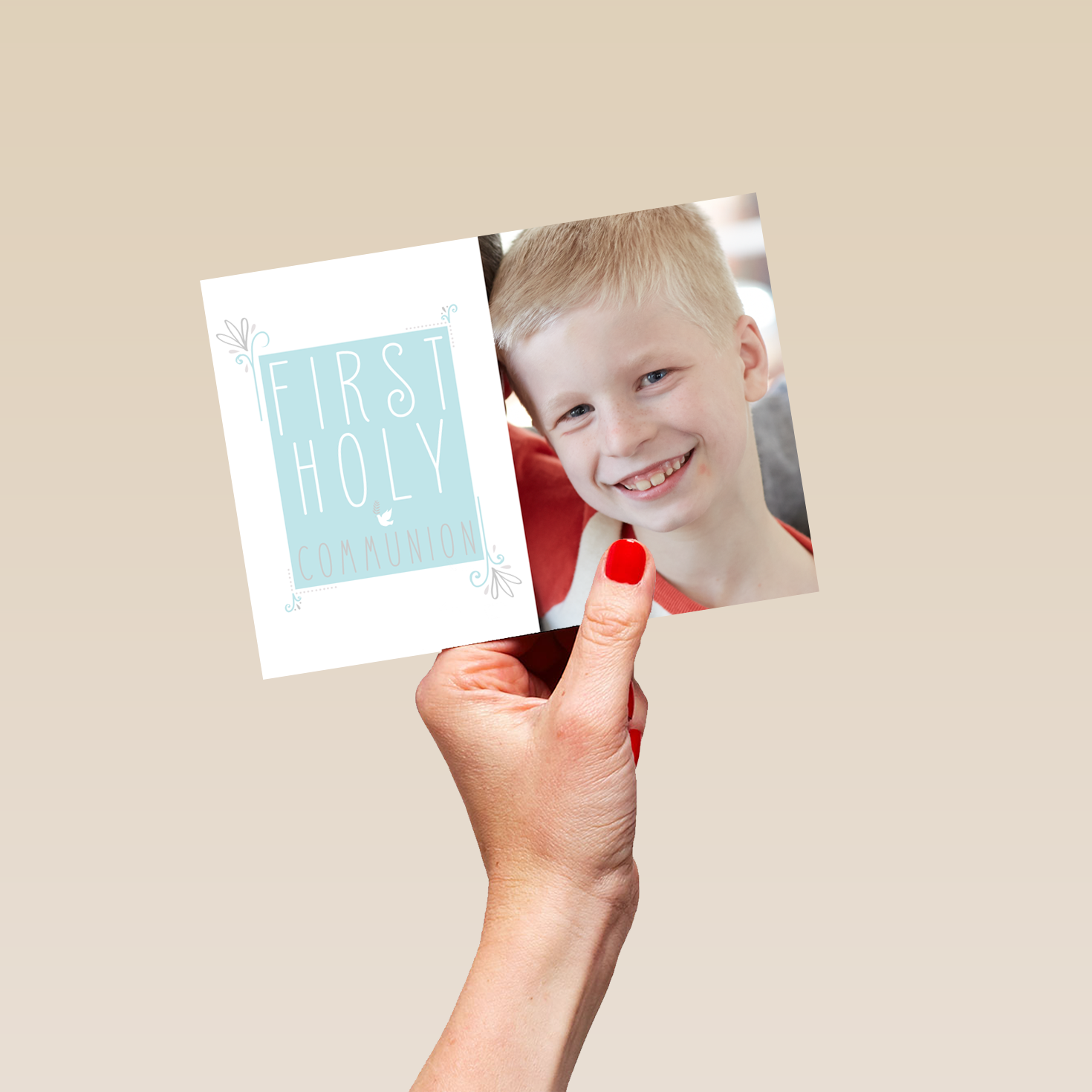 Printed on premium-quality board, this card features a simple word art design with a blue background and dove, with the message 'First Holy Communion', space to upload a photo, and comes complete with a co-ordinating white envelope.